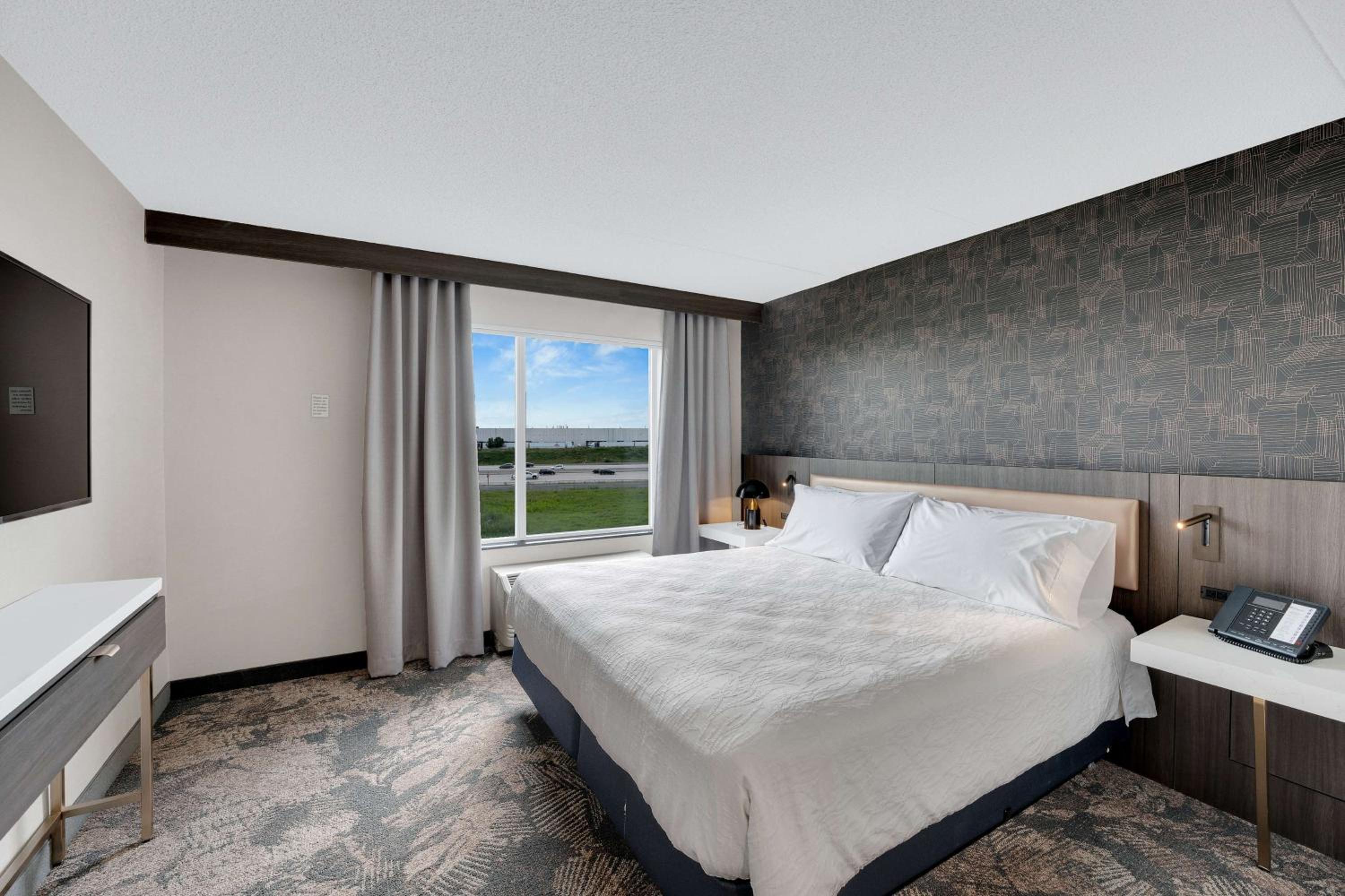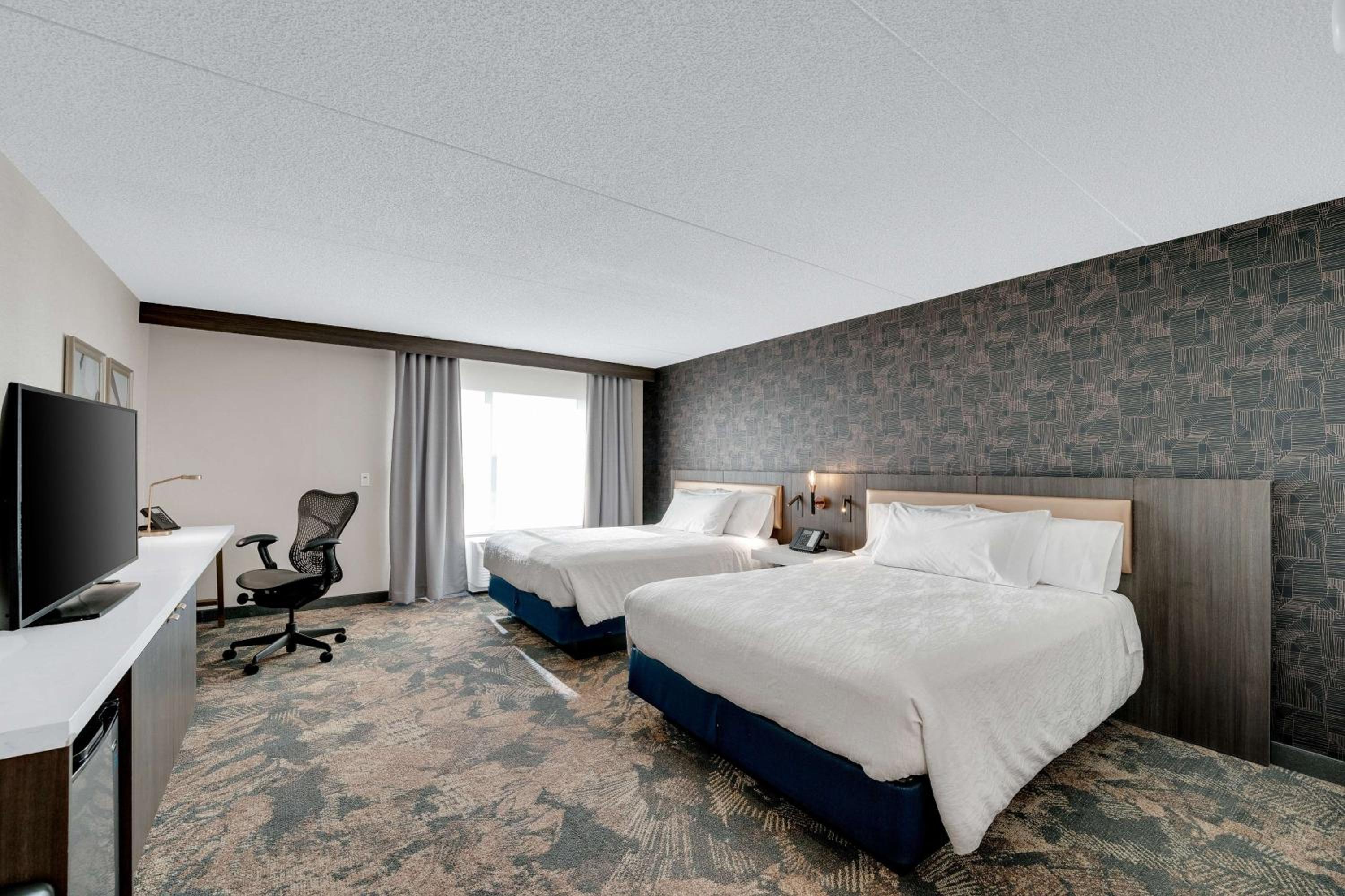 Each room at Brampton Hilton Garden Inn offers a 37-inch flat-screen TV, microwave, small fridge, and coffee maker. Enjoy the comfort of cable TV, a large work desk, and warm decor with dark wood furniture.