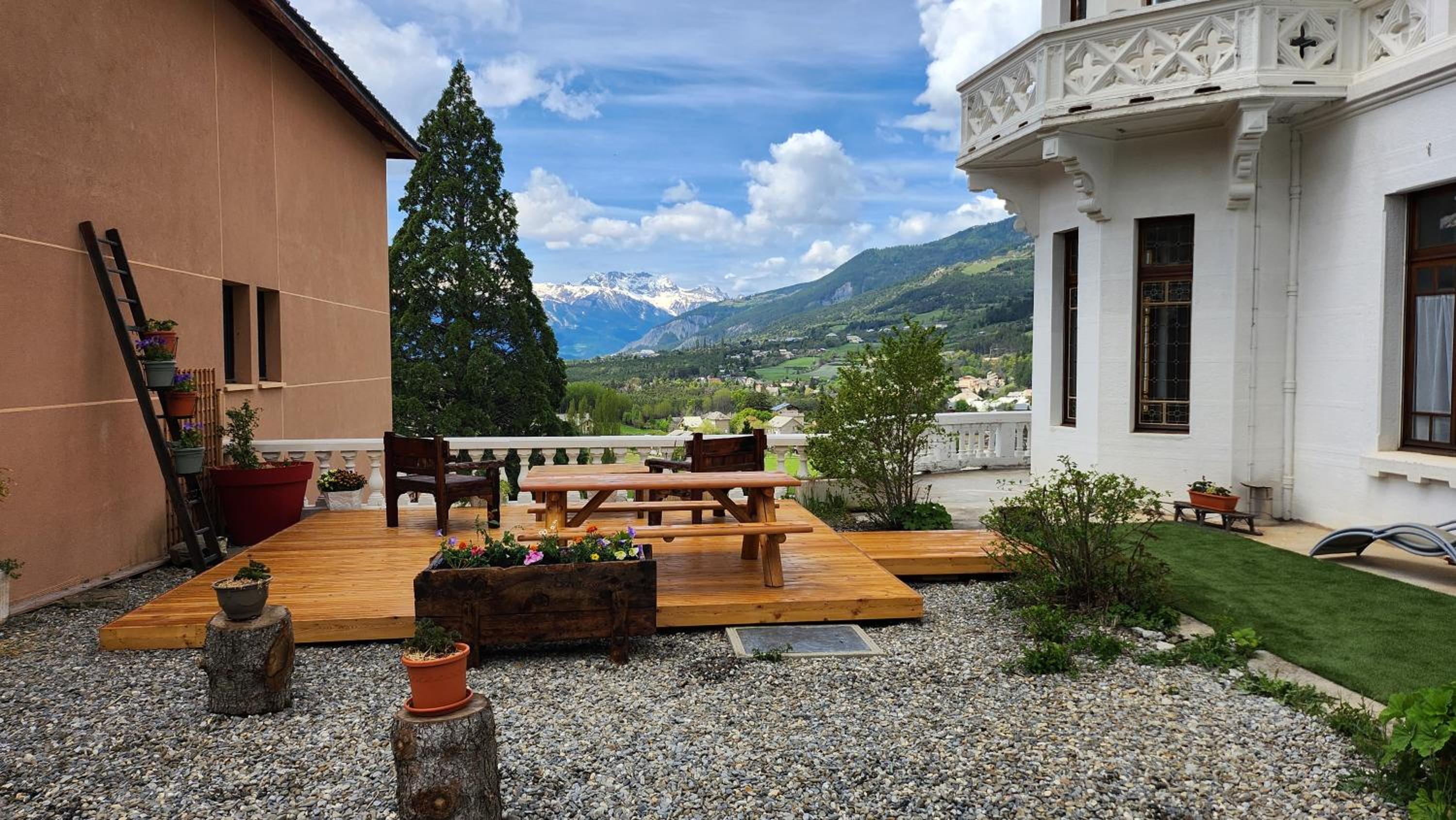 La literie, la terrasse avec la vue sur les montagnes.