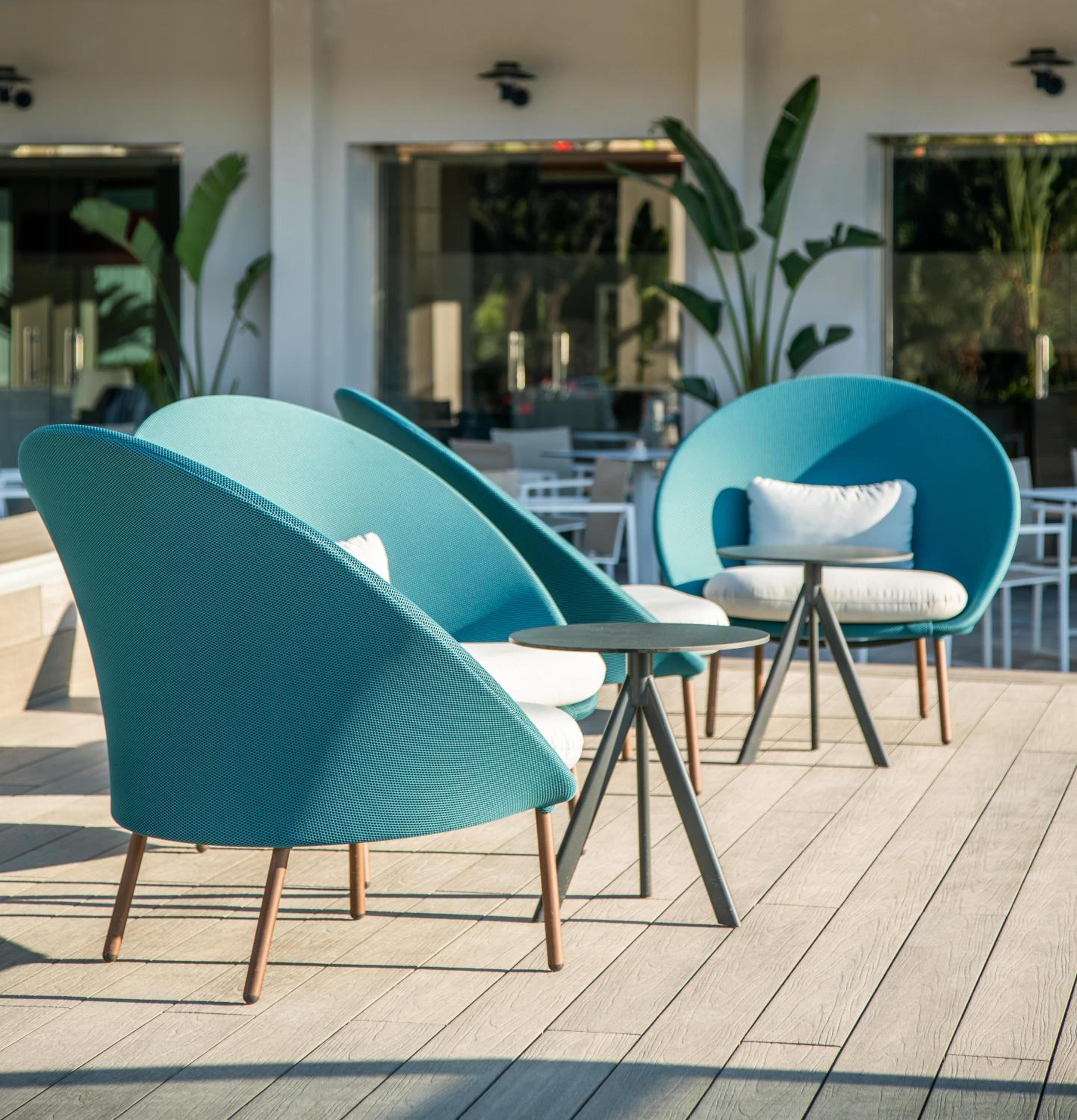 Die Tische waren im Restaurant sehr eng beieinander. Die Möbel auf der Terrasse ( Balkon)hätten gemütlicher sein können, keine Liegen.