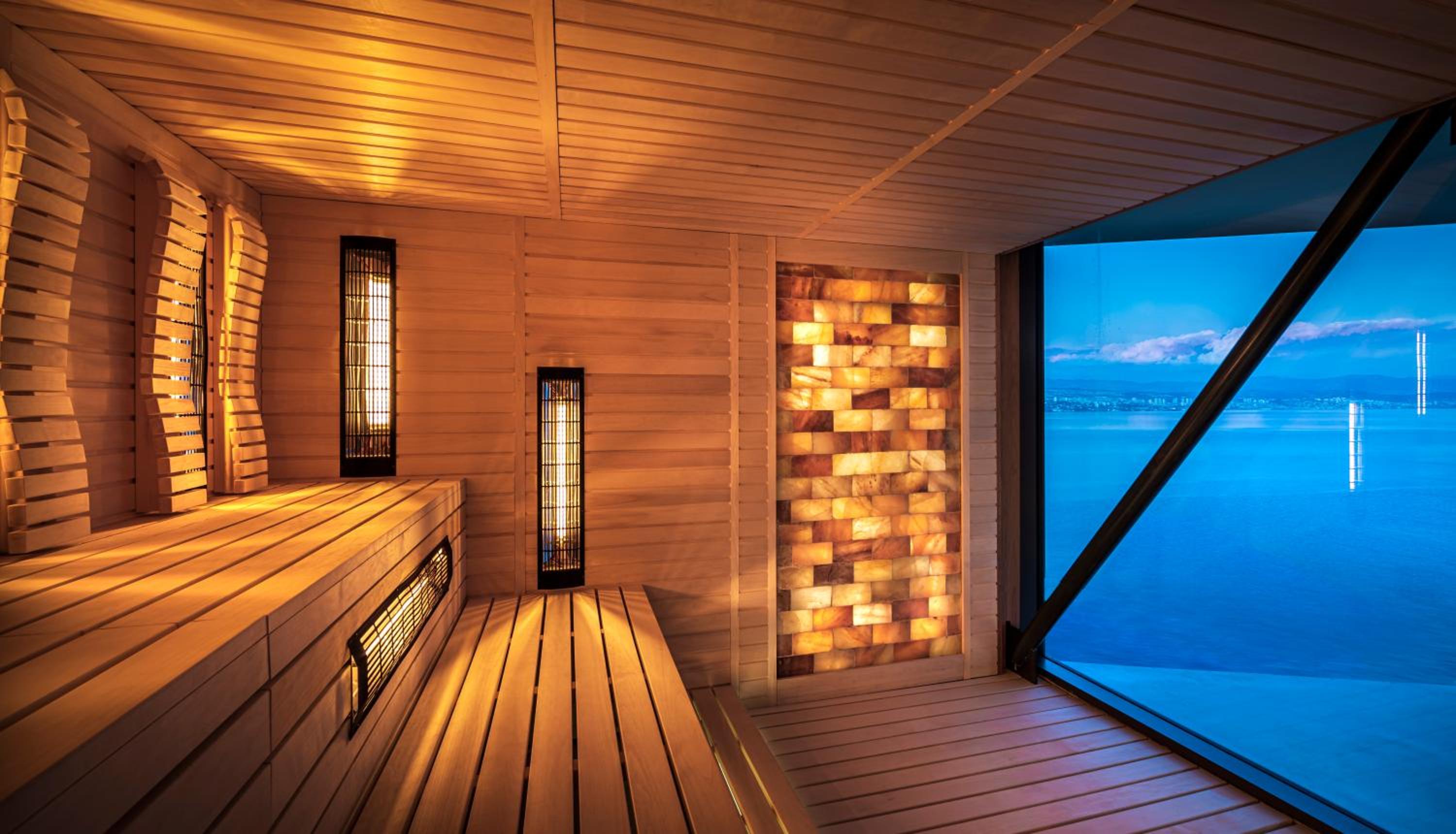 Indulge in the luxurious amenities at the hotel, including an indoor pool, a seasonal outdoor infinity pool, and an adults-only top-floor spa and wellness area with a sauna, Turkish steam bath, and hot tub overlooking the Adriatic Sea.