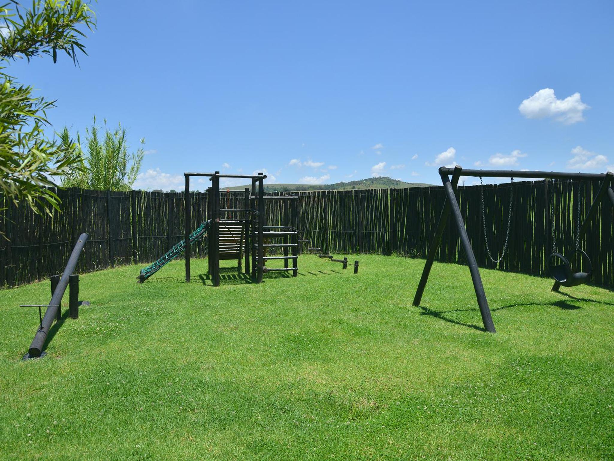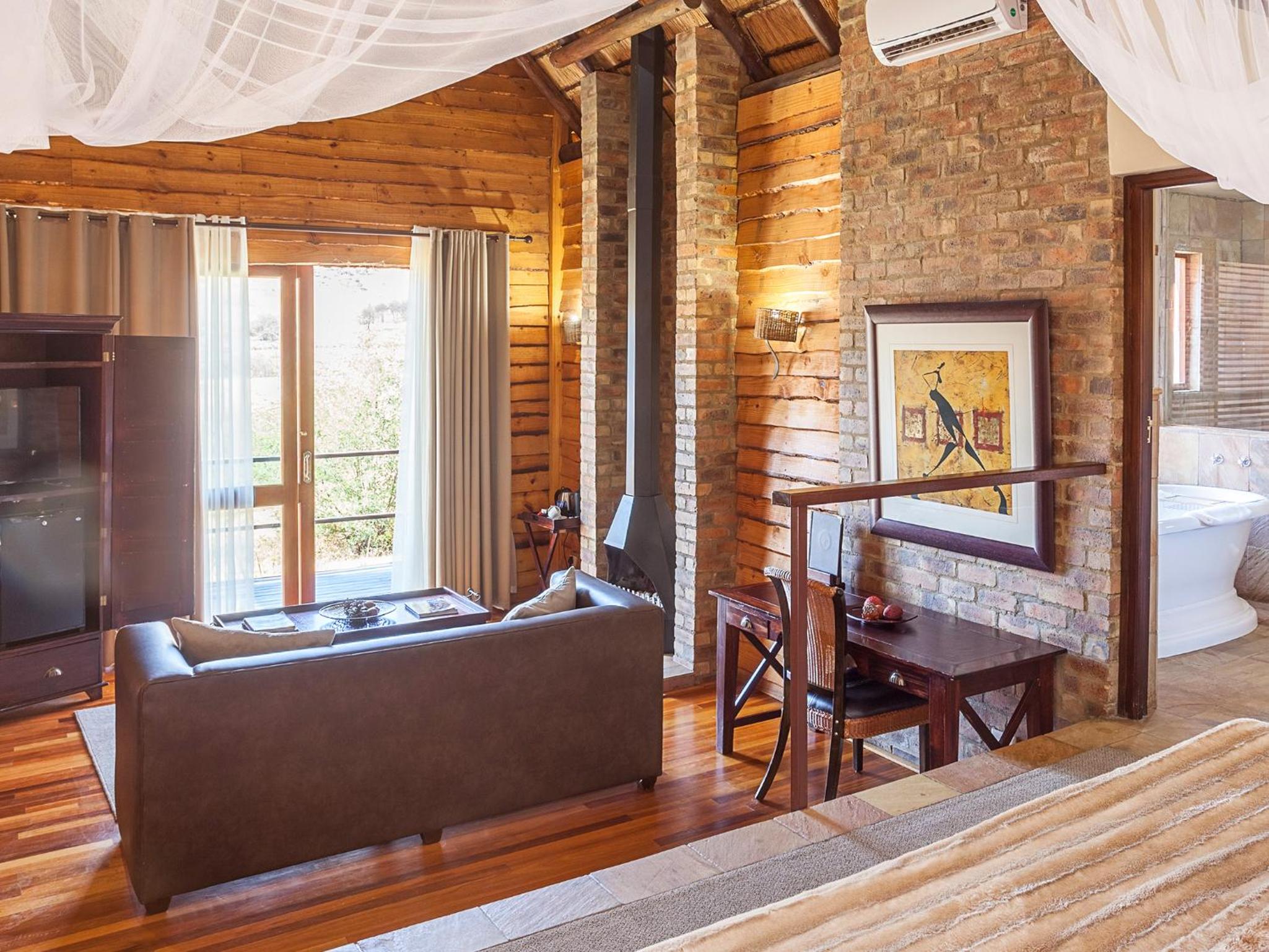 The lodge features stylish interiors with hand-cut sandstone tiles, mahogany wood, and thatched roofs. Each tastefully furnished suite offers spacious living areas, private patios with stunning views of the Zwartkops mountain range, and luxurious bathrooms with separate tubs and showers.