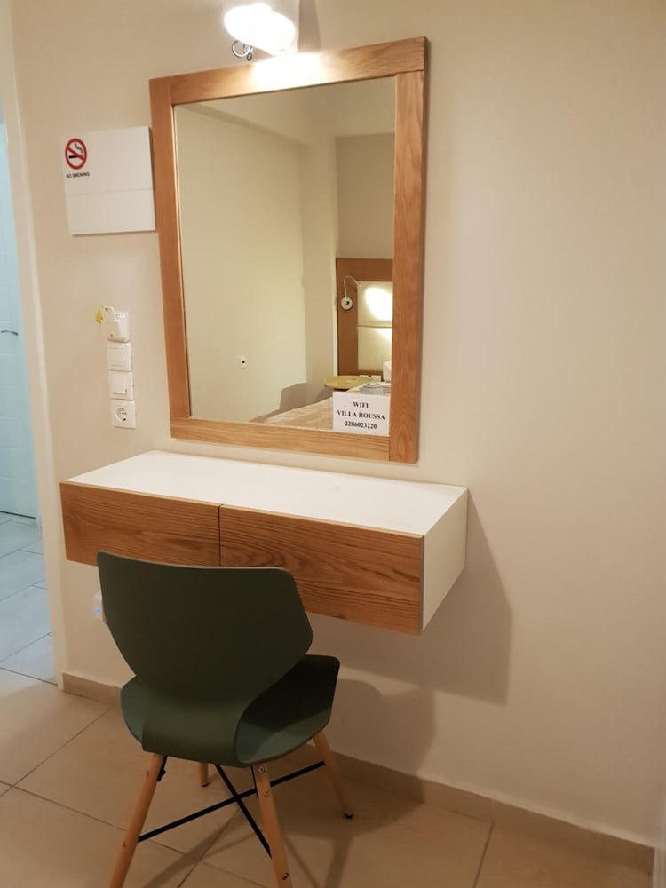 The Villa Roussa was perfect for my short stay in Santorini. It is located just behind the bus station (2 min walk), which is incredibly convenient (and the reason I booked the hotel). The bus is easy to catch to and from the airport and Oia, for only €1.60 cash (no card). The building was hard to find, as it is in a side street, but I called the property manager when I arrived and he met me and showed me the way. After delayed/missed flights, he was very accommodating, ensuring he met my check in time when I finally arrived at 10pm. The main street was still buzzing, and I felt safe, as an alert single female, going to get dinner when I arrived. The building is a bit dated, but it’s fine if you’re not fussy. Bed and pillows were very comfortable. Air conditioning was a great to get relief from the Santorini heat. Would definitely stay here again.
