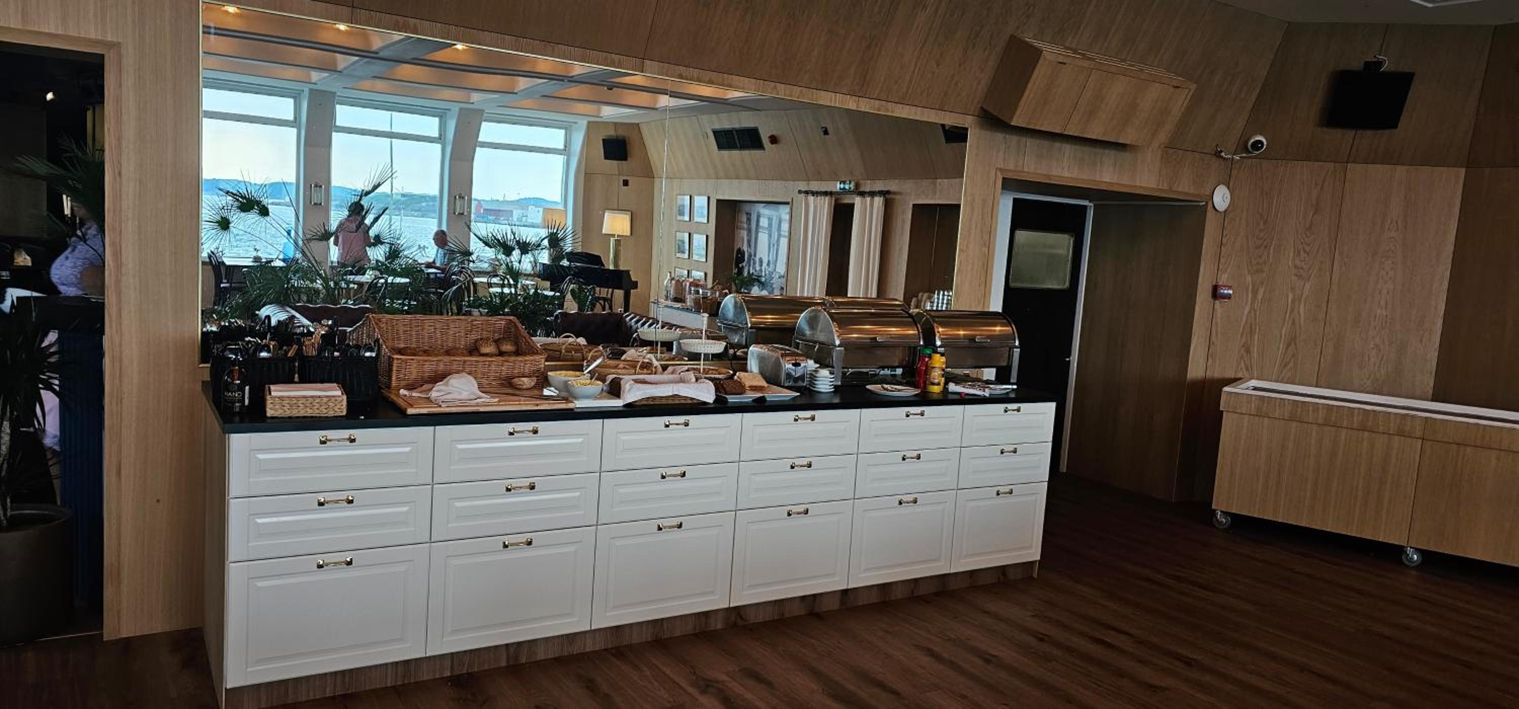 Breakfast, and dining room with a view of the harbour