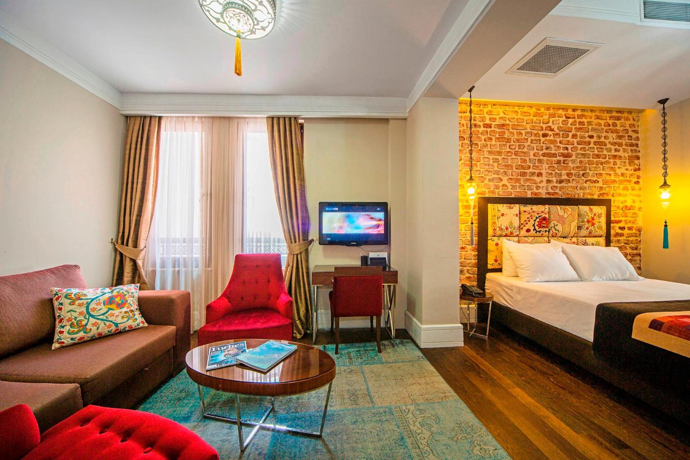 The stylish rooms at Azade feature vibrant colored furniture against white brick walls, with amenities including Nespresso machines, LCD TVs, and spacious seating areas. Guests can also unwind on the rooftop terrace with breathtaking panoramic views.