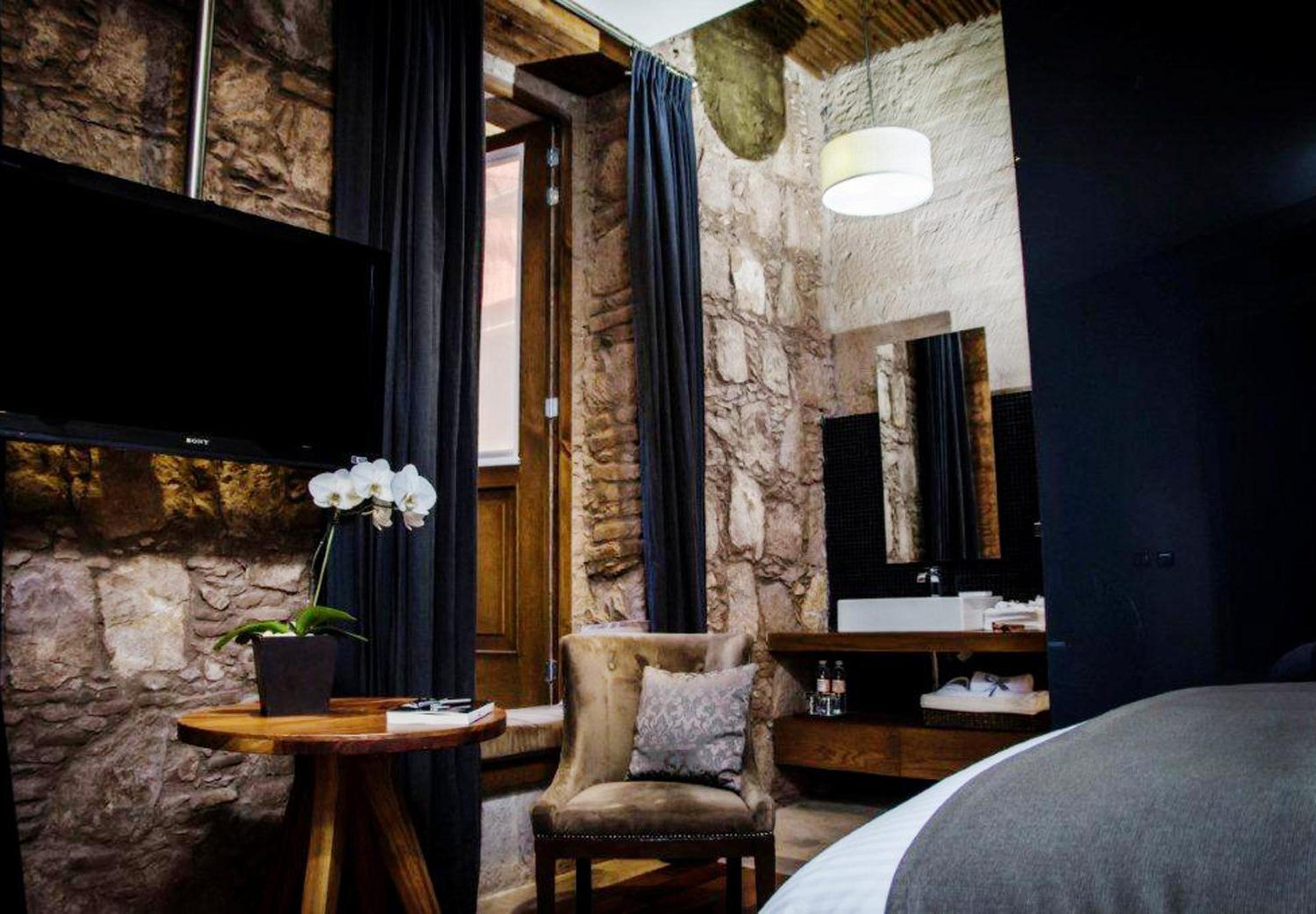 Historic Elegance: Step into a 19th-century colonial house with cantera-tile floors, where each air-conditioned room surrounds a tranquil patio, offering modern amenities alongside classic hardwood floors and a flat-screen TV.