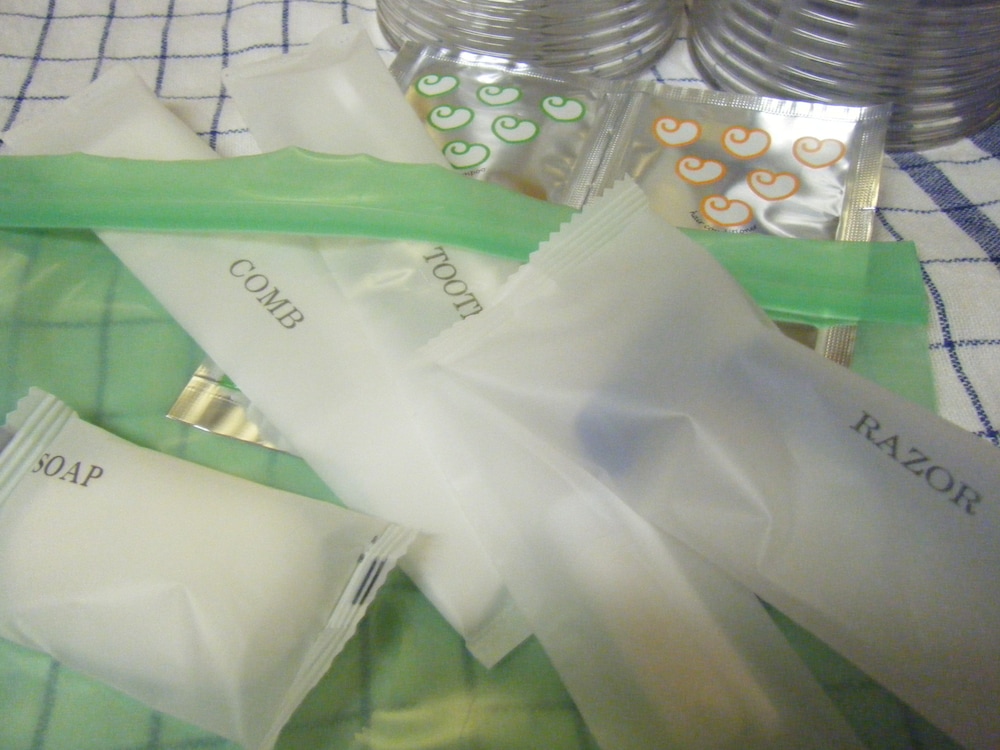 I got small bag with tiny tooth brush,paste, soap and one time use shampoo and conditioner when I