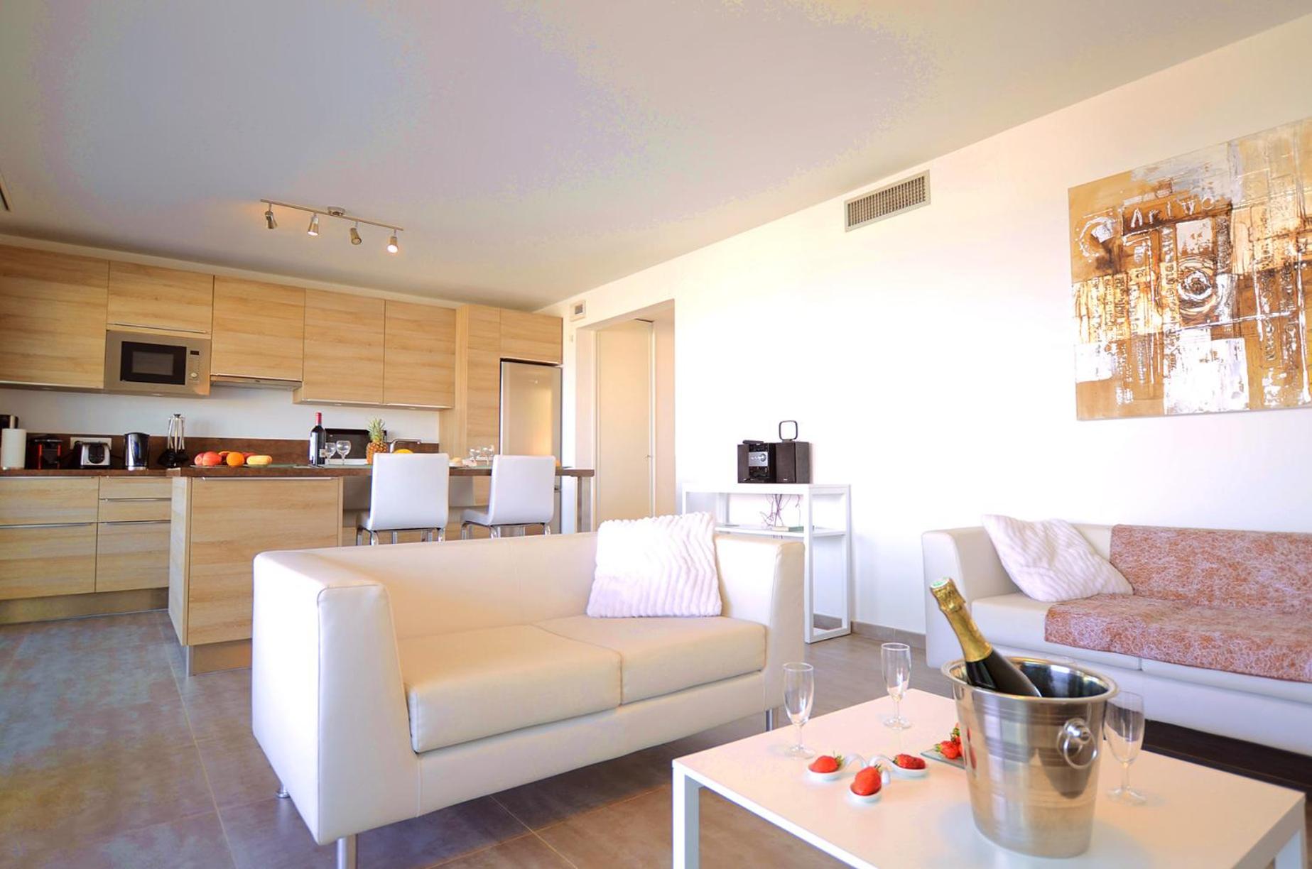 Well appointed, modern and immaculately clean apartment The view from our first floor balcony provided a therapeutic and magnificent view of the Med. Beds were comfortable and both bathrooms were restocked (generously) every day.