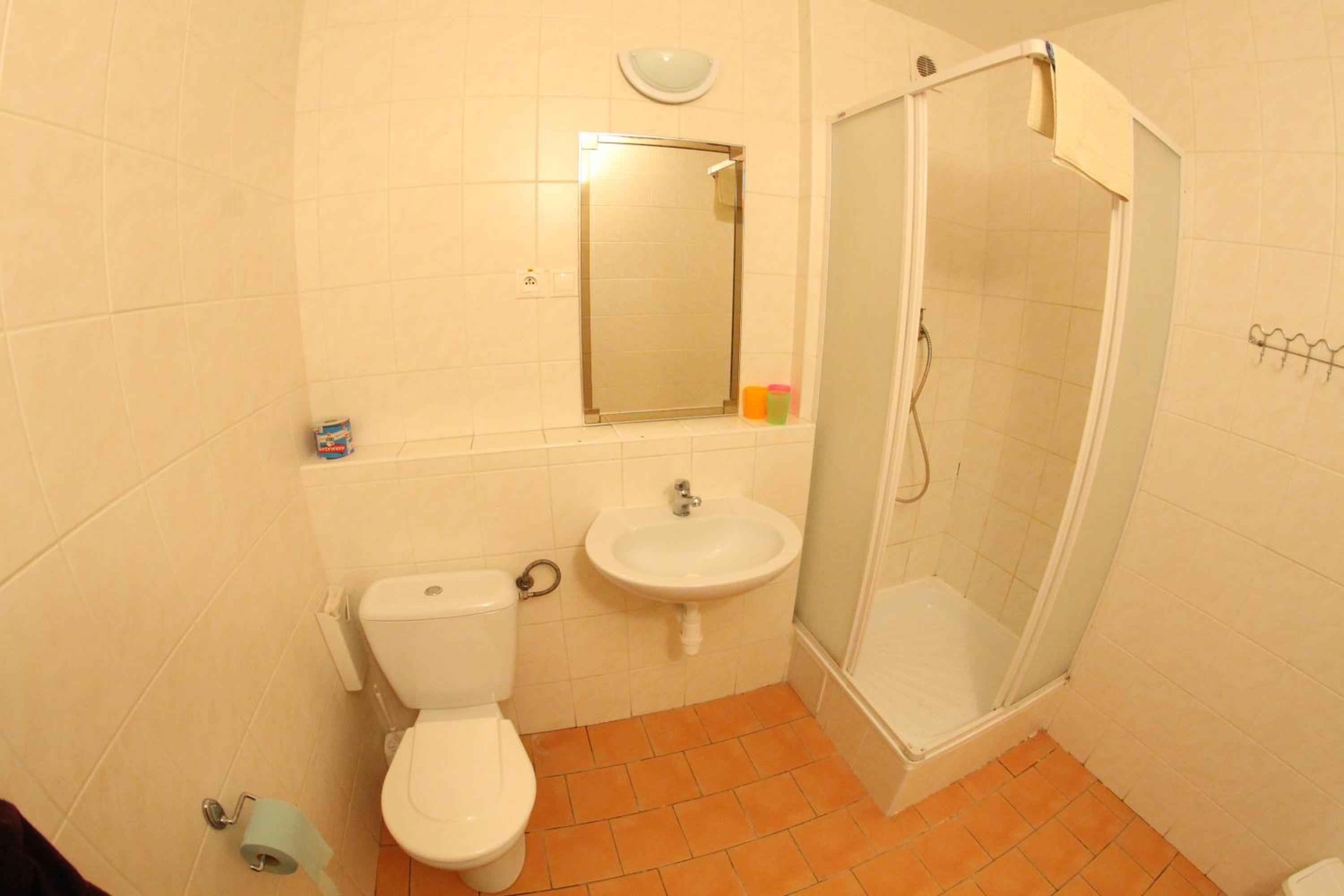 Bohužel koberec, stěny, strop a závěsy měly na několika místech skvrny. Sprcha by také potřebovala pořádně vydrhnout a sprchová hlavice zbavit vodního kamene.