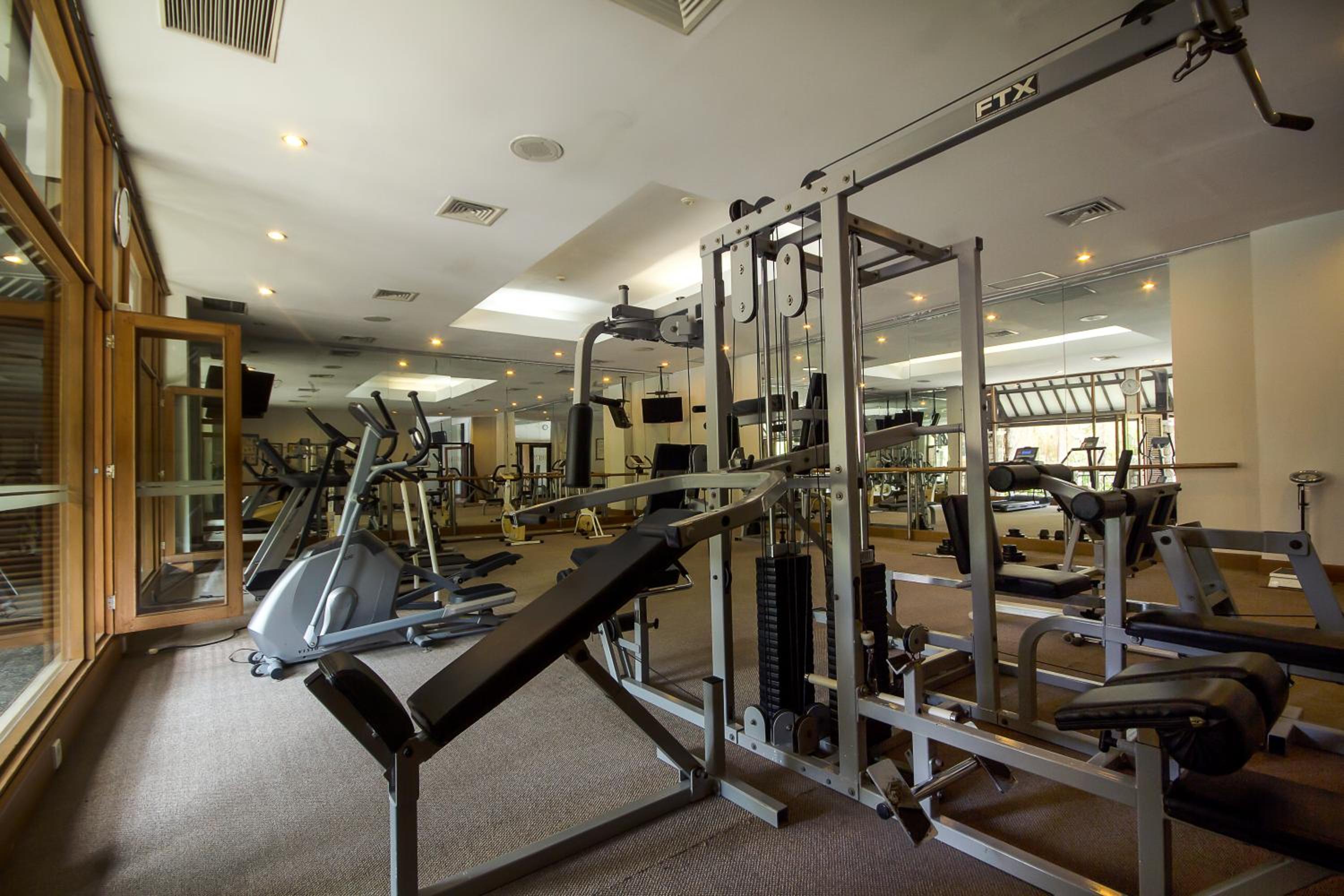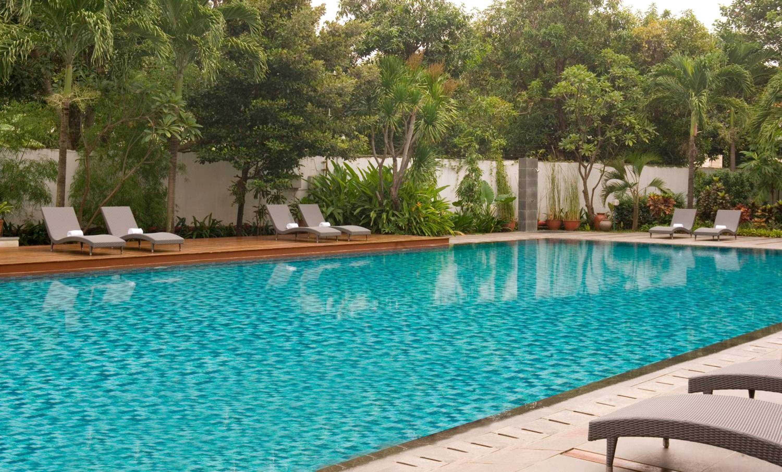 Enjoy a refreshing dip in the large outdoor pool or stay active at the well-equipped fitness center. Take in views of lush greenery while working out, and unwind in the sauna or by the pool on sun loungers.