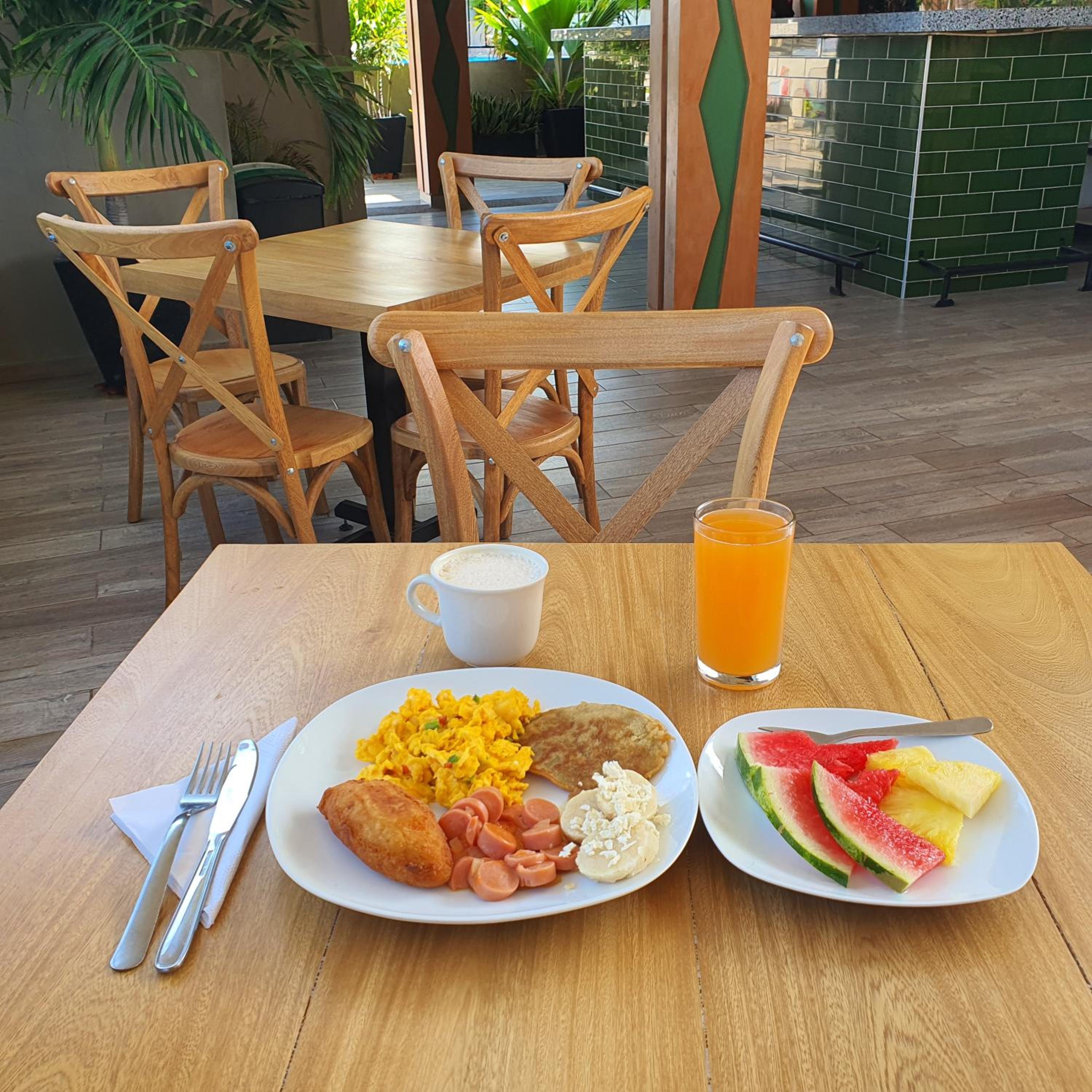El desayuno muy rico y la piscina muy bonita