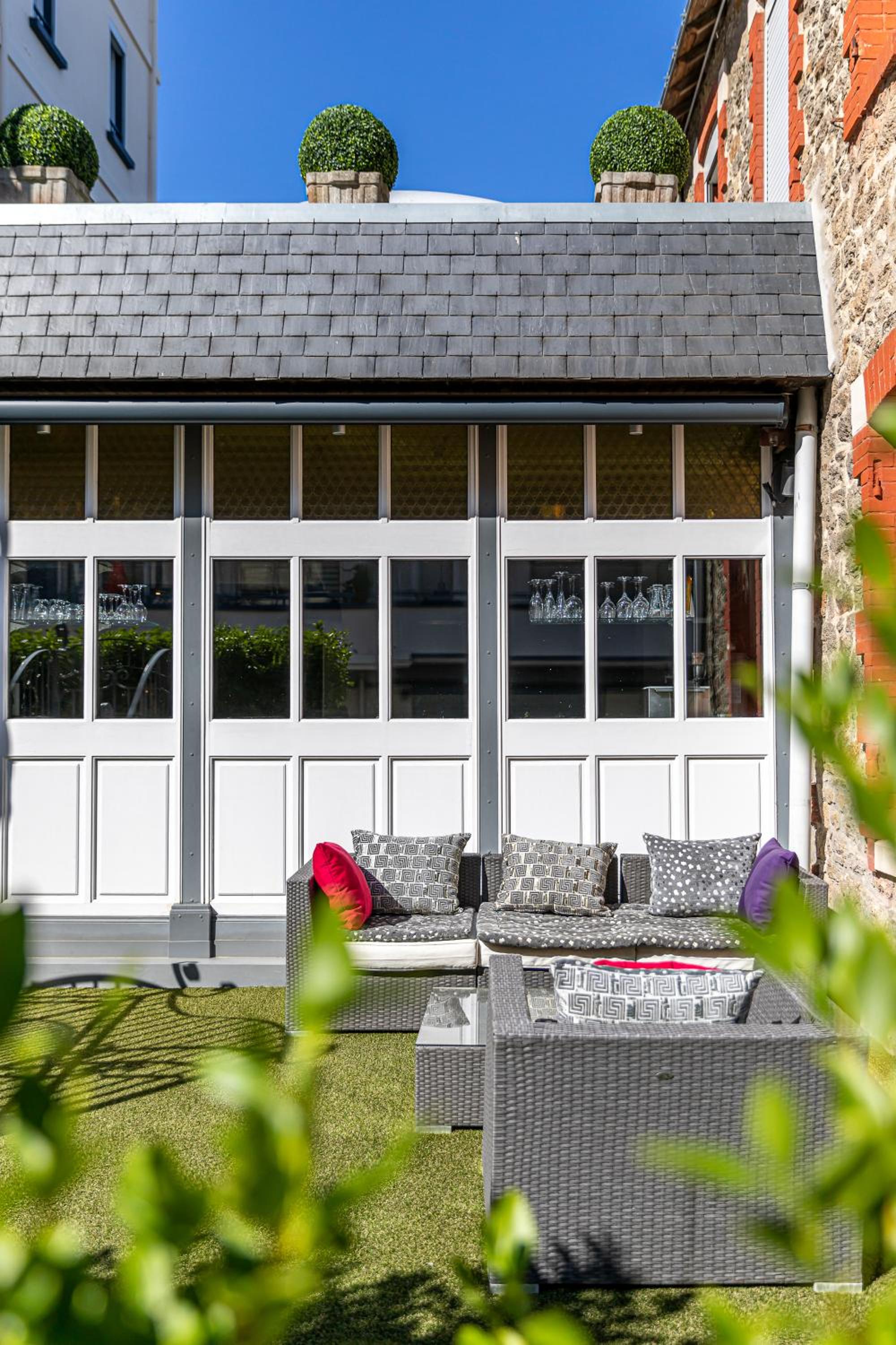 Charming Outdoor Terrace - Guests can unwind on the flowered outdoor terrace, an ideal spot for enjoying breakfast or a refreshing drink from the bar during the summer months.