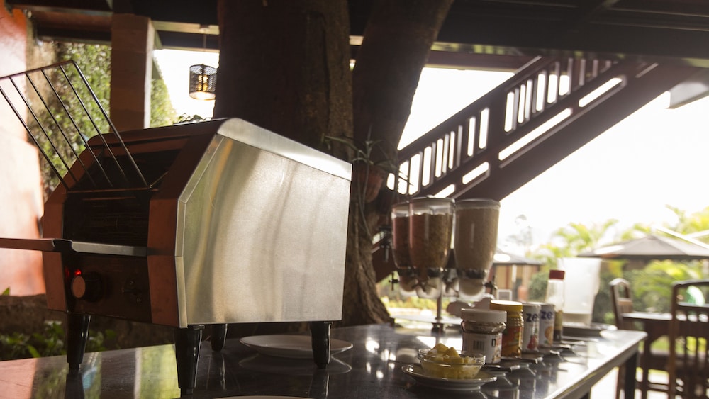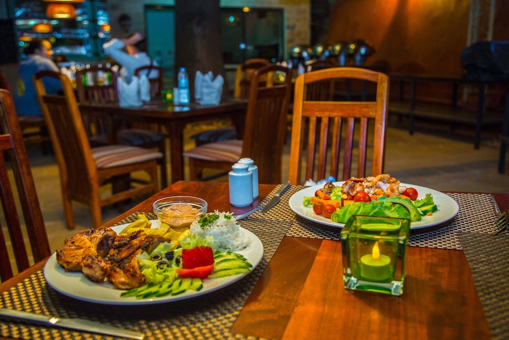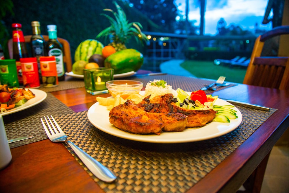We were offered a complimentary dinner but found the outdoor dining area was not lit. We had to use a flashlight and other guests were using their mobile phones to read the menu. We waited a long time for our food only to find it was poorly cooked. On a good note - the single server was helpful, moving us indoors to the lounge when a thuderstorm threatened.