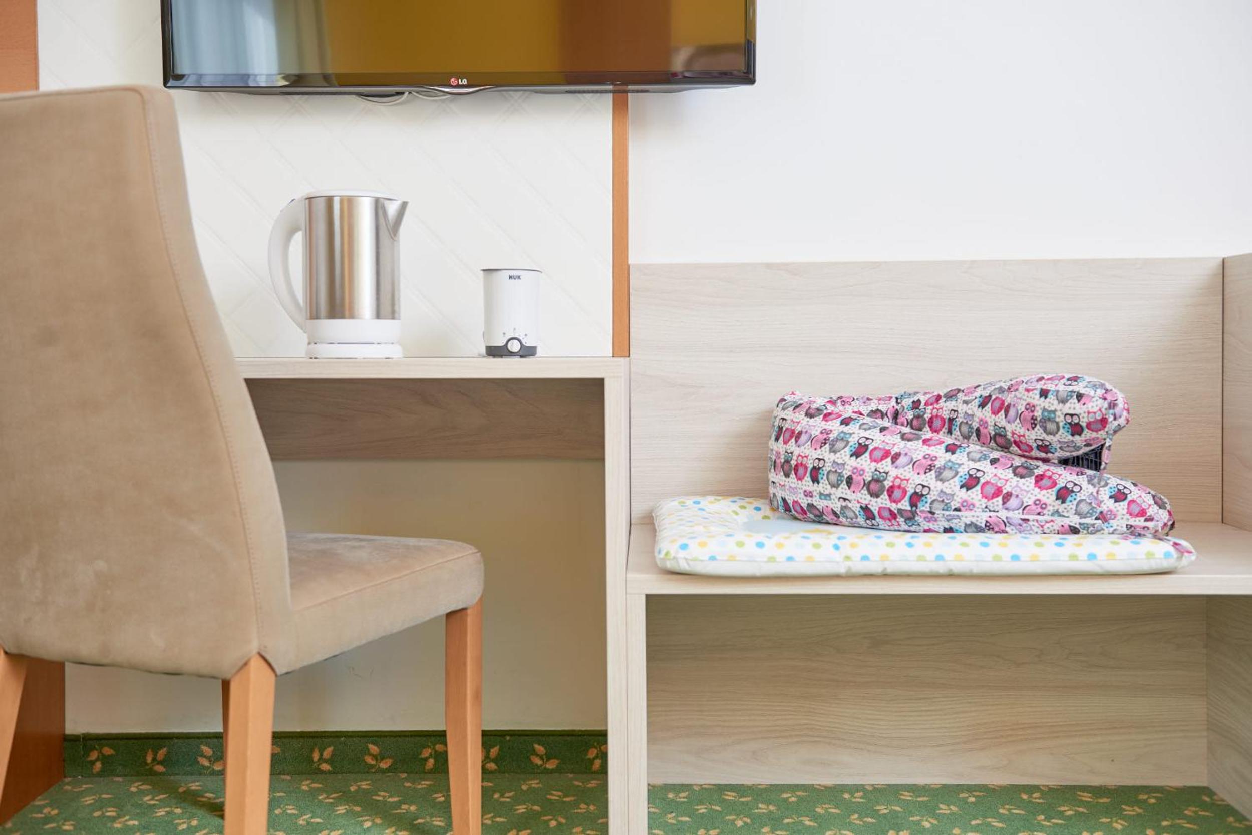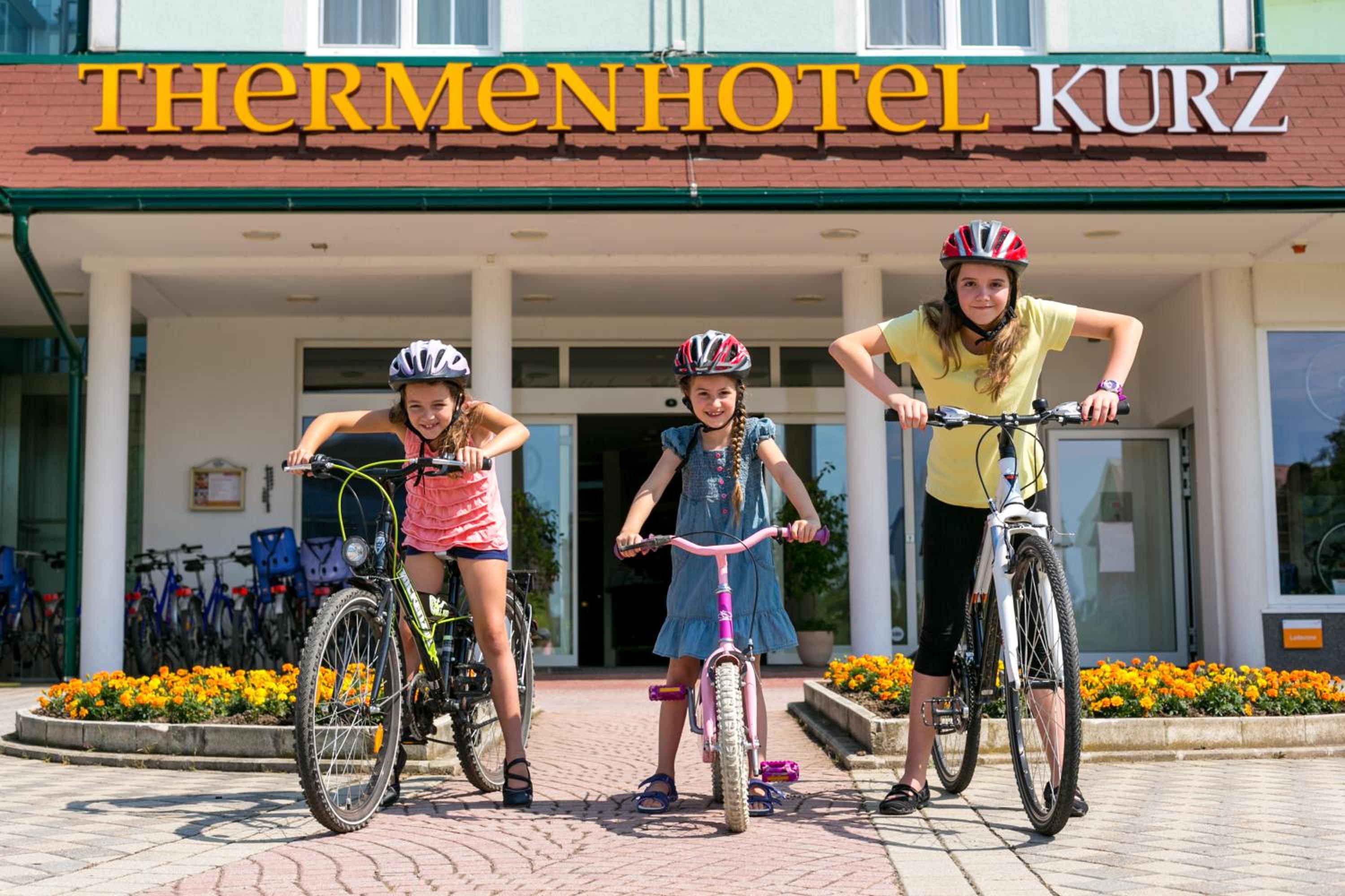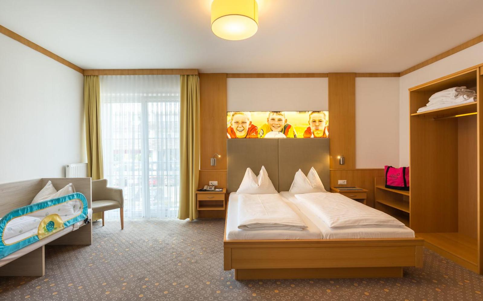 Super Hotel, vorallem die große (ehemalige Tennis-)Halle mit vielen Möglichkeiten für Babies und Kinder zum Spielen (Bällebad, Hupfburg, Klettergerüst, Arcade-Spiele, Trampolin, ...). Unterirdischer Gang zur Therme. Hotel und Spiele-Halle ist sehr sauber gehalten, im Zimmer gibt es auf Wunsch alle nötigen Utensilien (Wasserkocher, Babyflaschen-Wärmer, ...) für Babies. Einrichtung und Deko ist jetzt nicht super modern, aber sauber und gepflegt.