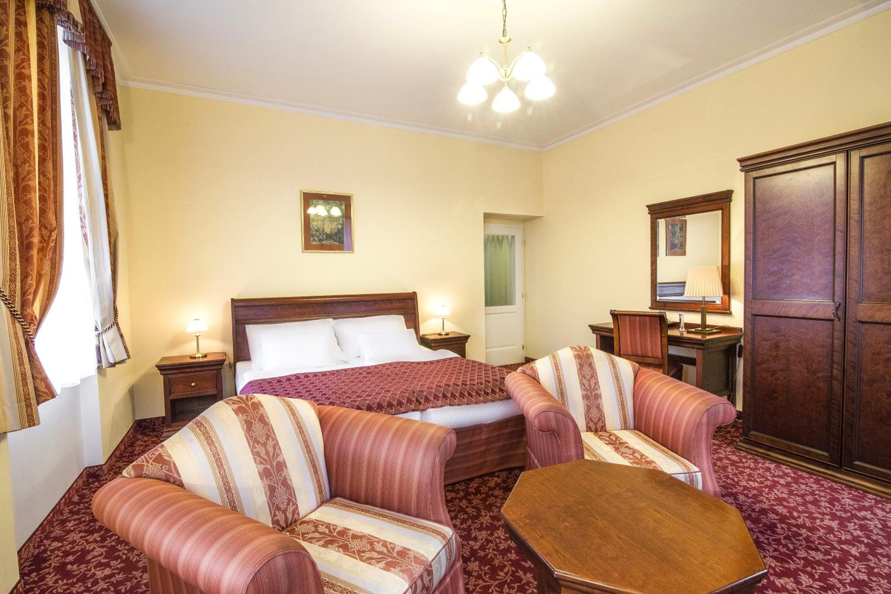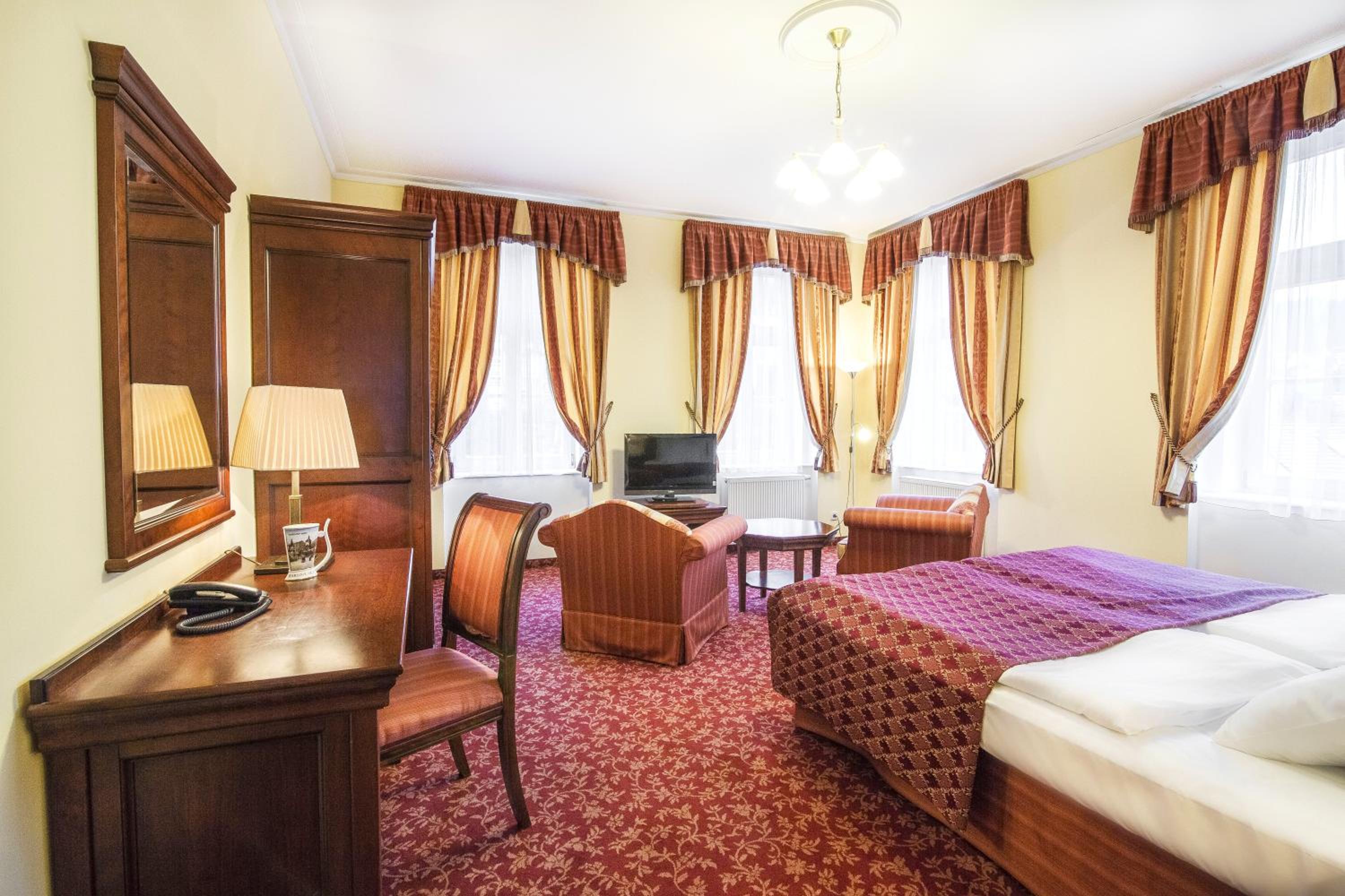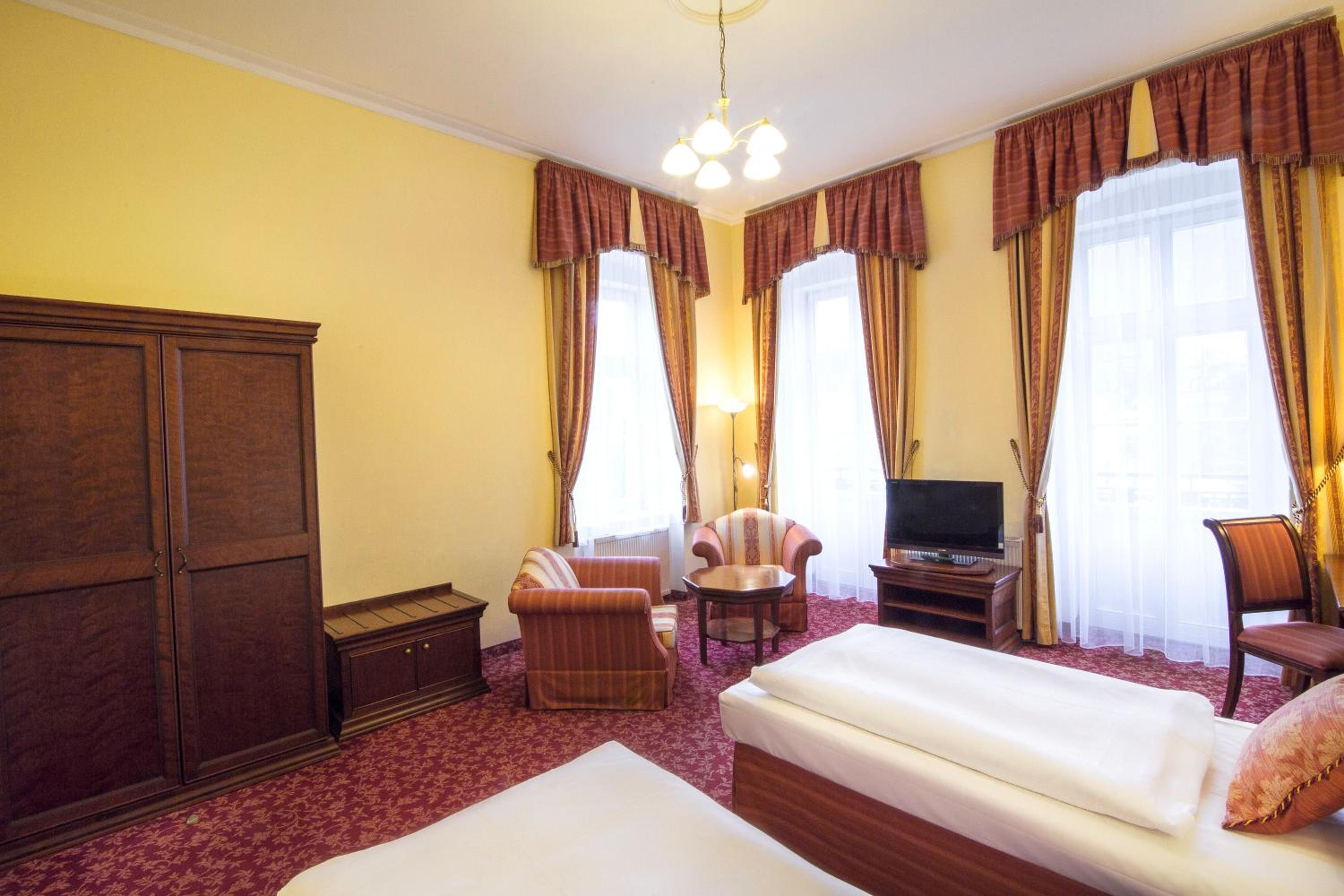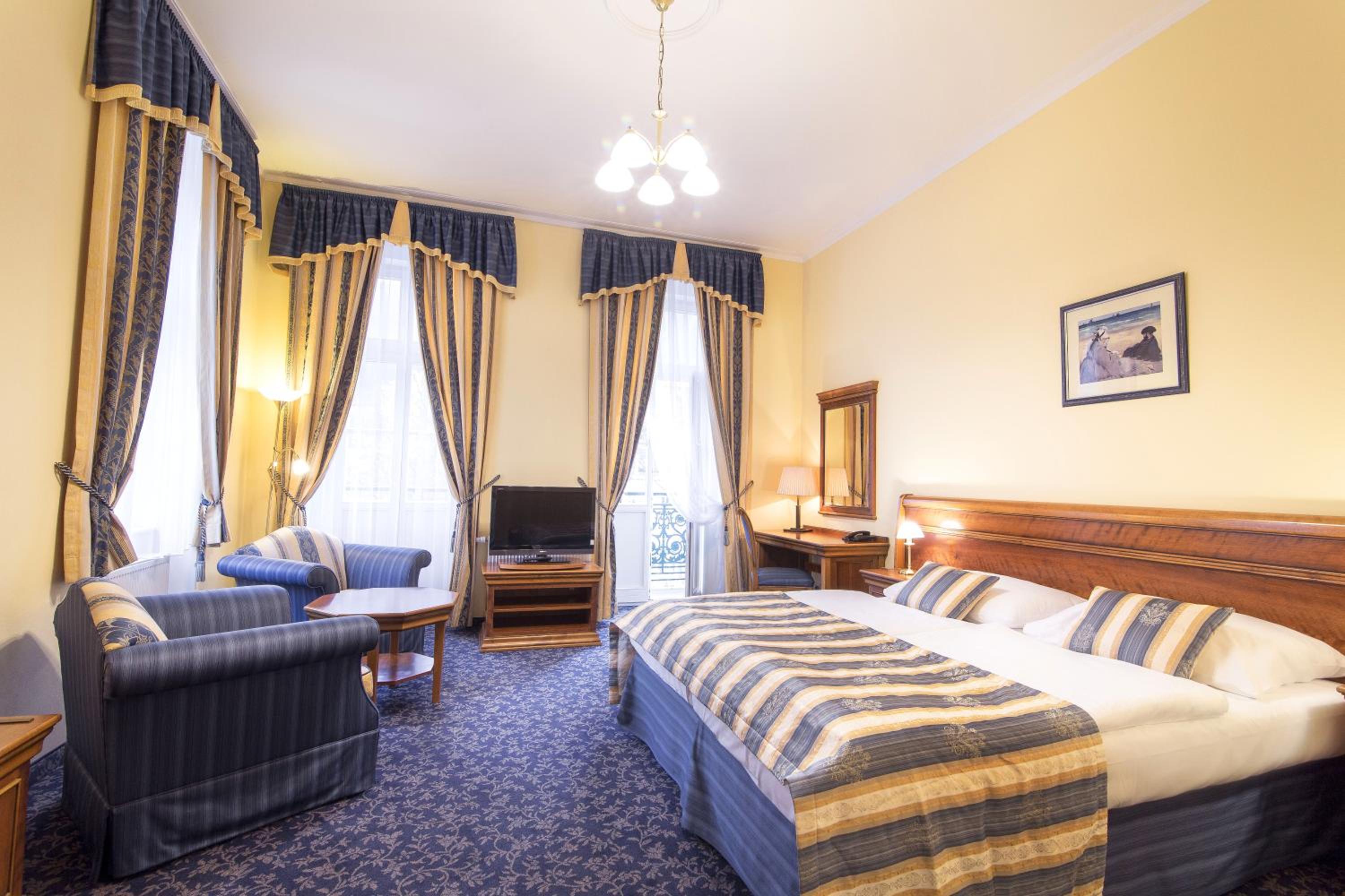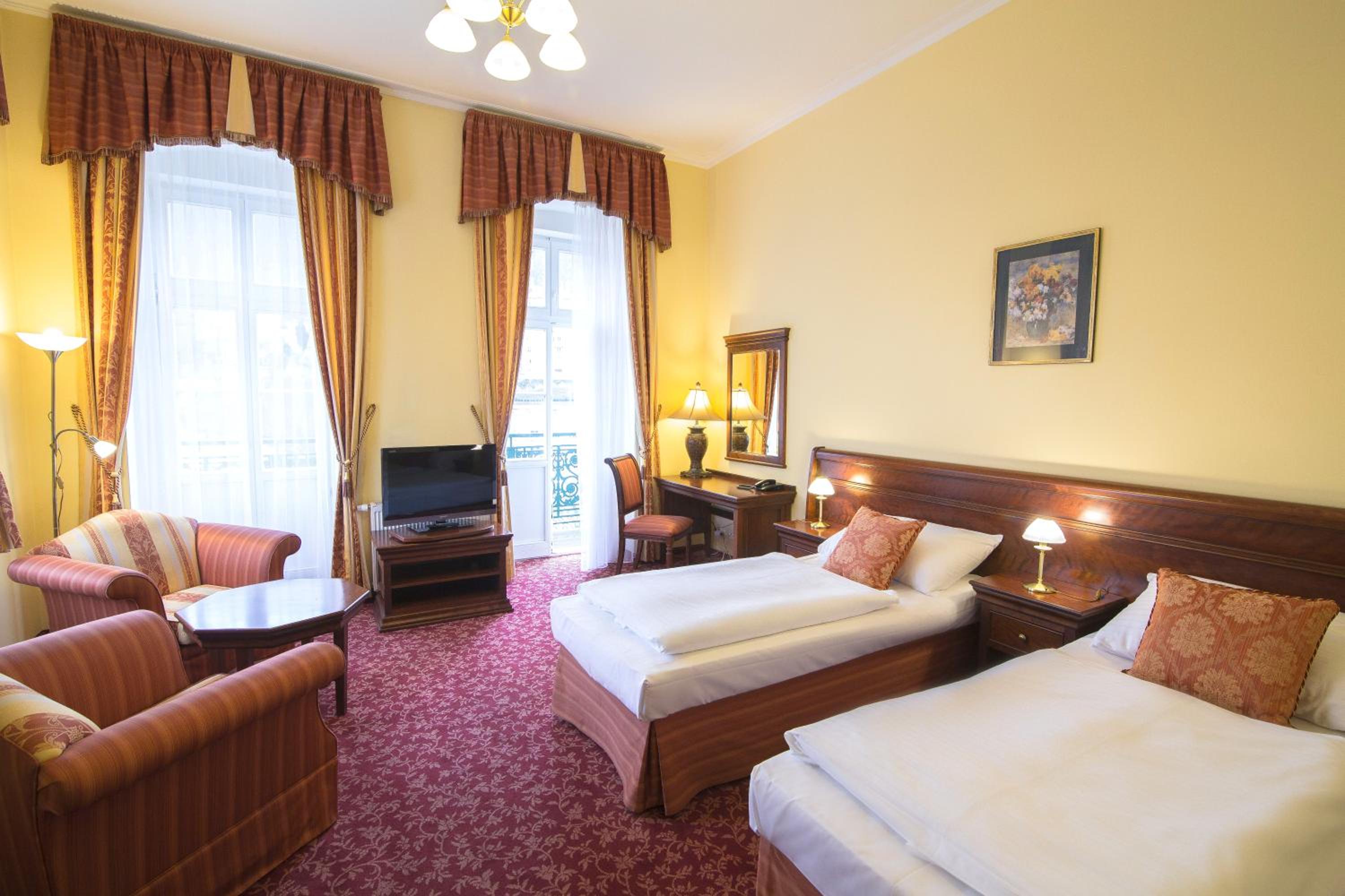 Experience the historic charm of the three-and-a-half-star Hotel Ontario, with a 150-year tradition overlooking the famous Mill Colonnade in the heart of Karlovy Vary. Wake up to spectacular views of the city or lush greenery from every room. Enjoy the convenience of spacious accommodations equipped with a seating area, flat-screen TV, wardrobe, fridge, and kettle. Benefit from a camera-guarded private car park and pet-friendly policy. Indulge in a buffet breakfast and explore nearby restaurants, cafes, mineral springs, and spas just steps away. Book now for a memorable stay at Hotel Ontario.