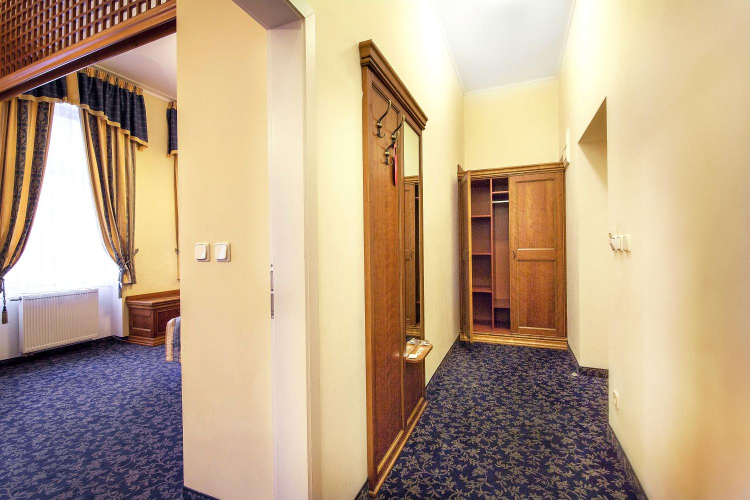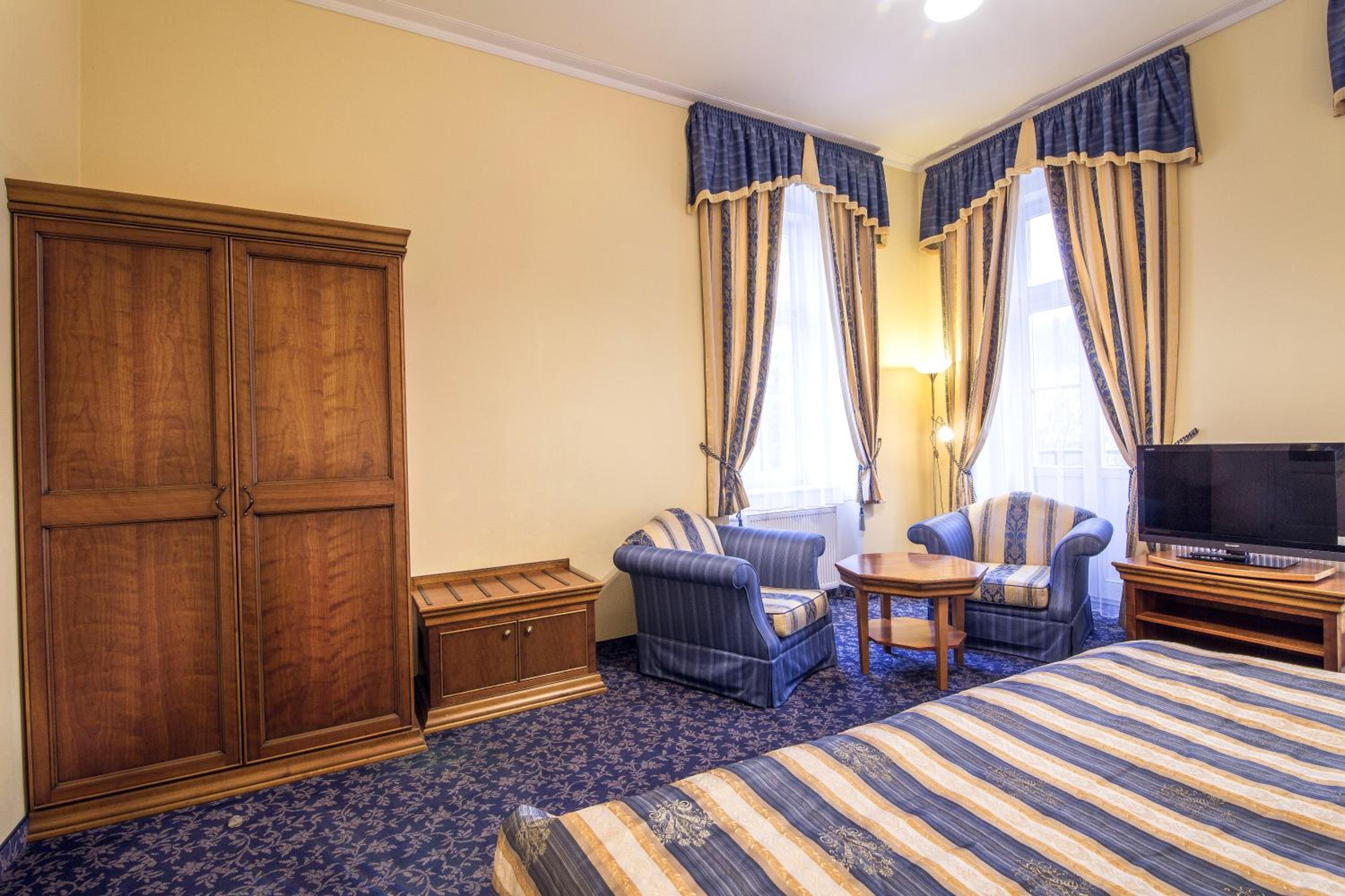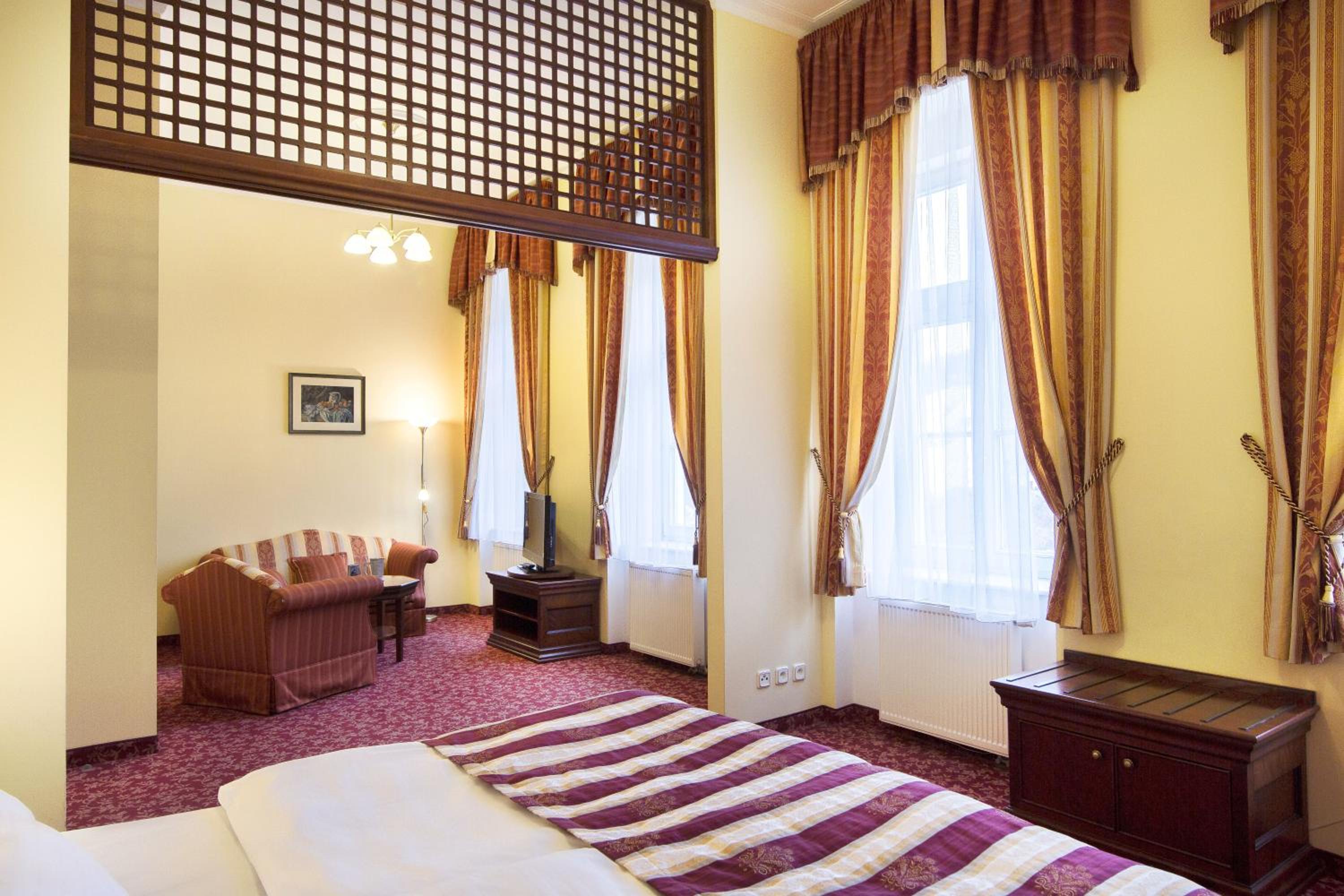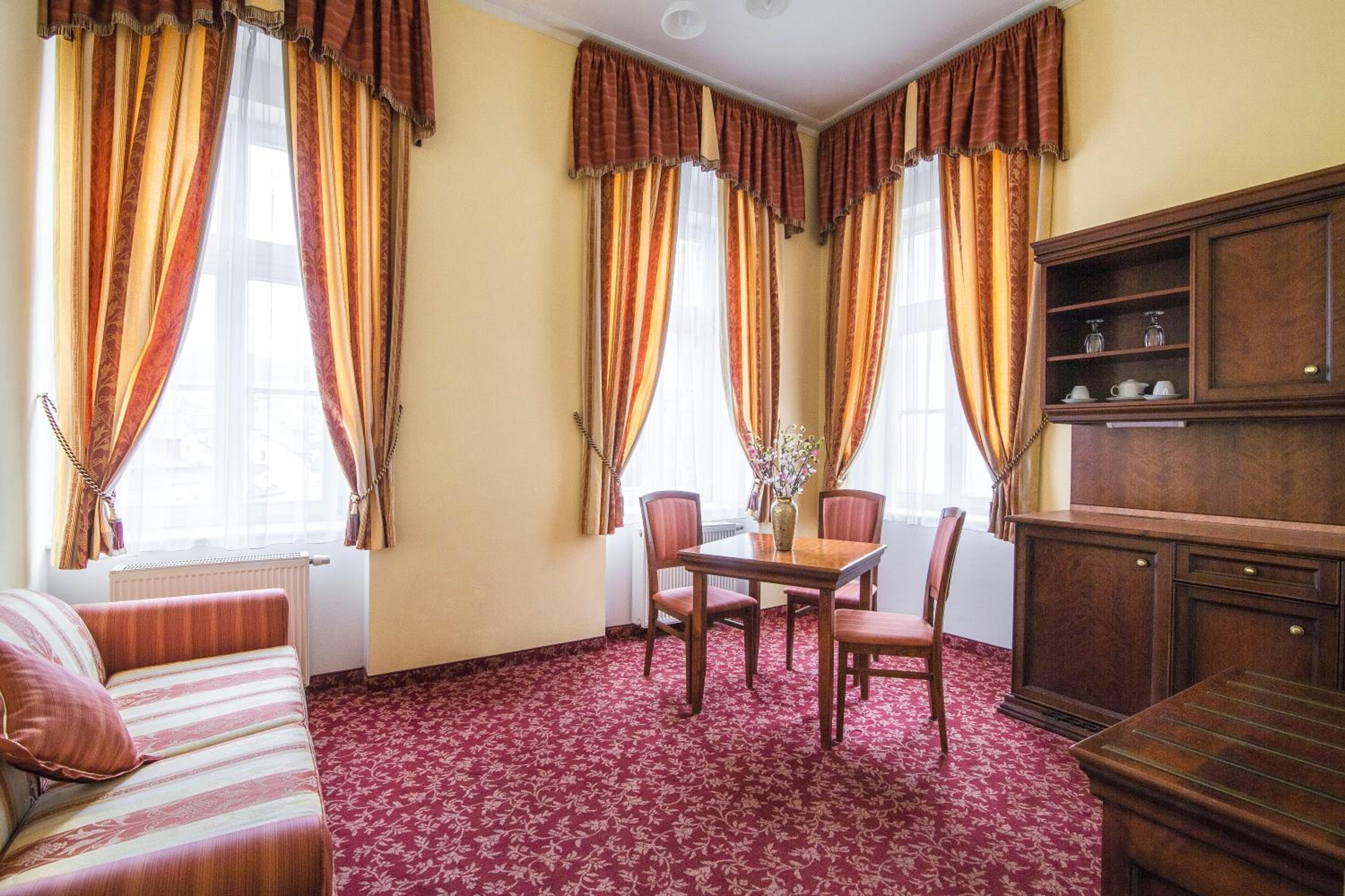Experience the historic charm of the three-and-a-half-star Hotel Ontario, with a 150-year tradition overlooking the famous Mill Colonnade in the heart of Karlovy Vary. Wake up to spectacular views of the city or lush greenery from every room. Enjoy the convenience of spacious accommodations equipped with a seating area, flat-screen TV, wardrobe, fridge, and kettle. Benefit from a camera-guarded private car park and pet-friendly policy. Indulge in a buffet breakfast and explore nearby restaurants, cafes, mineral springs, and spas just steps away. Book now for a memorable stay at Hotel Ontario.
