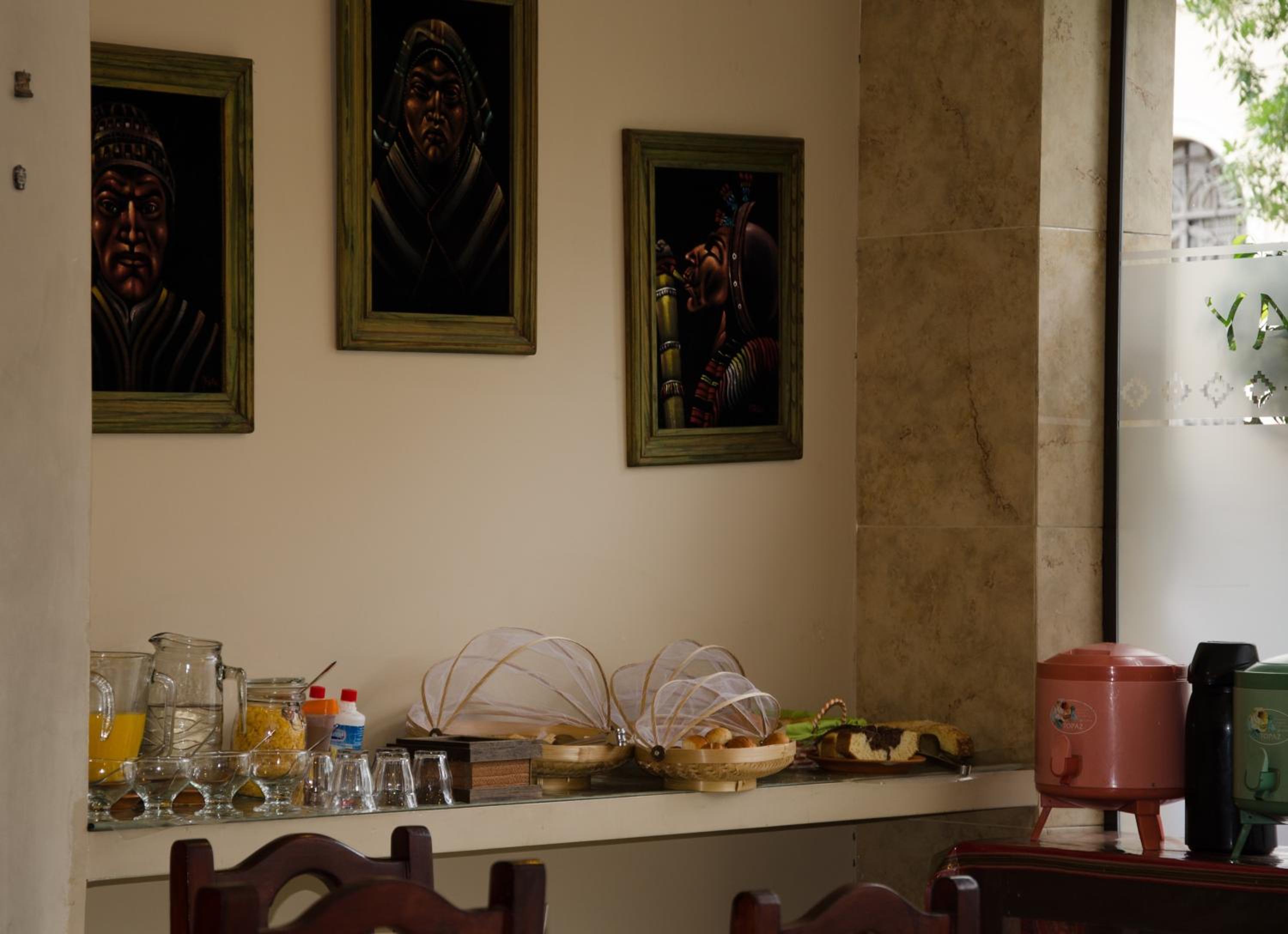 Start your day with a delicious continental breakfast at the bar, surrounded by a flat-screen TV, a decorative stone wall, and vibrant local art crafts, offering a true taste of the region.