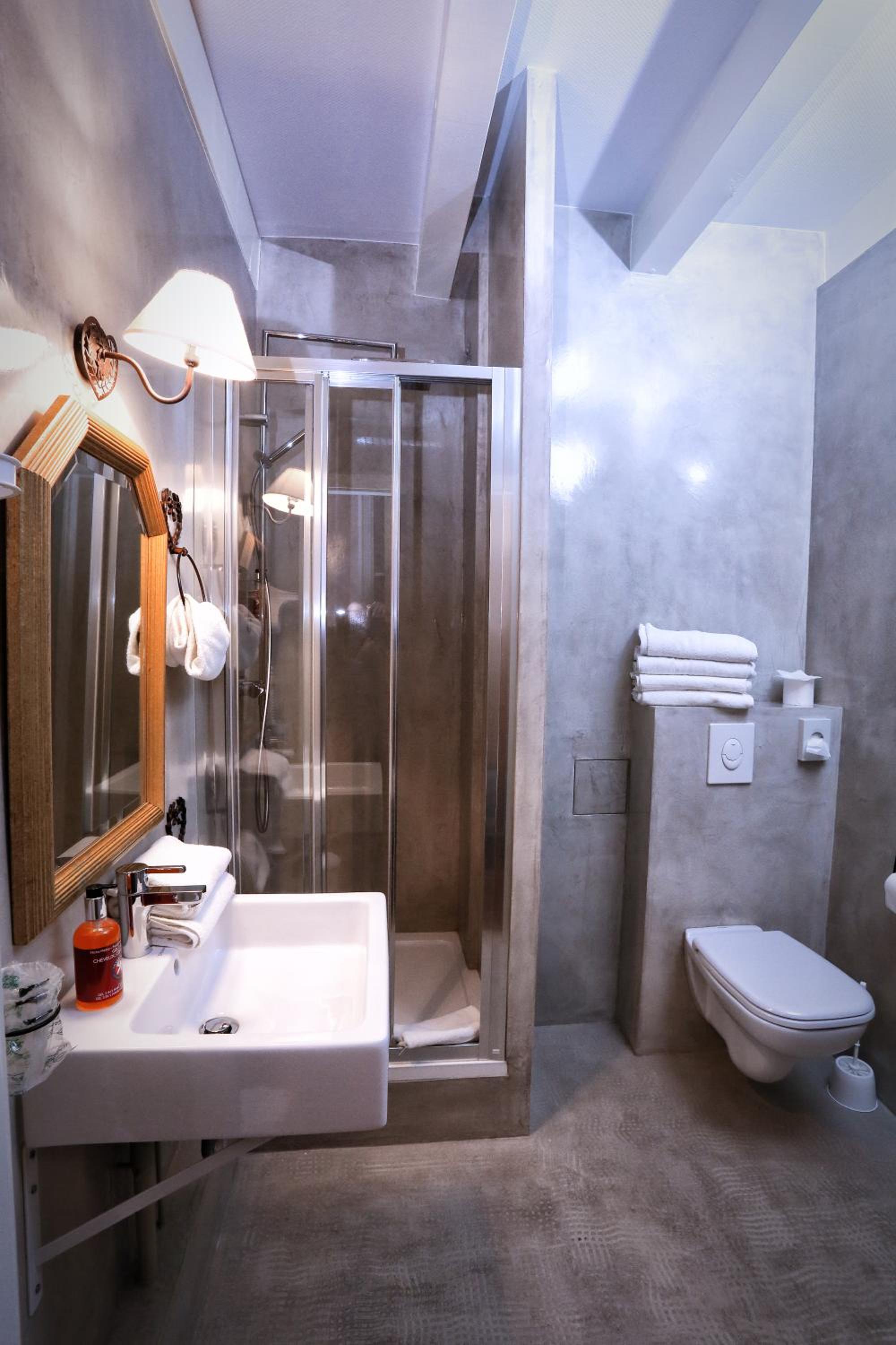 La cabine de douche est un peu glissante.