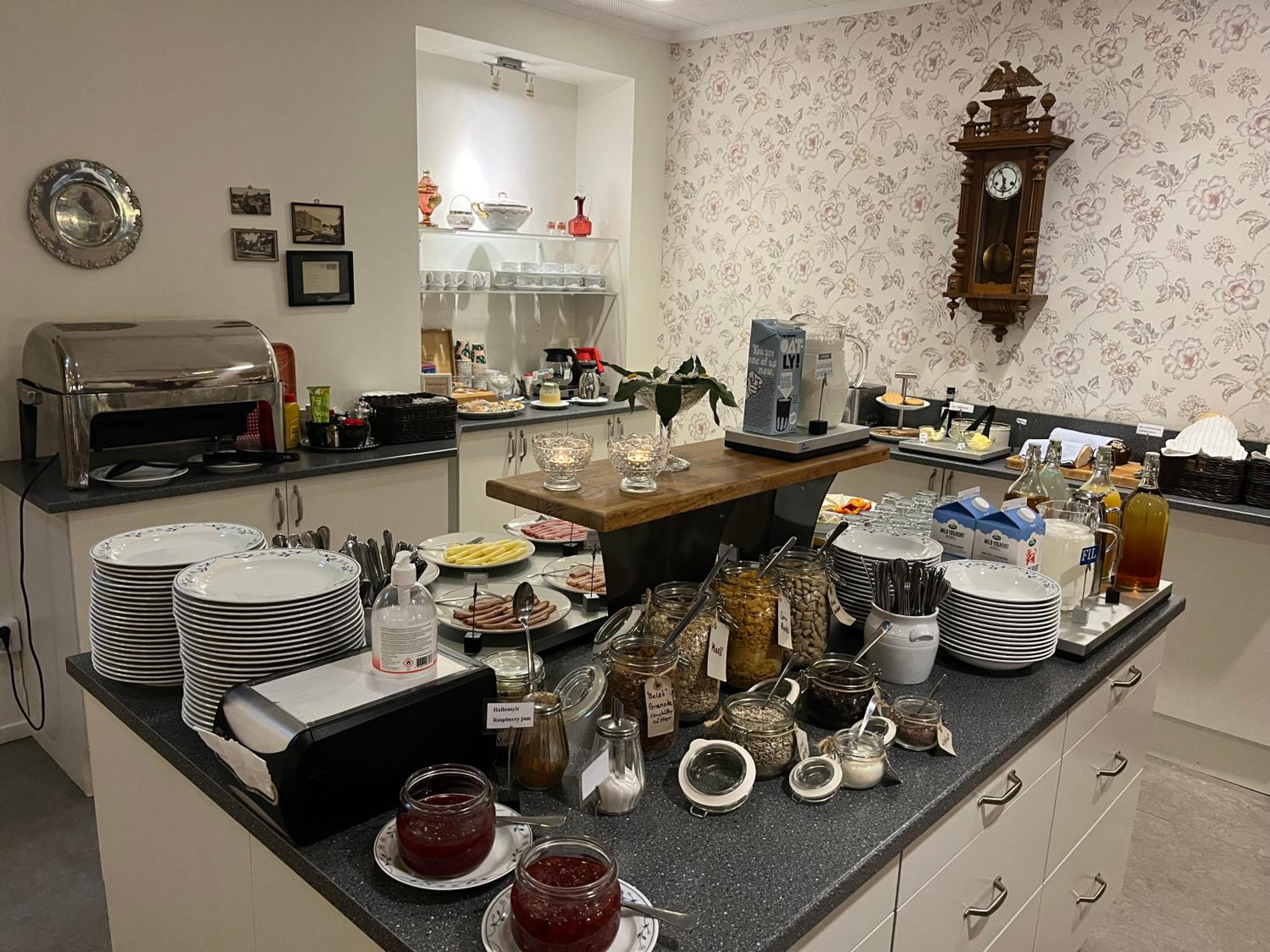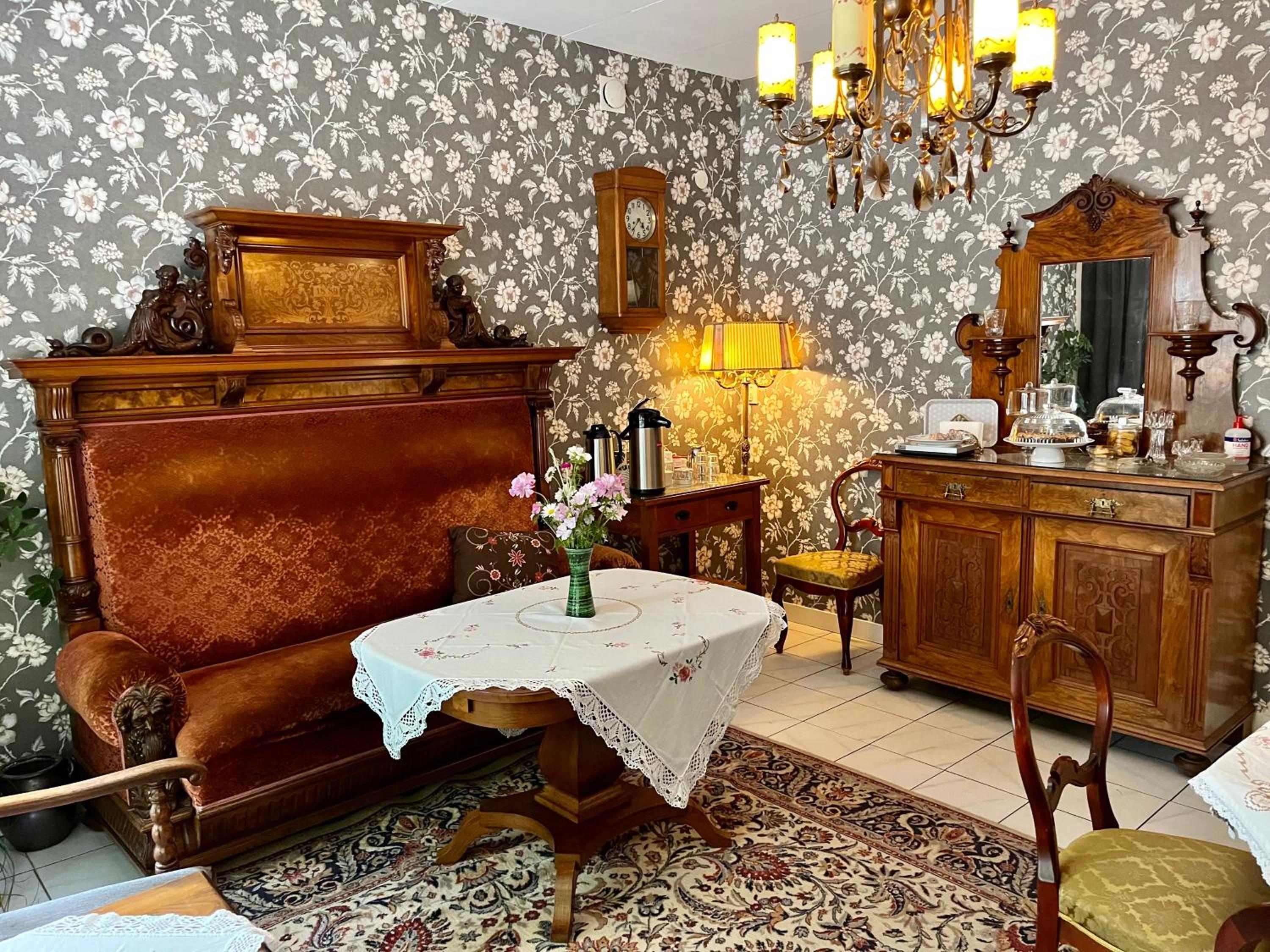 Frukosten är mycket personlig i en matsal med gamla möbler, som från en middagsbjudning eller hem på 40-/50-talet med virkade dukar på borden.
