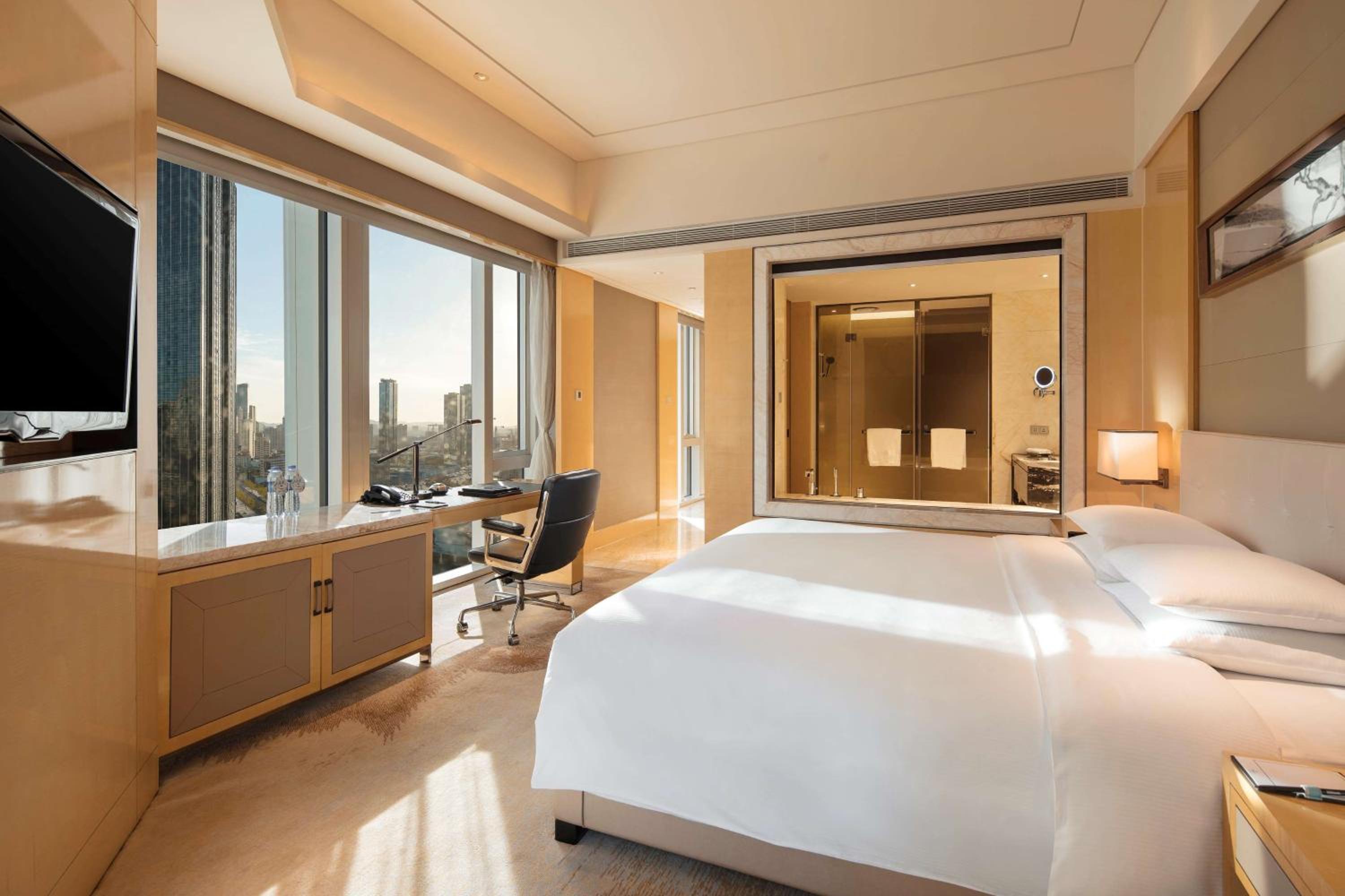 The Hilton Dalian, located next to the Dalian International Convention Centre, offers luxurious rooms with stunning views of Dalian Harbour. Each air-conditioned room features modern amenities like a flat-screen TV, iPod dock, and well-stocked minibar. Suites even include a separate living room for added comfort.
