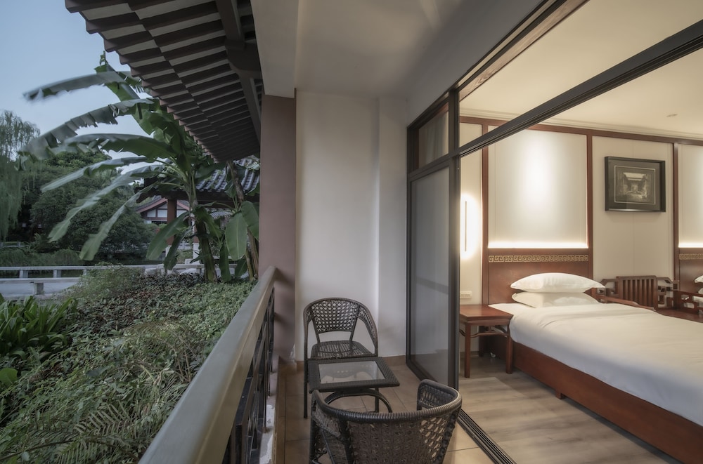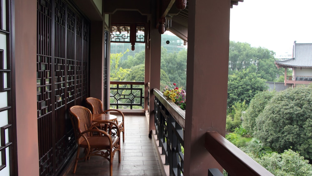 Unique luxury hotel in Tang Dynasty garden courtyard style with koi ponds all around located inside the city’s botanical gardens. Near shopping and food choices galore.