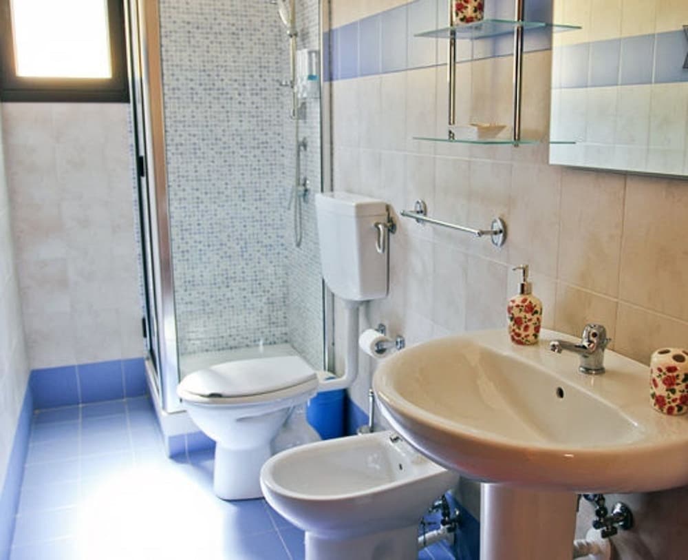 Asuimme hotellin residence-puolella huoneistossa emmekä käyttäneet varsinaisia hotellin palveluita. Hotellin henkilökunta oli ystävällinen ja vastaanotto lämmin. Huoneisto oli nippa nappa riittävän kokoinen paljon ulkona viihtyvän nelihenkisen perheen viikon asumiseen. Olohuoneeseen ei jäänyt ruokapöydän ympärille paljoa ylimääräistä tilaa, kun molemmat sohvat oli avattu sängyiksi. Telkkari on tosi pieni ja sieltä näkyy vain Italian kanavat. Keittiön varustetaso riitti yksinkertaiseen kokkaukseen. Kylppärissä vain suihku, josta tuli aina riittävästi lämmintä vettä. Vessapaperia ei suositella tiputettavaksi pönttöön, vaan viereiseen roskikseen.