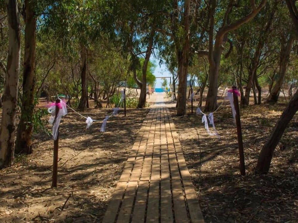 Hotel is located in a quiet area. Hire car essential, also entry into the hotel can appear tight with gates to be negotiated. Although we were delayed, the staff met us and took care of the necessary. Beach is a minute walk away and when we were there empty. Rooms were clean with sufficient utensils, however a kettle would be a blessing. Hotel is basic but well worth the money.