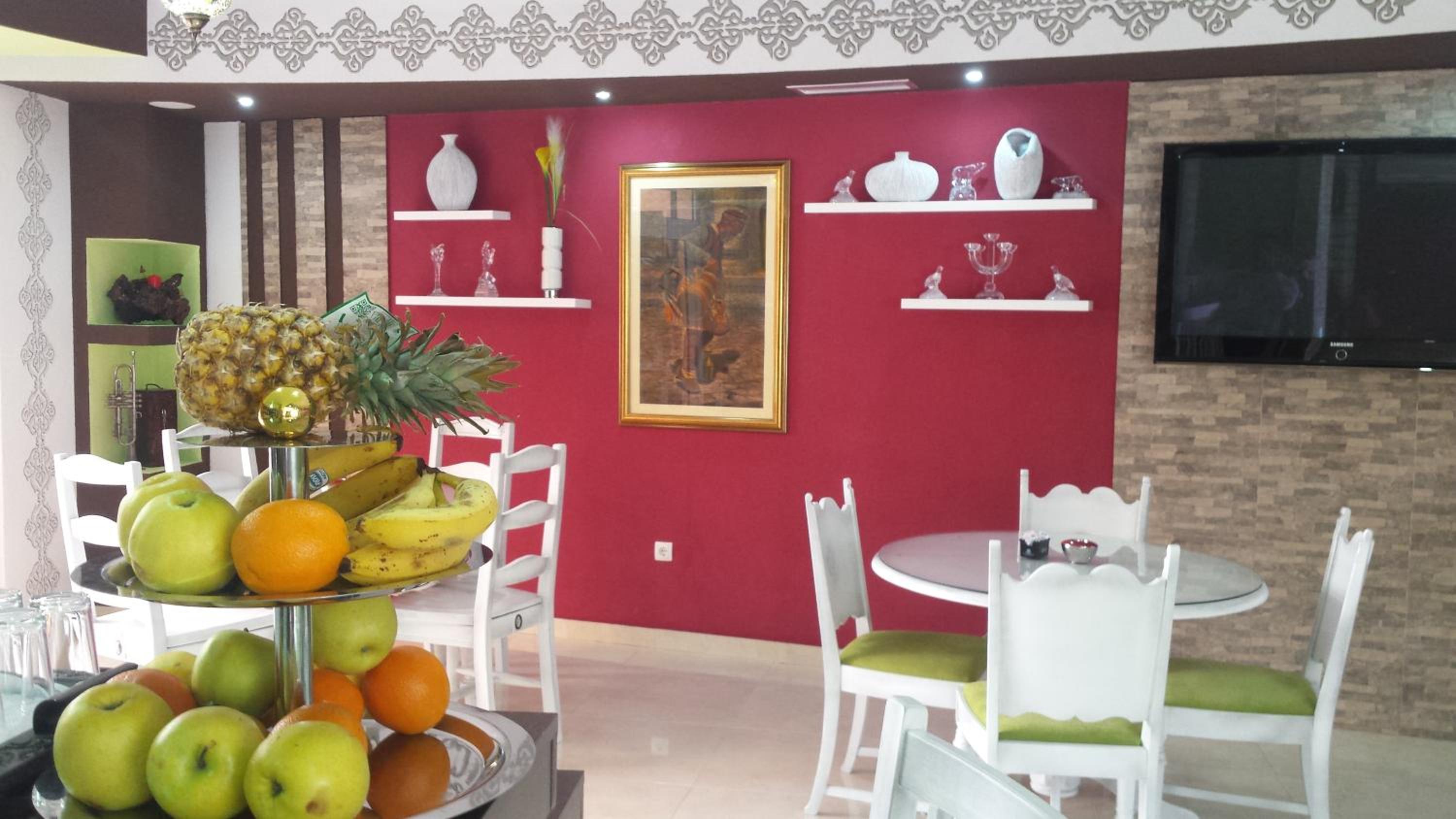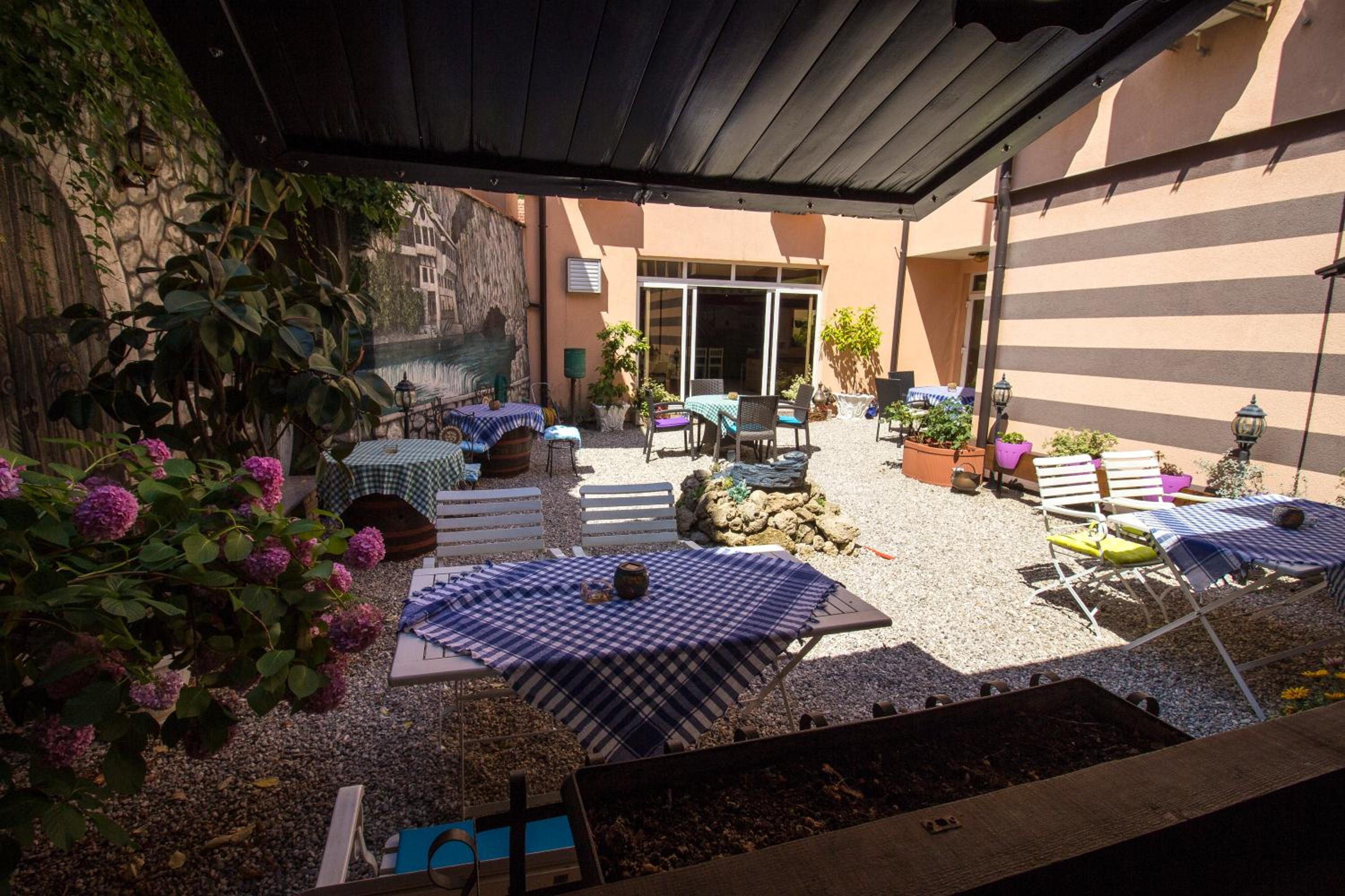 Savor meals at the hotel's restaurant or relax on the terrace with your favorite drink. The dining area exudes a cozy atmosphere with rustic furnishings and brick walls, perfect for a memorable dining experience.