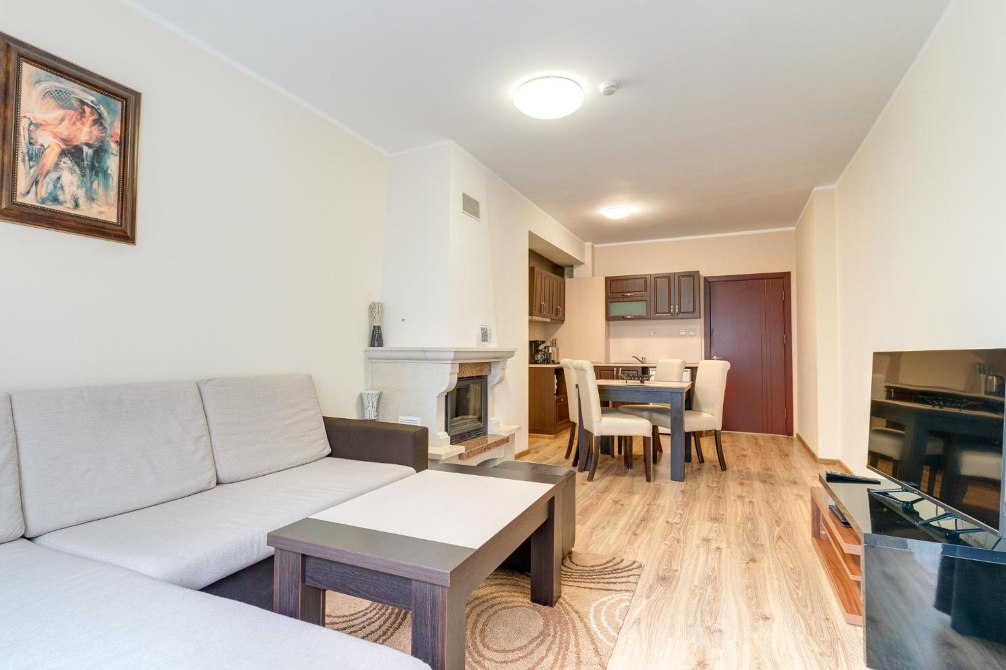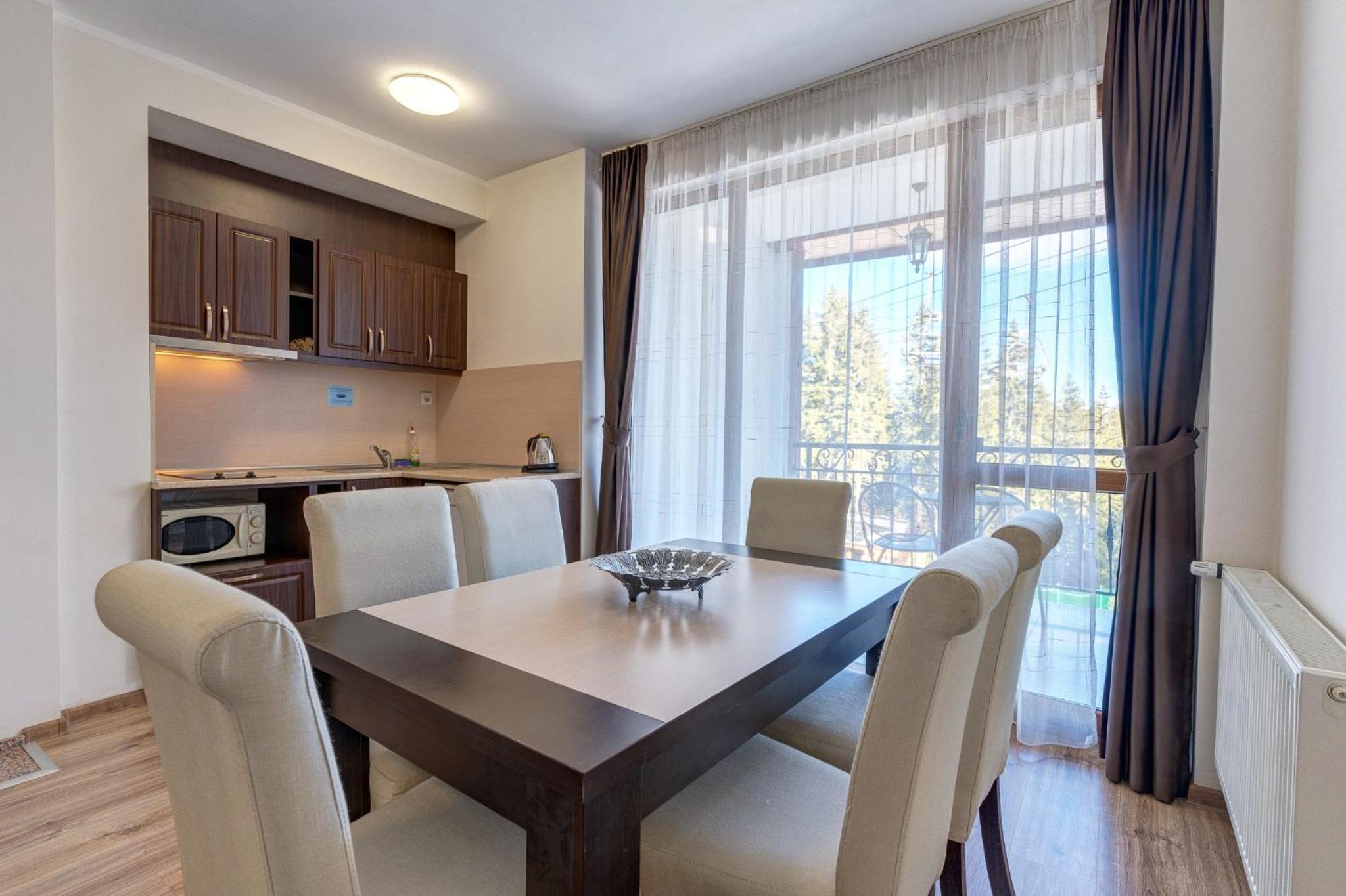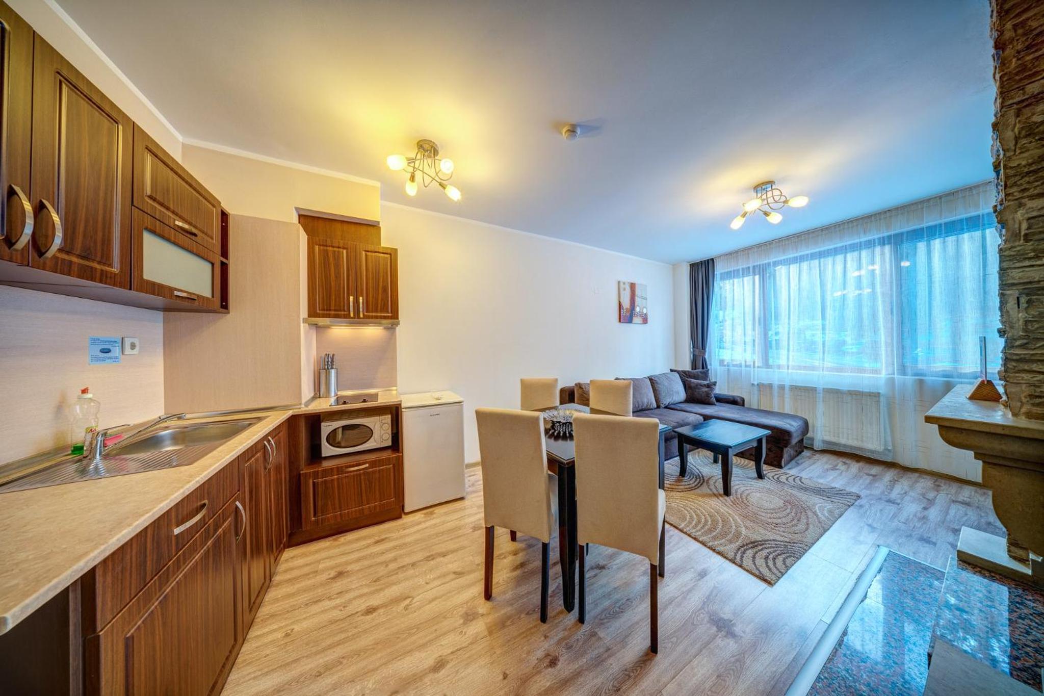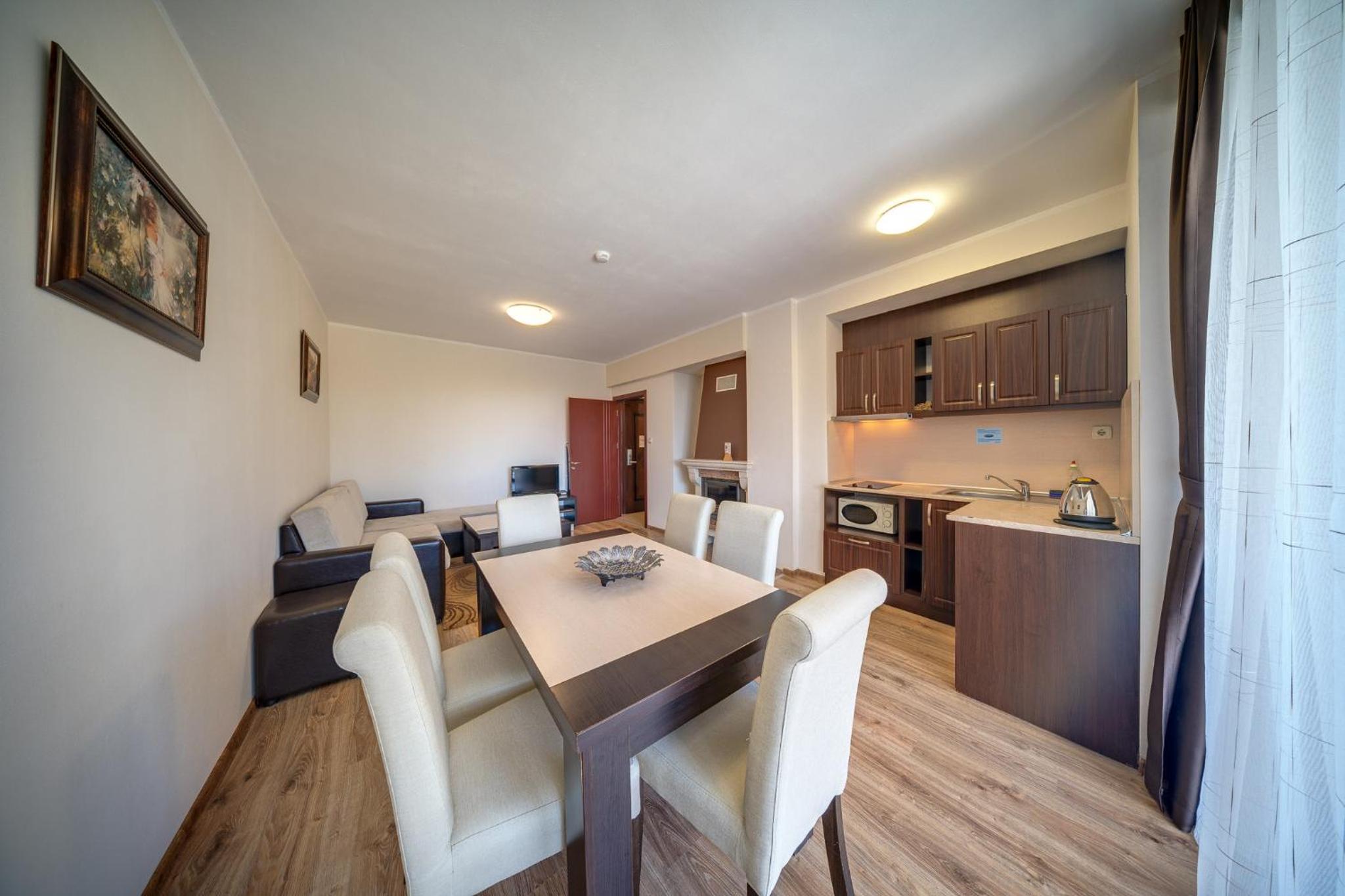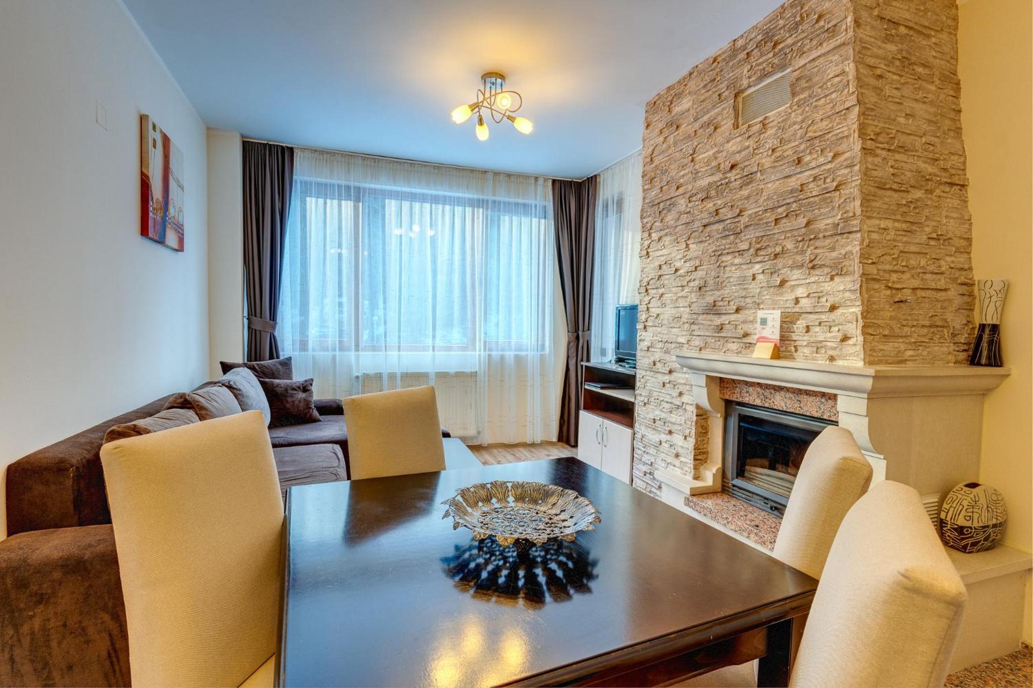 Gourmet Dining and Entertainment: Indulge in Bulgarian and European cuisine at the hotel's two restaurants, or opt for a private dinner. End your day with a cozy fireplace in your modern apartment with mountain views.