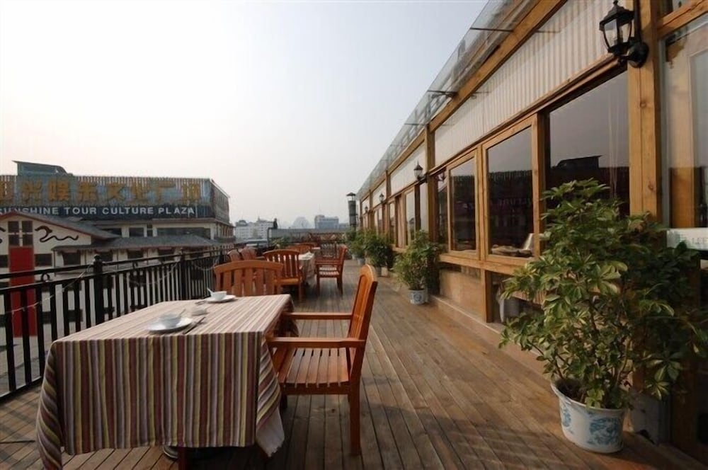 As everyone has said before me, the BEST thing about this hotel is it's location. It is where EVERYTHING you want to see in Guilin city is. Once you check in, you can walk to every major landmark or tourist spot, theater, as well as the night market, bars, restaurants, cafes, etc...it has everything right outside the front door. My experience with service in the hotel was quite good- they took care of all my issues, though we had difficulty communicating, as I spoke no Mandarin. Smiling service is not their forte- but they were prompt at responding to any issues that I had. The AC worked well, the bed was clean and comfortable, the shower was hot, there were slippers, hair dryer, soap, tooth brush, kettle, Wifi. They even had outlets that fit my US devices. Flat screen TV with lots of Mandarin channels. My room did not have a safe but it was updated and was quite a contrast with the corridors and public spaces...those looked really worn and tired. The cleanliness standard is so-so. If you want that, you can book the Sheraton next door. Though there were mainly families staying at the hotel, cards with pictures of women on them were slid under my door every evening. I did not witness any such encounter. The breakfast was quite sumptuous, especially if you enjoy traditional local cuisine...cold and fried noodles, dumplings, sausages, sauteed veggies, toast, juice, watermelon, etc The rooftop restaurant where it is served has some good views of the Li River and Elephant Hill.