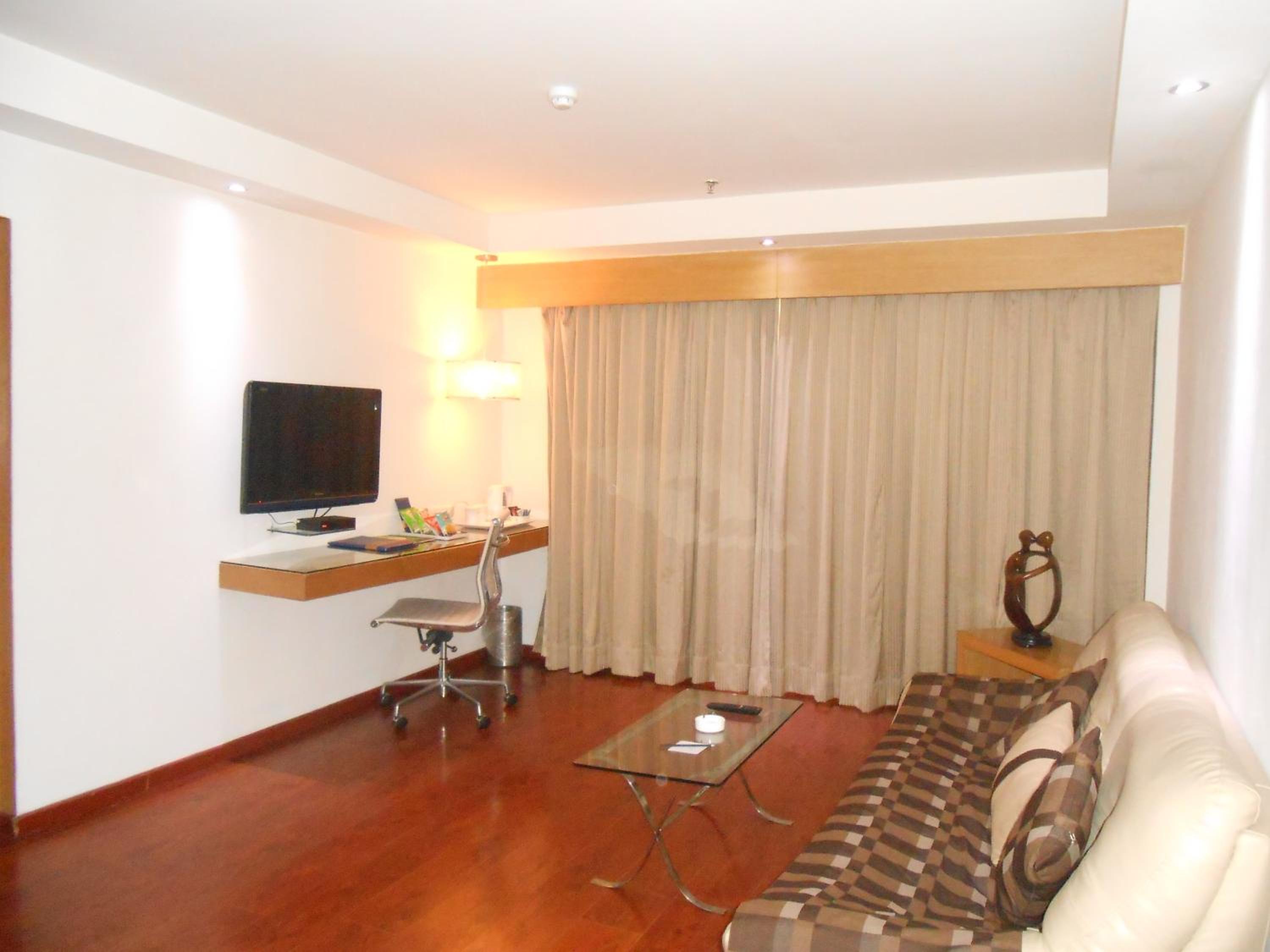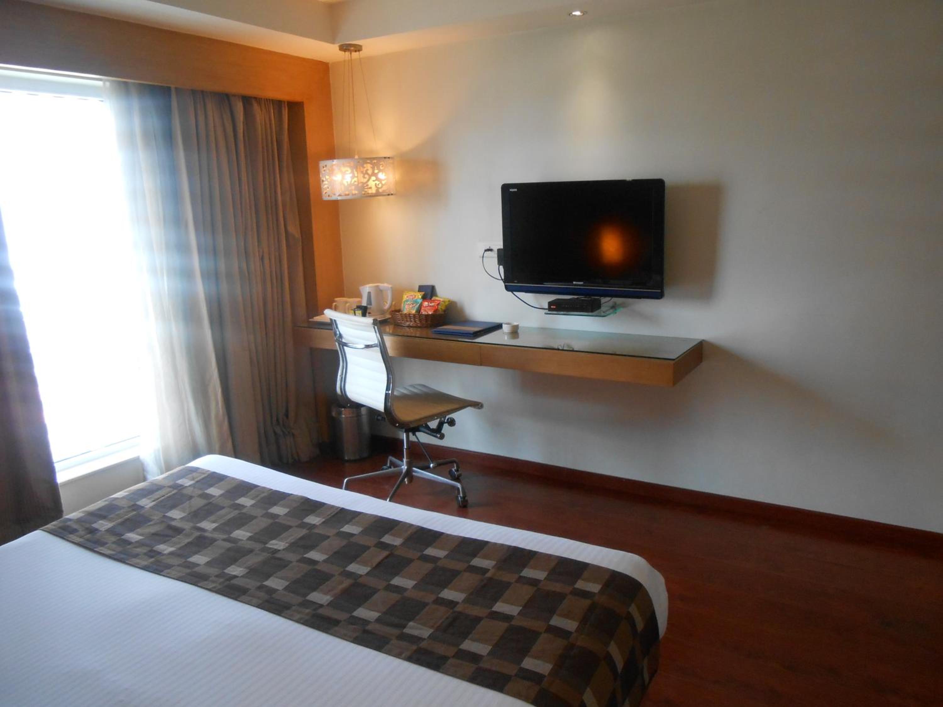 The double delux room had two chairs - one desk and one safa-seater. The desk chairs sunk to its lowest level when one sat on it. The hydraulic mechanism did not hold the weight of a single person.