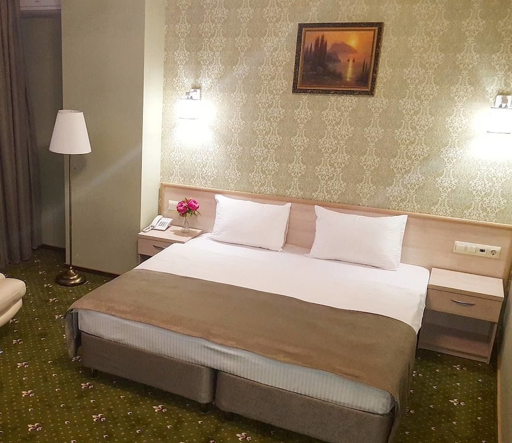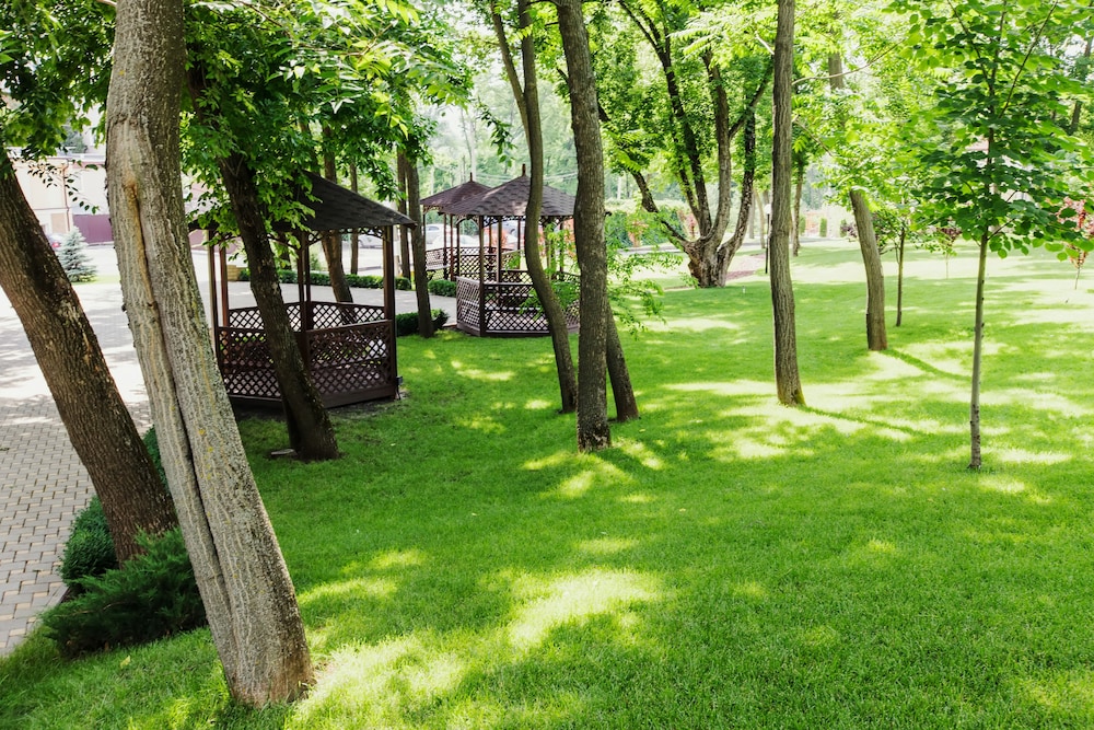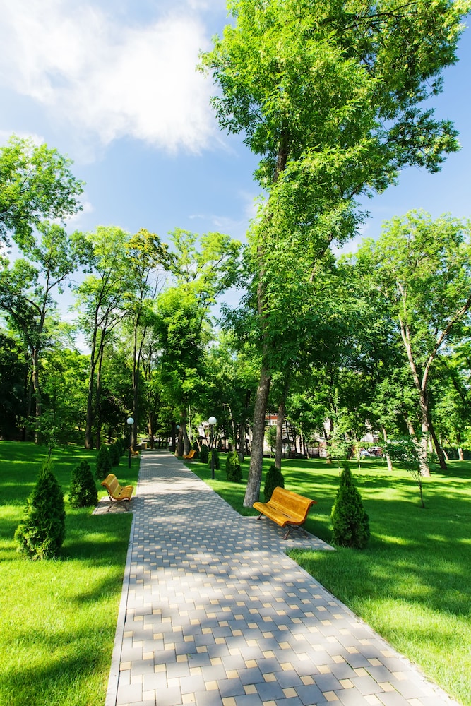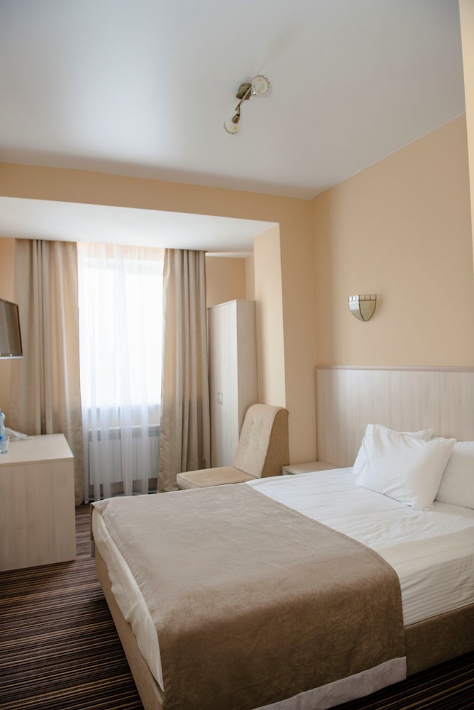 Отличный отель! Цена-качество супер! Приятно чистый, уборка была каждый день. Удобный матрас, качественное постельное белье, каждый день чистые полотенца. Завтрак сытный - шведский стол, но каждый день одинаковые блюда. Окна половины номеров выходят на сад (хорошо смотрится из номера на 3м этаже, а вот с 5го этажа вид уже не очень). Окна другой части номеров выходят на внутренний двор, где ресторан (по пятницам и субботам в нем банкеты до 23-24ч, мне почти не мешали) и вывоз мусора из контейнеров (было слышно рано утром всего раз). При выборе номеров важно, что пульт кондиционера один на два номера. Если любите, когда в номере не слишком холодно, просите номер "второй от сплита" (или наоборот номер со сплитом, если нравится похолоднее). Приятно, что в отеле есть ресторан, чтобы пообедать, поужинать и не ехать в город (до 22ч). Впрочем, центр близко - с пробками 15-20 минут на такси. Номера лучше посмотреть до заселения (в первом номере был запах несвежих носков от ковролина, в пяти-семи др номерах такой проблемы не было). Не хватает химчистки кресел, обои нуждаются в обновлении. Но в остальном все прекрасно. Мебель удобная. Ощущение комфорта было. Сад с розами восхитительный! Фонтан, павлины и олени. Ландшафтный дизайн. Пожелание: нужен чайник в каждом номере (холодильник, фен и телек-плазма в номере были, а чайник нельзя было получить и за доплату, что огорчает)