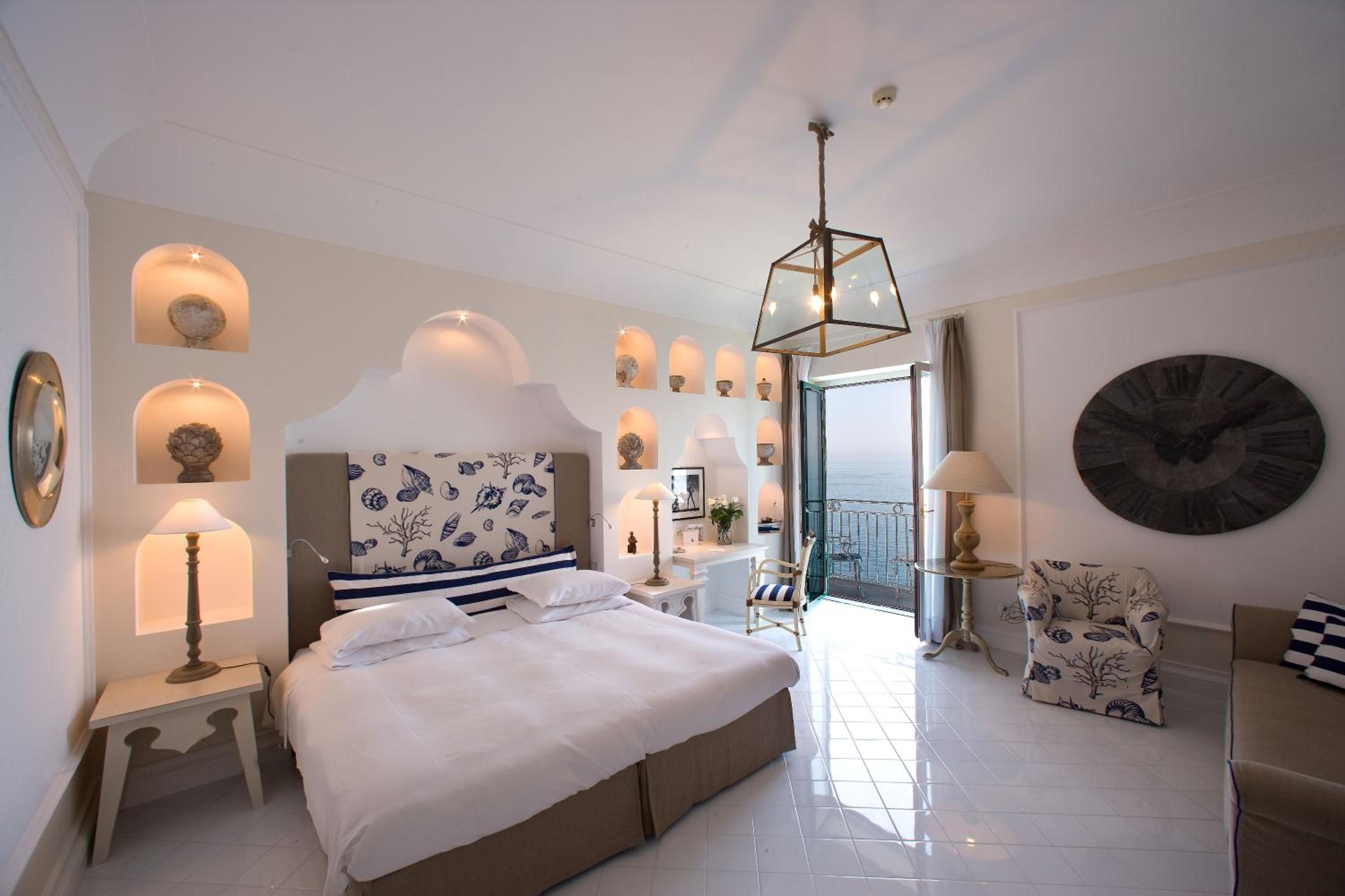 Bedding was with hotel logo (changed daiy) turn down service as well . Huge bed and lovey quality I had extra pillows and room had full air con etc. no bath just a very large shower. Had a couple of dinners at the hotel they were nice but I like eating out in sorrento . the hotel art collection is super impressive and that was unexpected the attention to detail the place felt like a movie set all the time, Just beautiful at every point of the hotel and with its own caves down to the free beach club for guests, very small pool with no loungers near the bar prob have loungers in the main summer as it was also quite windy for a few days . Lots of high end wedding and spectacular fire works each pm and we could hear the music of the weddings from the balcony which I enjoyed late pm but once doors on balcony was closed it was sound proof and shutters opposed to curtains so pitch black with lights turned out – very good sleap.