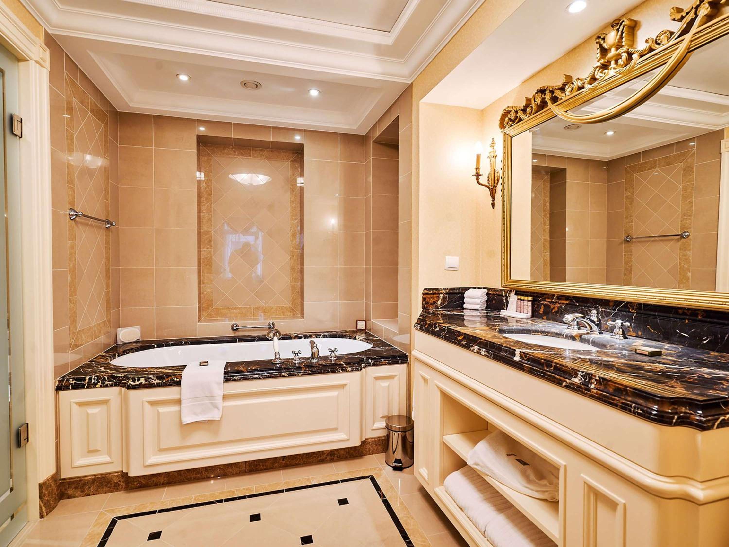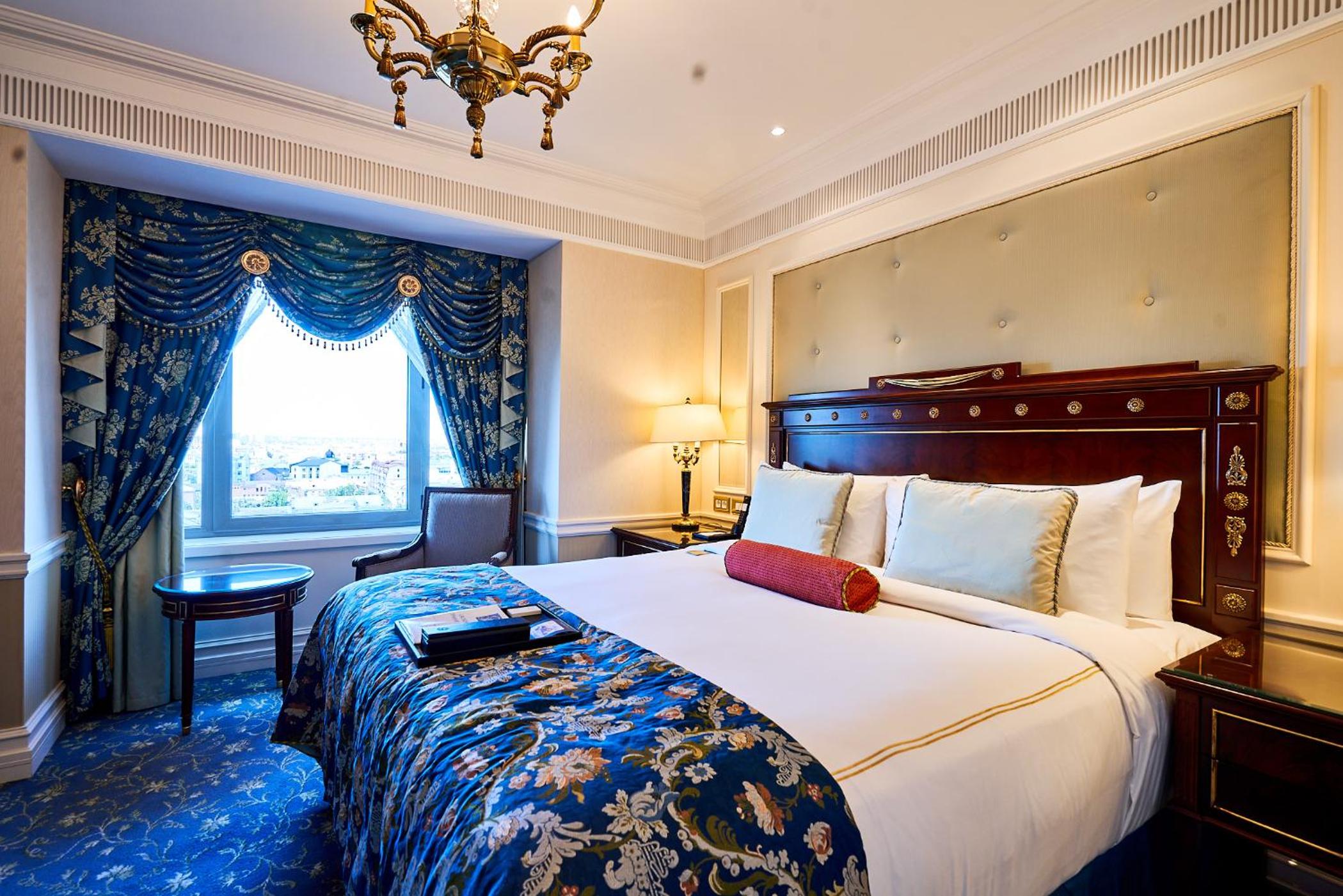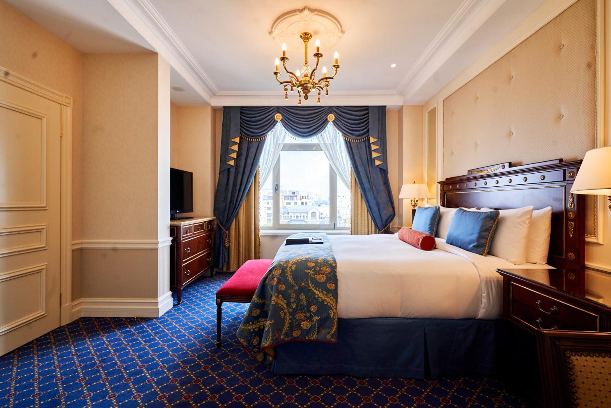Indulge in spacious rooms starting from 40 sq.m. at the elegant 5-star Fairmont Grand Hotel Kyiv. Each room is equipped with modern amenities including a flat-screen TV, minibar, and a work desk. The private bathroom features luxurious bathrobes, slippers, and complimentary toiletries for your comfort.