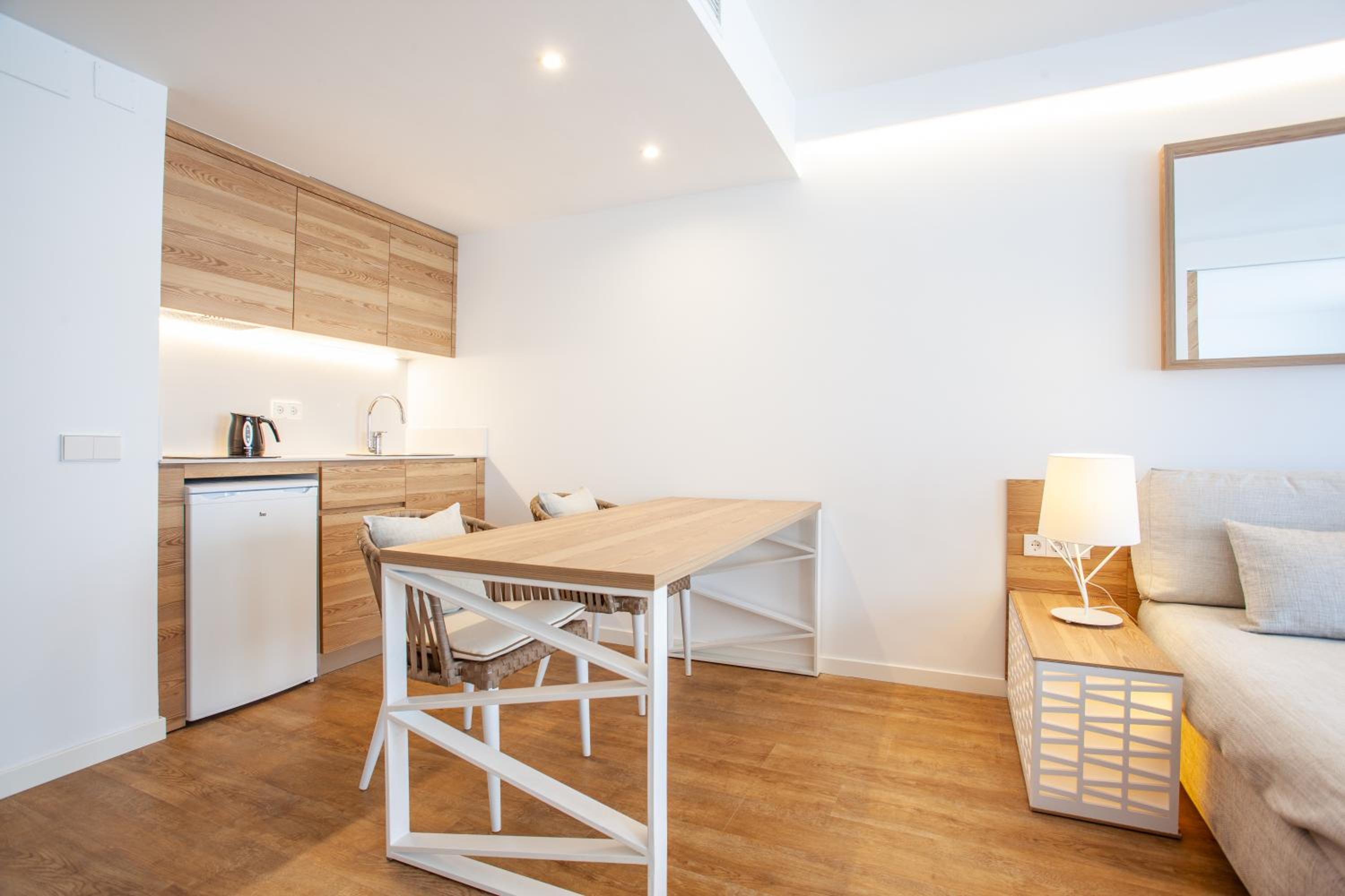 Experience our bright, air-conditioned apartments that offer breathtaking panoramic views of Can Picafort Beach and the glistening Mediterranean Sea. Each apartment is designed for your comfort, featuring a cozy living room with a sofa bed and a flat-screen TV.