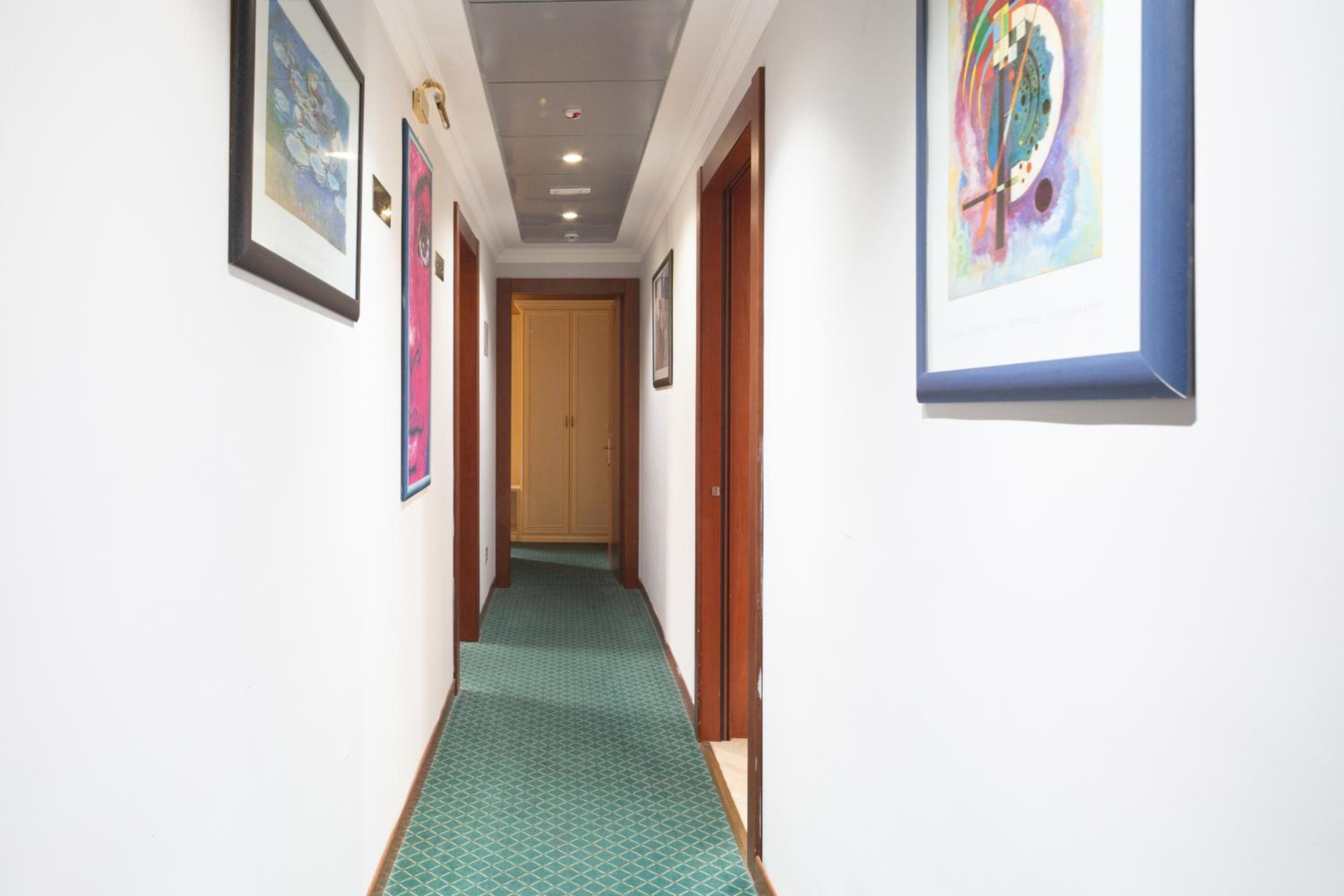 The hotel has beautiful decor or art work. The carpet in the room had a few
