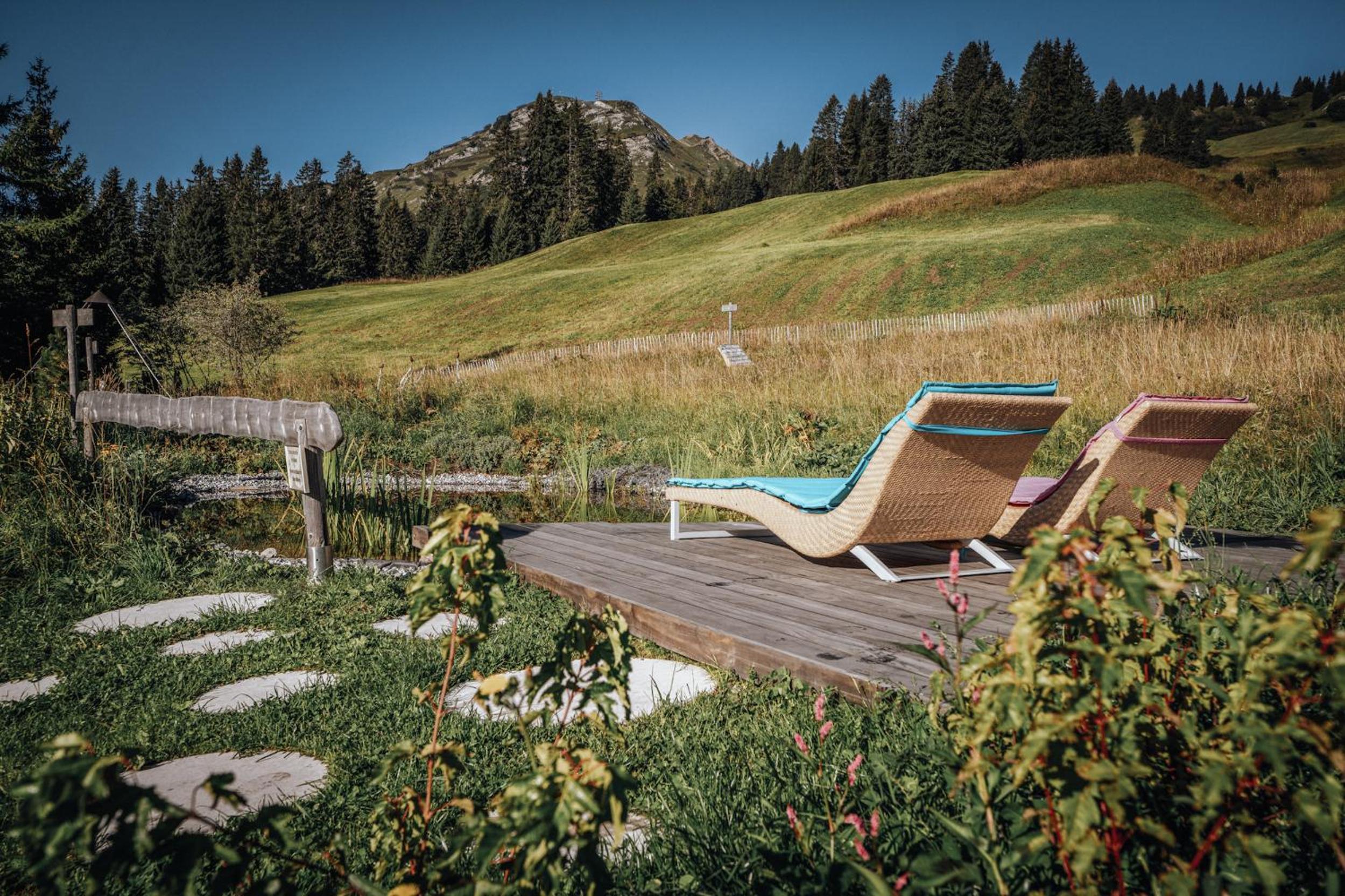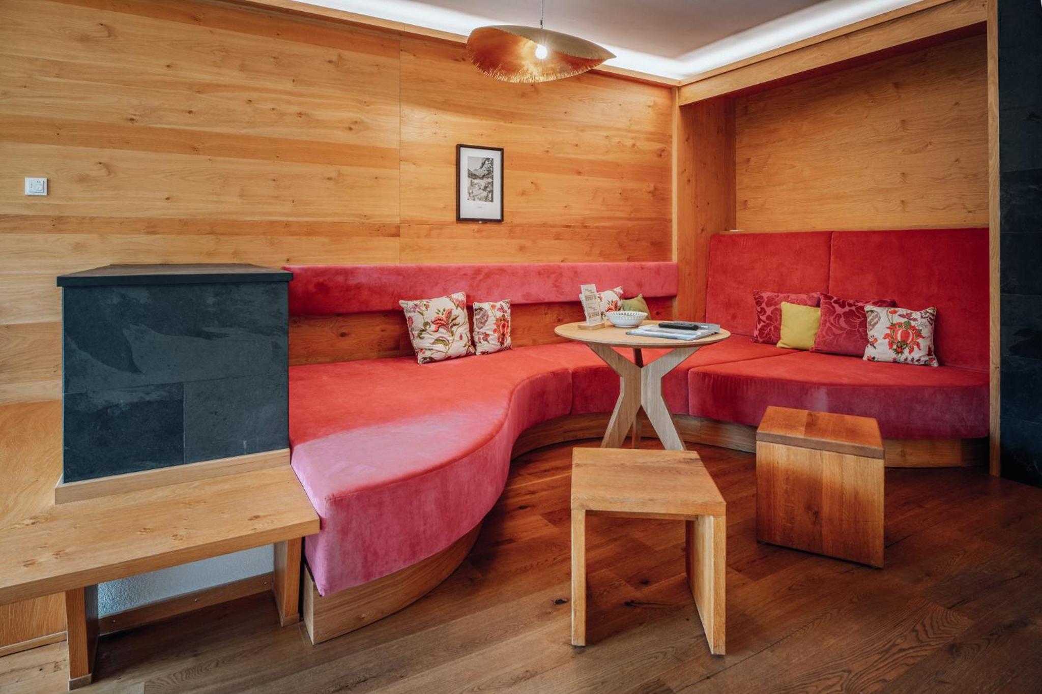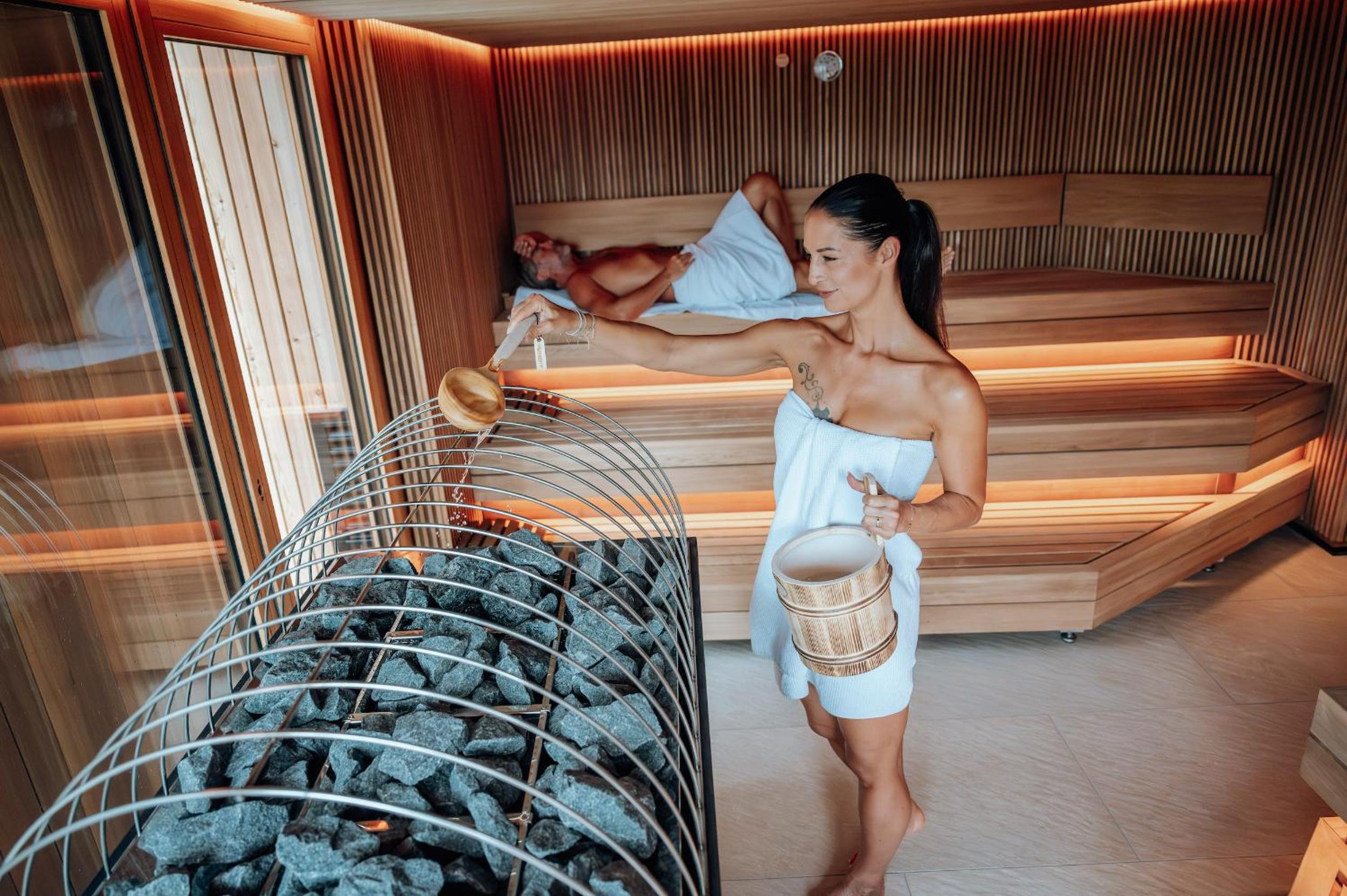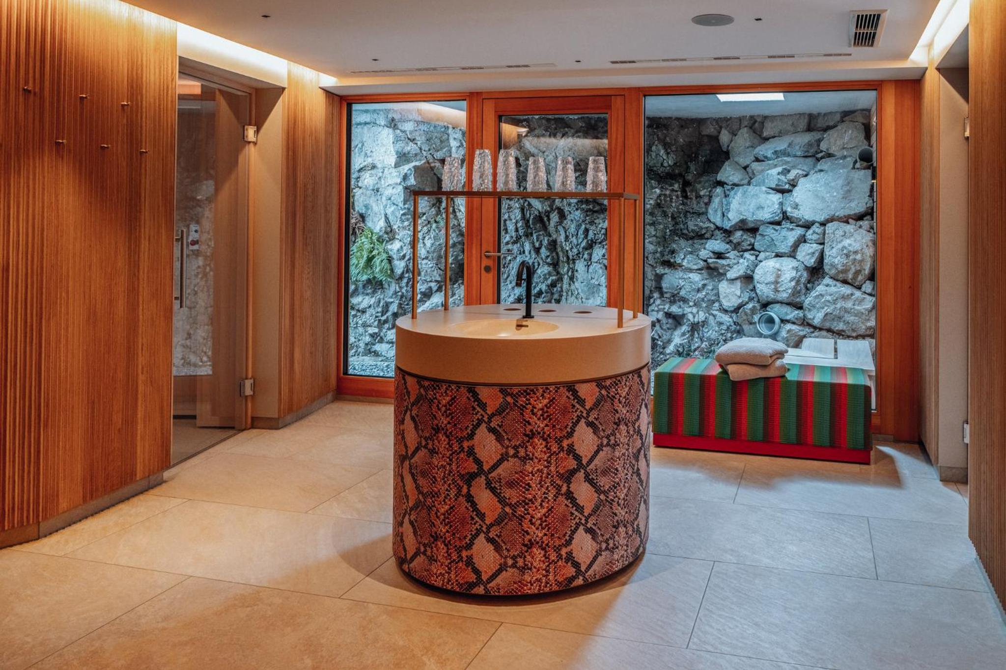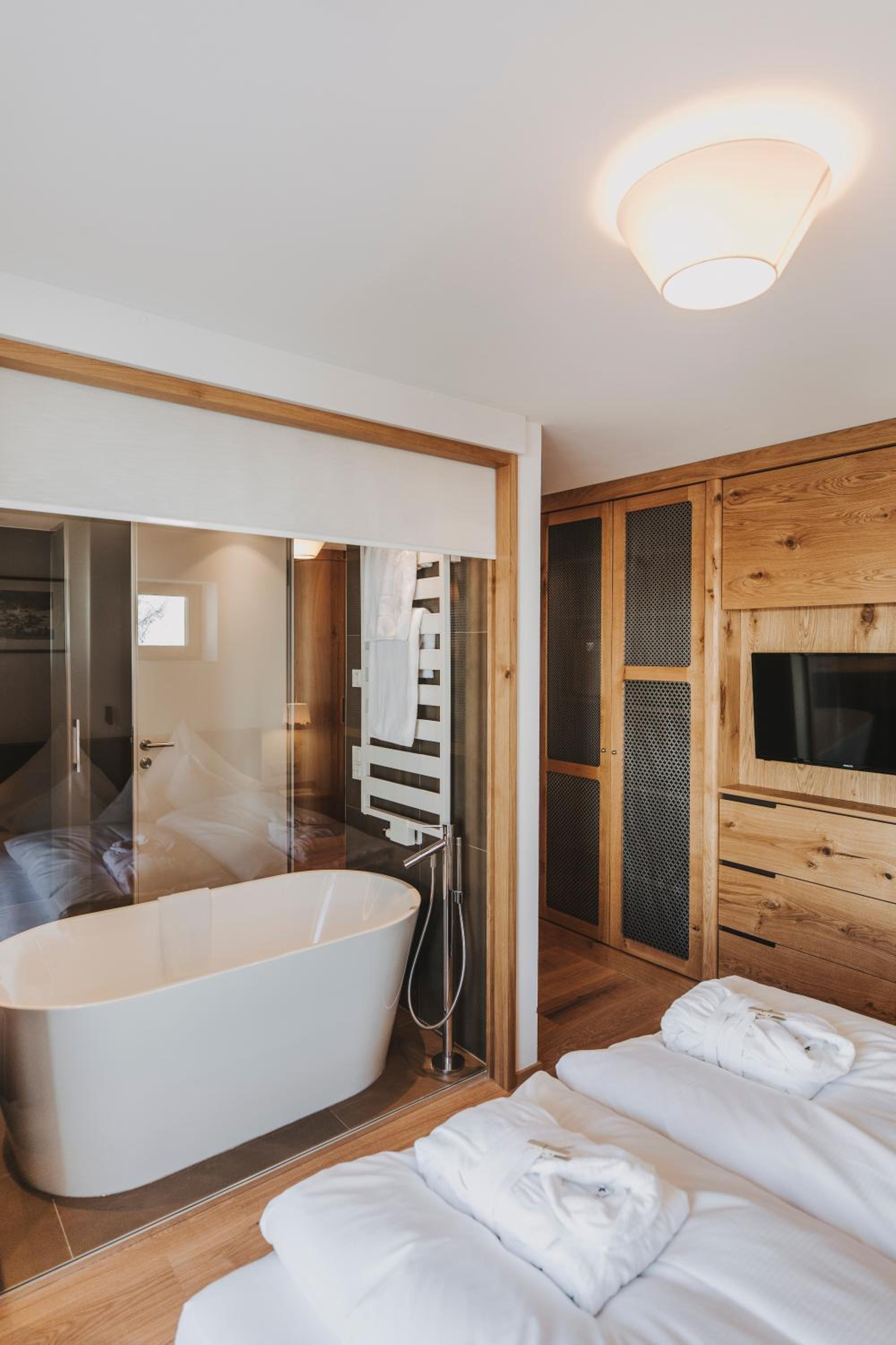 Alpin Spa Retreat: Experience tranquility in the 500 m² Alpin Spa with an outdoor hot tub, indoor pool, saunas, and relaxation rooms, all designed with natural materials for a serene ambiance.