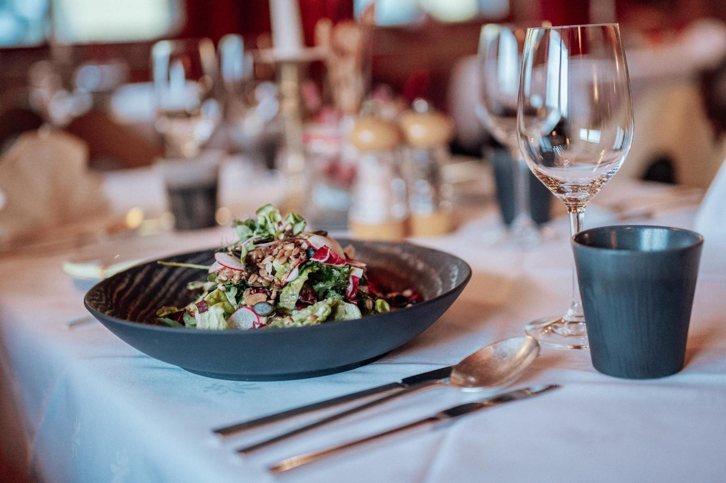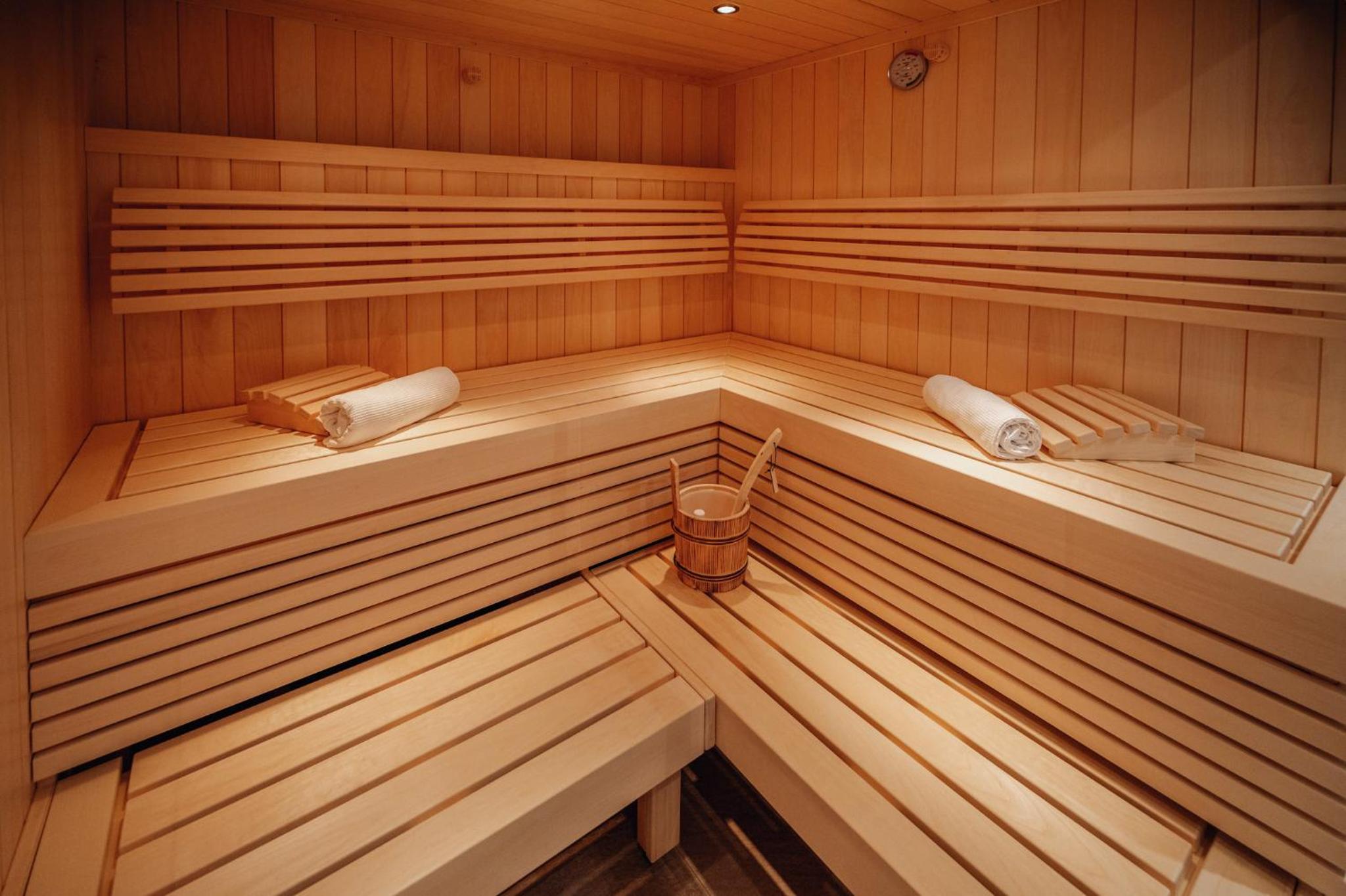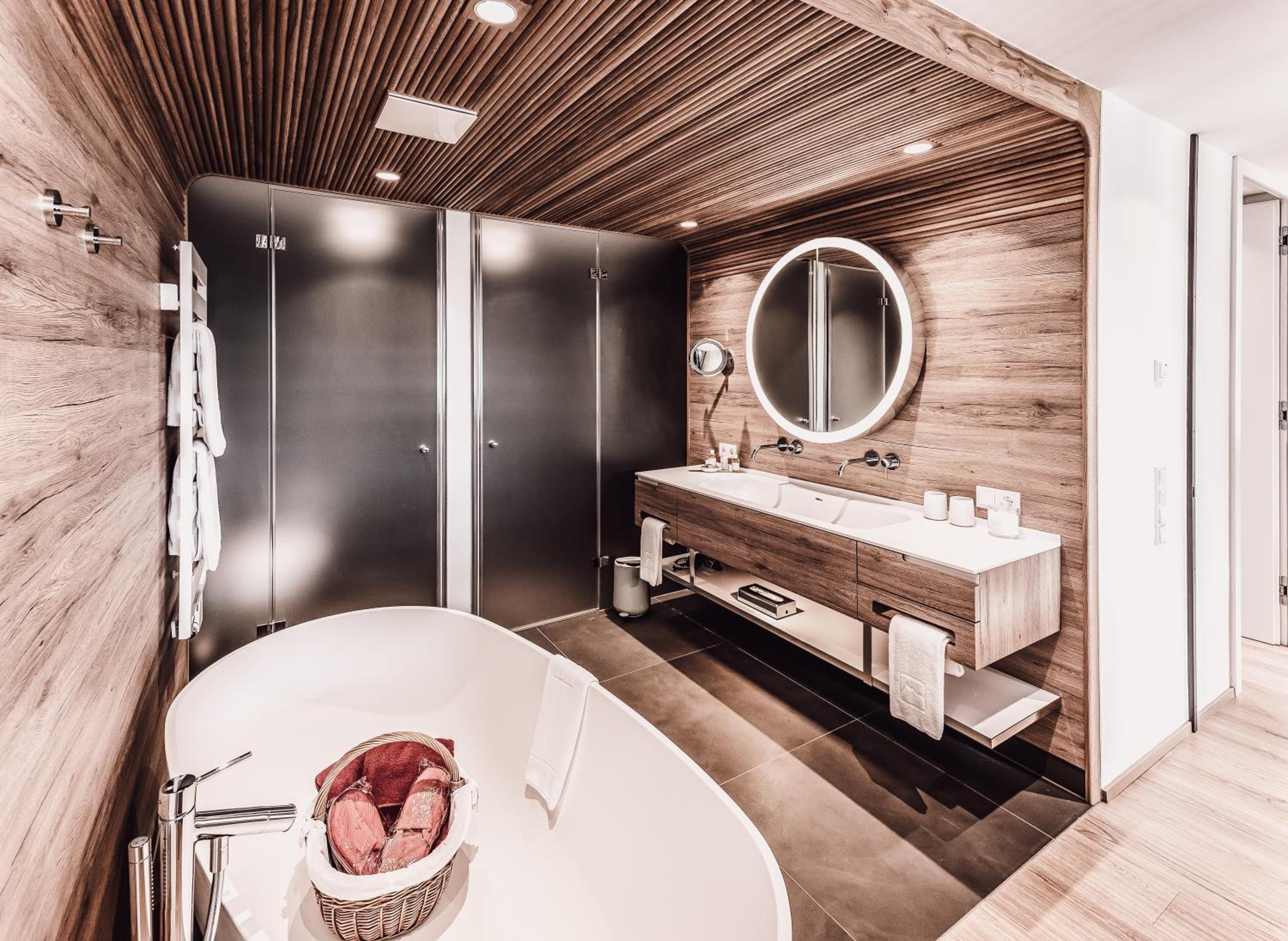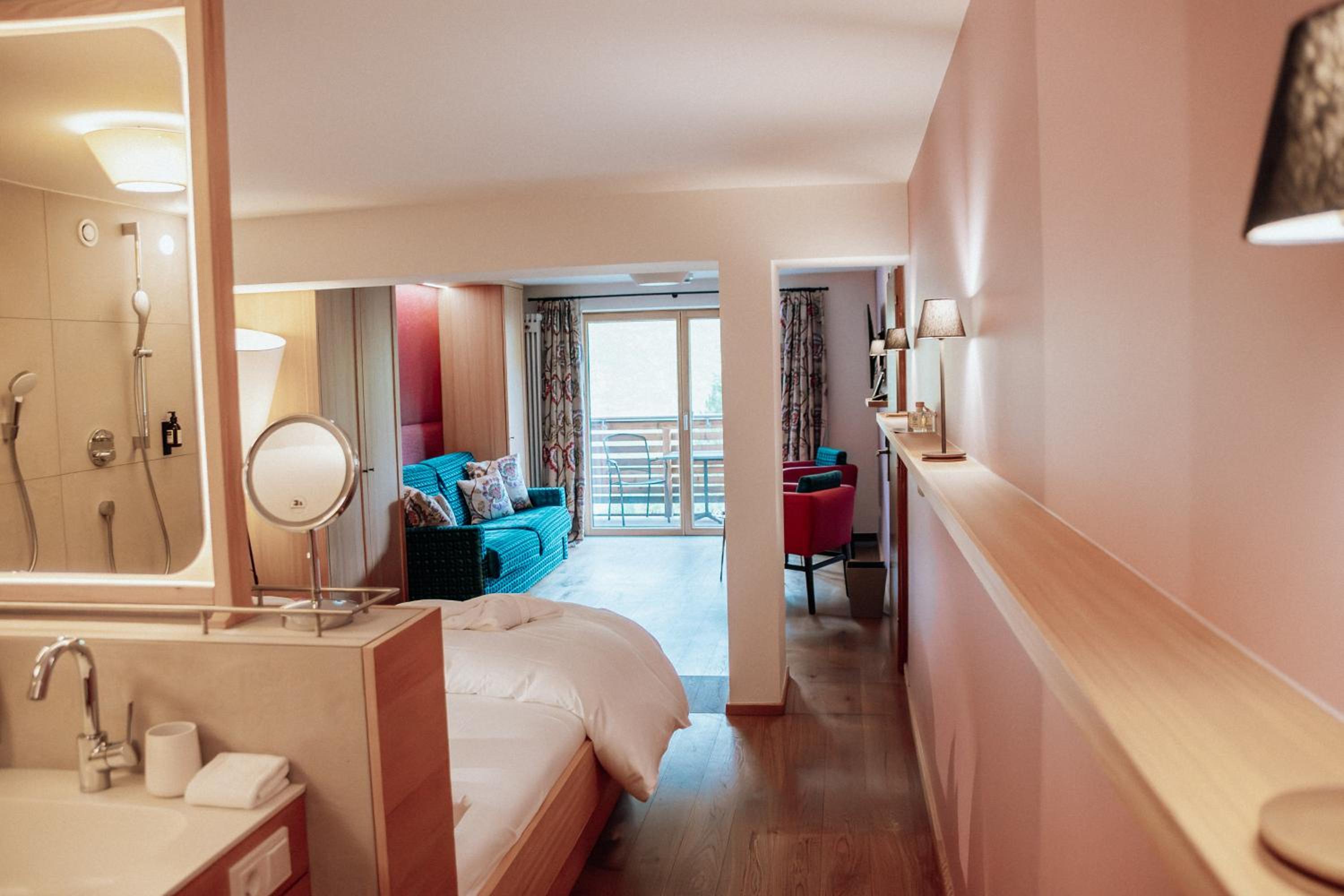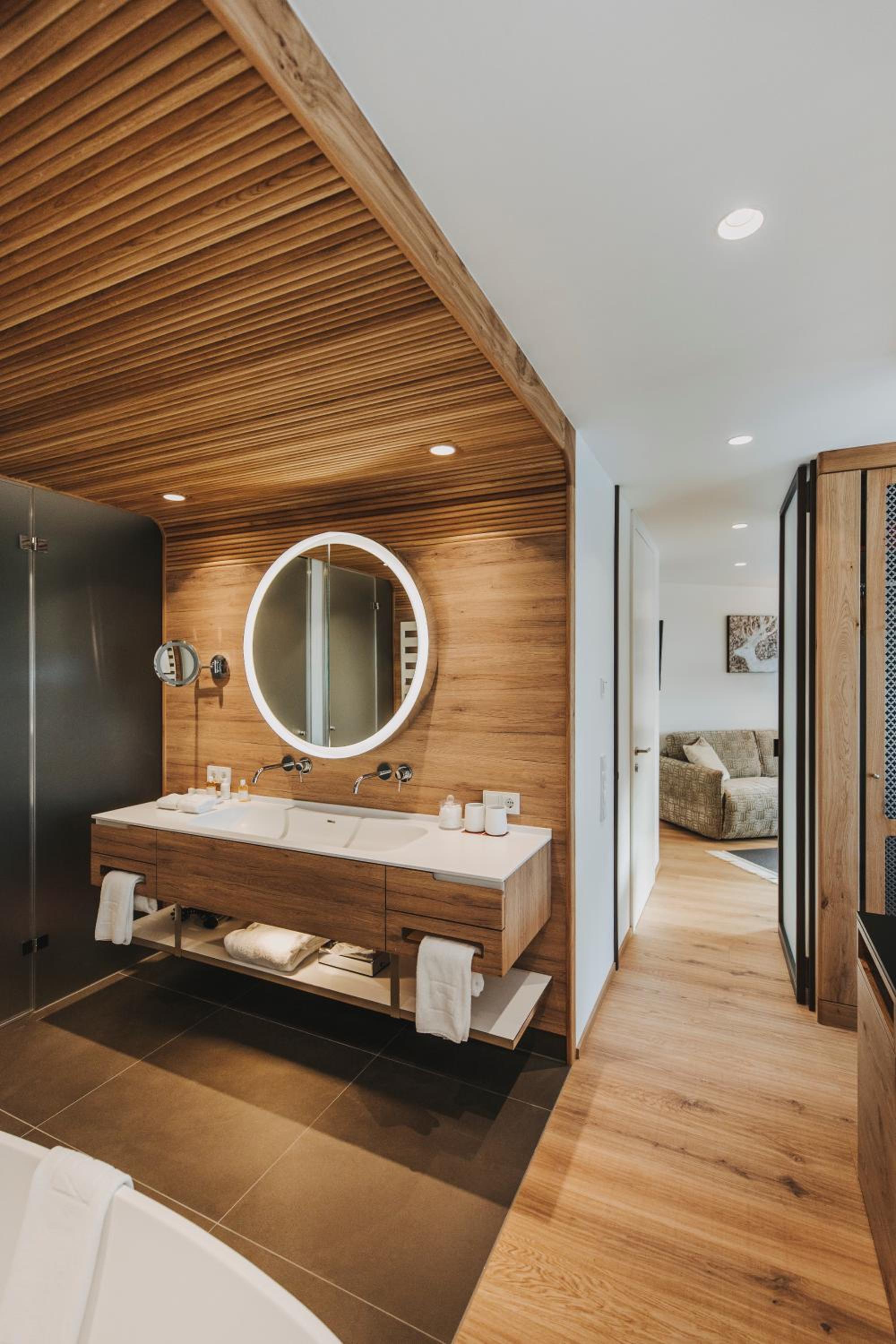 Alpin Spa Retreat: Experience tranquility in the 500 m² Alpin Spa with an outdoor hot tub, indoor pool, saunas, and relaxation rooms, all designed with natural materials for a serene ambiance.
