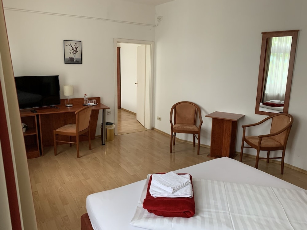 Stort rom, gammelt bad. Hyggelig betjening. Parkering i bakgården mot betaling av 5€ .