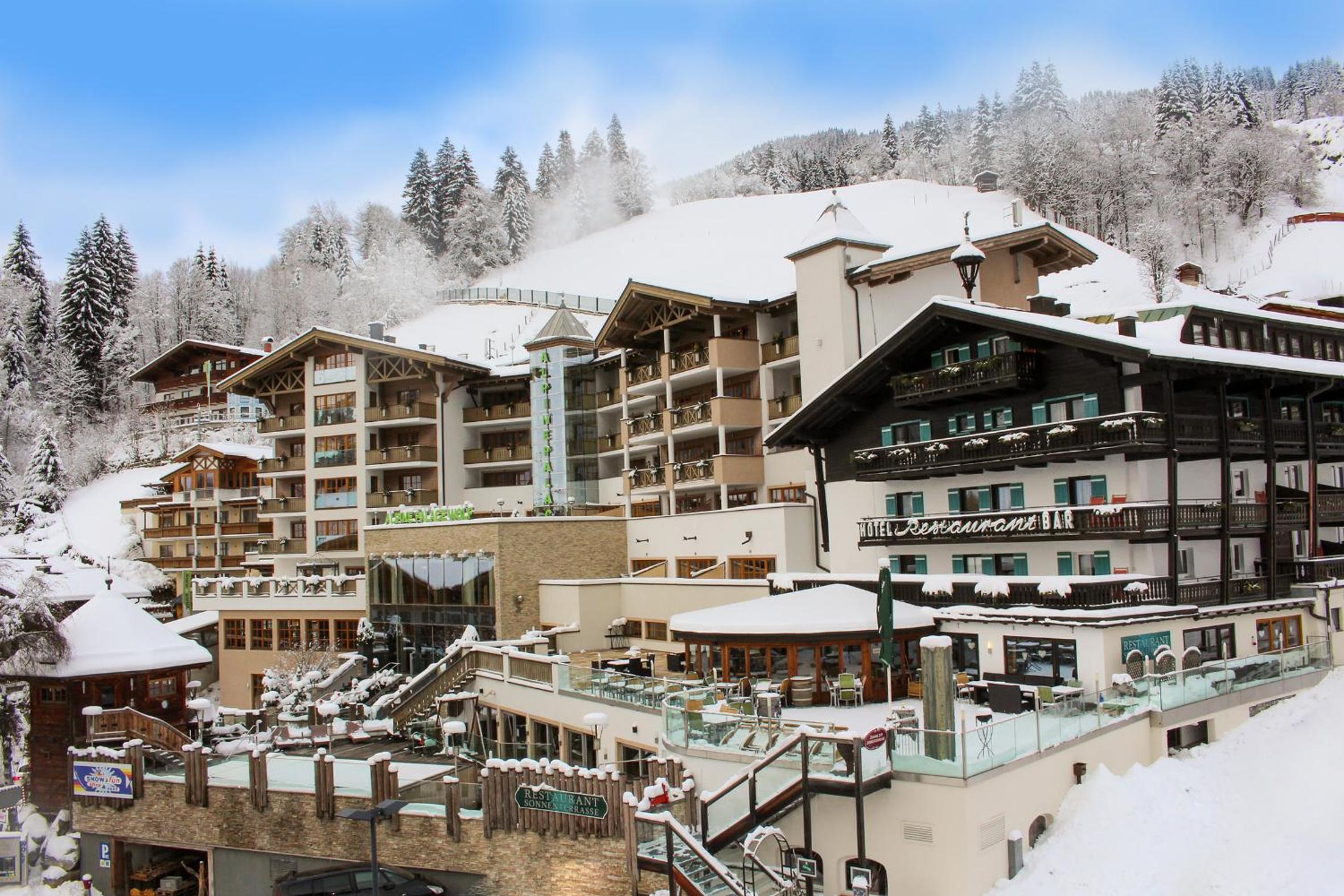 Connected to Hotel Alpine Palace, savor meals at the restaurants and unwind at the bar or wine tavern. Skiing lessons and rentals are available, while non-skiers can explore cross-country ski runs.