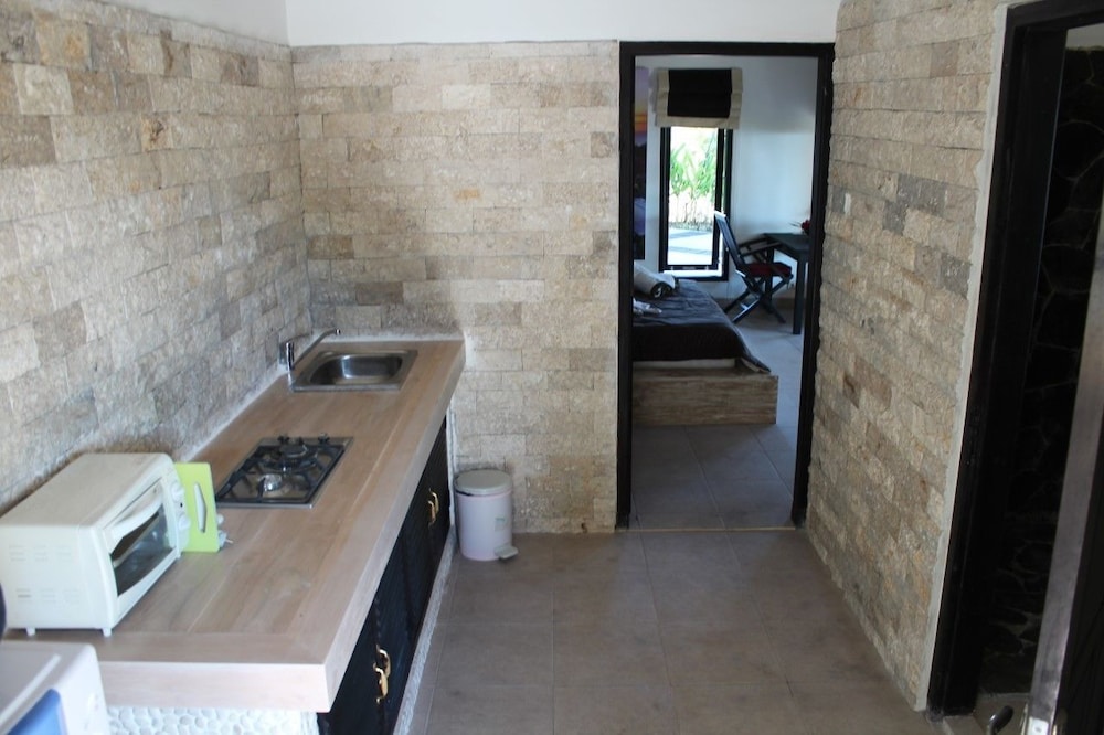 Les bungalows sont confortables et chaleureux.La piscine est très grande.La vue est magnifique.Le personnel est d'une gentillesse incroyable.Toujours à notre écoute, disponible tout en étant dicret. Le gérant Stephane l'est tout autant.L'hôtel est situé dans les collines et n'est pas accessible à pieds. Prevoyer de louer un scooter. Pour un séjour en amoureux, c'est parfait. Je recommande à 100%