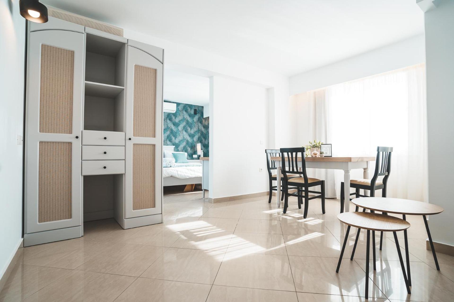 Zeus Village Resort - Adults Only offers spacious self-catered units with terraces or balconies showcasing pool, garden, or sea views. The apartments come equipped with modern amenities for a comfortable stay, including air conditioning, TV, and kitchenette.