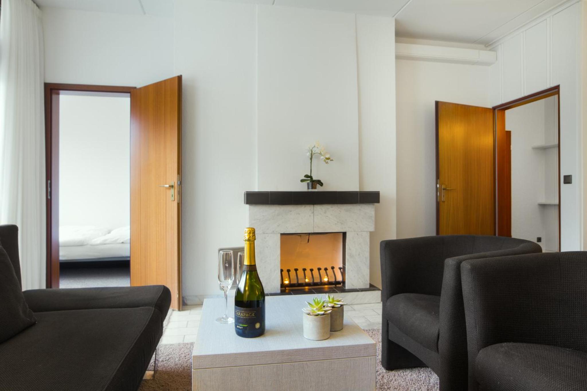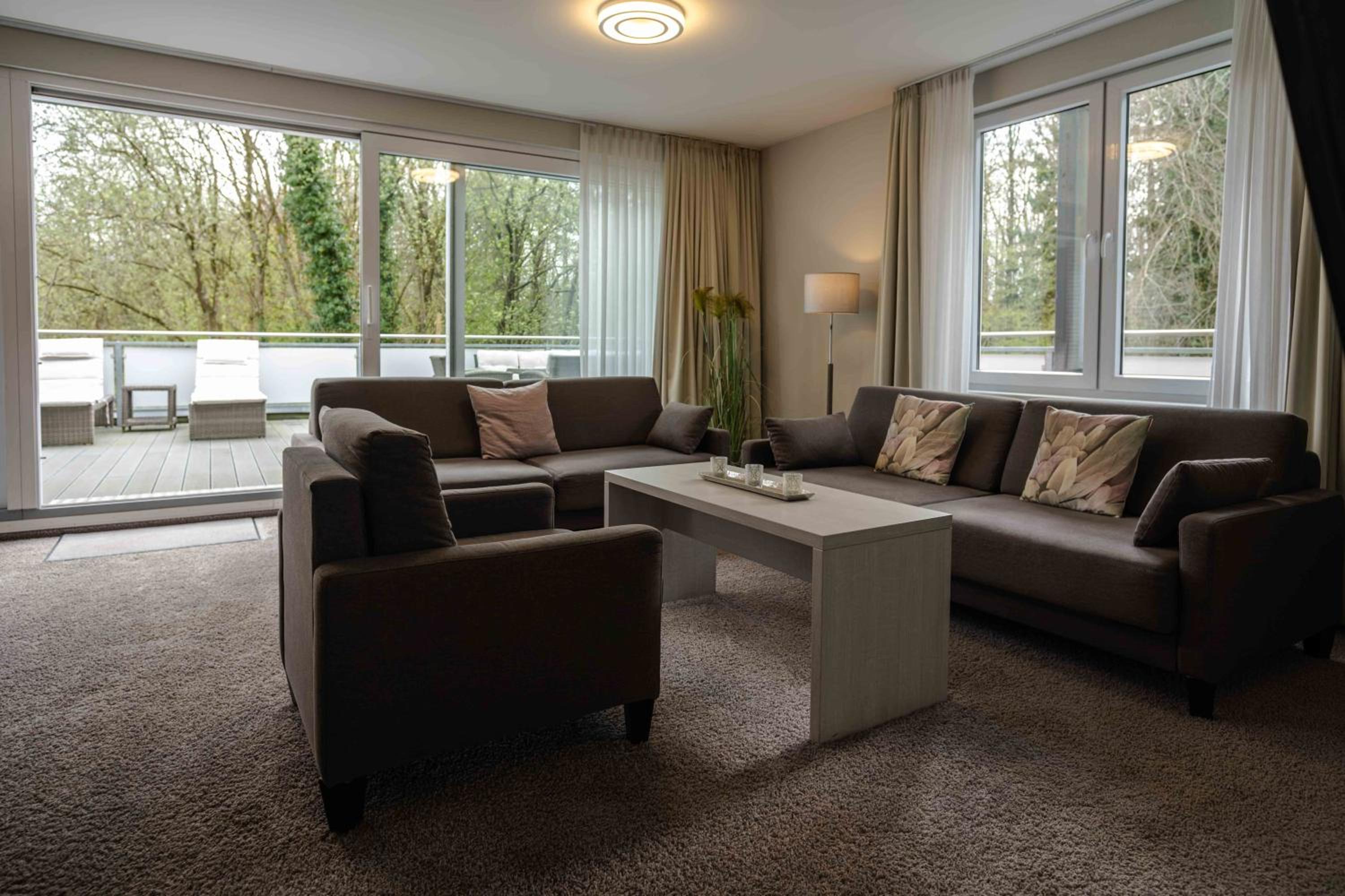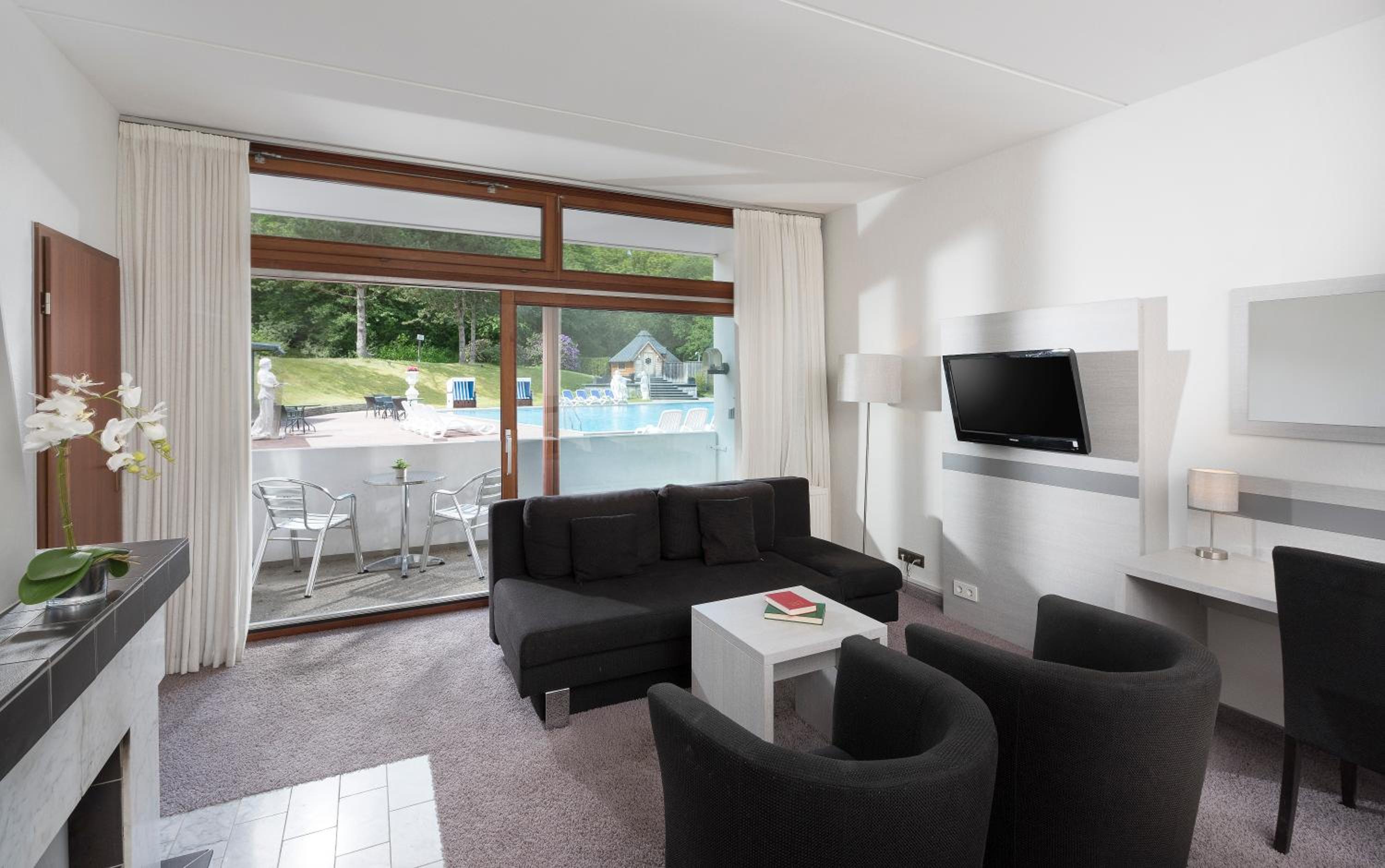 Guests can indulge in the modern spa area for free, featuring a hot tub, indoor and outdoor saunas, massage and beauty salon, and a fitness area. The heated indoor and outdoor pool ensures year-round enjoyment, surrounded by a large sunbathing area.
