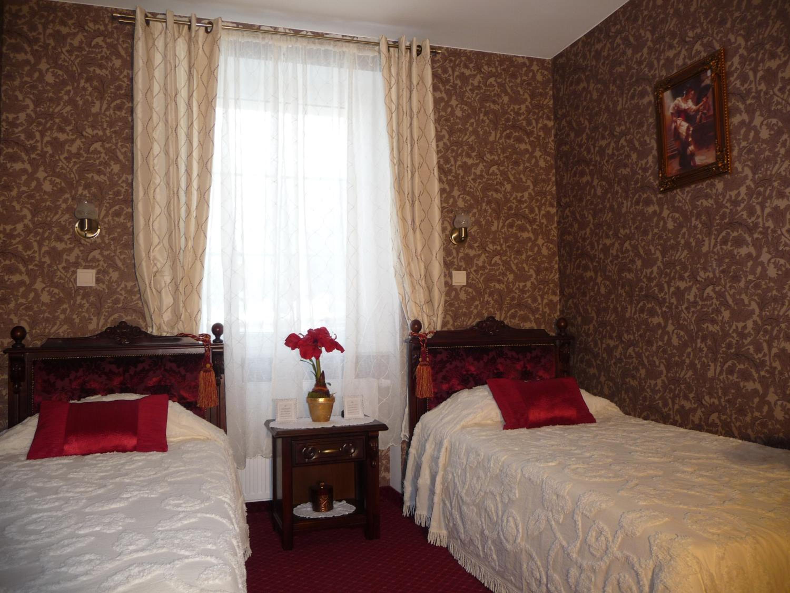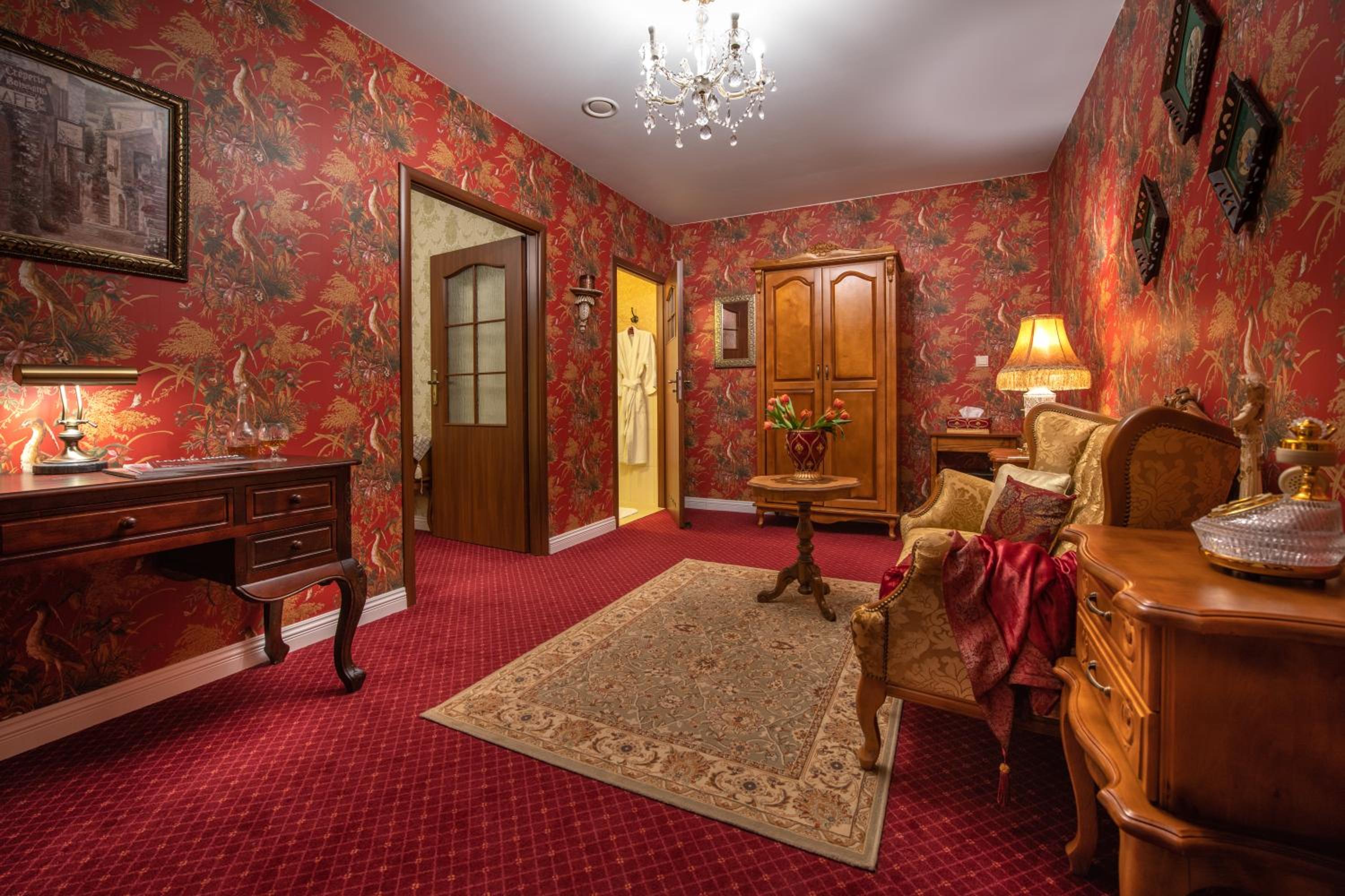 Rezydencja Grawert Boutique & Spa offers elegantly decorated Victorian-style rooms in a historic building from 1815. Each room features exclusive hand-made wallpapers and carved wooden furniture, providing a unique and luxurious experience.