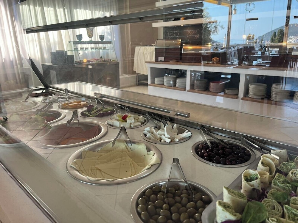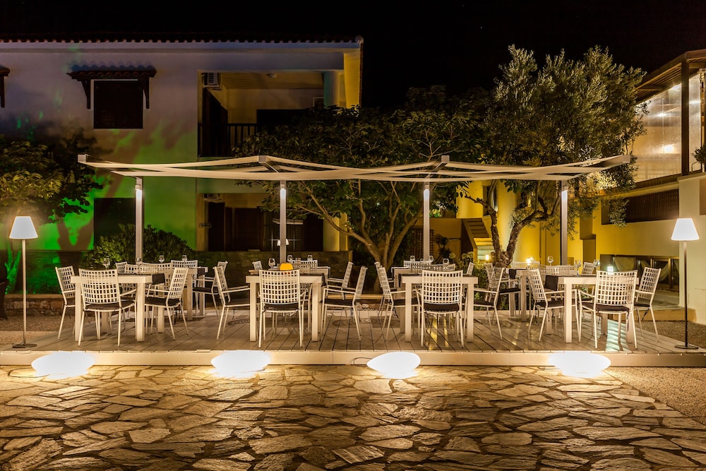 Located just outside the hubbub of Skopelos Town with lovely staff that do all they can to look after guests. Shuttle bus/taxi/walk to the restaurants and port make it easy to enjoy the town. Pools are clean. Cleaners are conscientious. Special mention - Maria at Reception is adept at getting things sorted. Food: Greek with local ingredients/vegetarian options/kids menu/room service menu covers the usual things such as pasta/pizza/club sandwiches. An effort is made for variety in the buffet breakfasts and dinners. See picture for inside of the lovely little church in the grounds. Can heartily recommend this hotel.