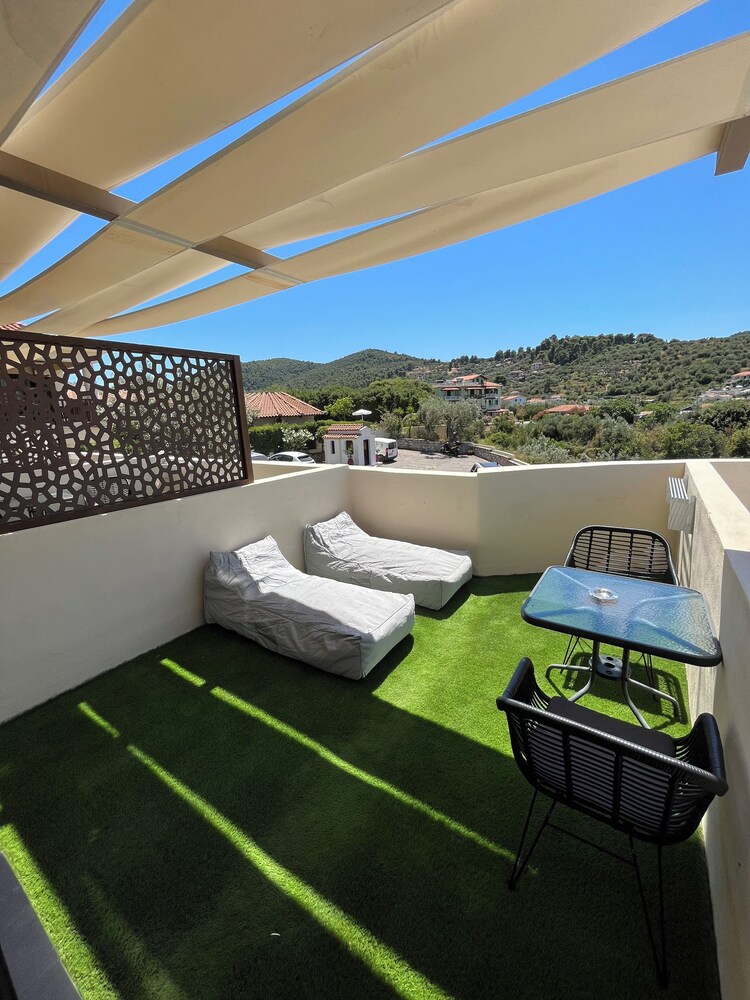 The staff is very kind and welcoming, especially Georgia and the manager. The location is at a walking distance from the city. Very calm with a beautiful view and family friendly. Nice area to stay for visiting Skopelos.
