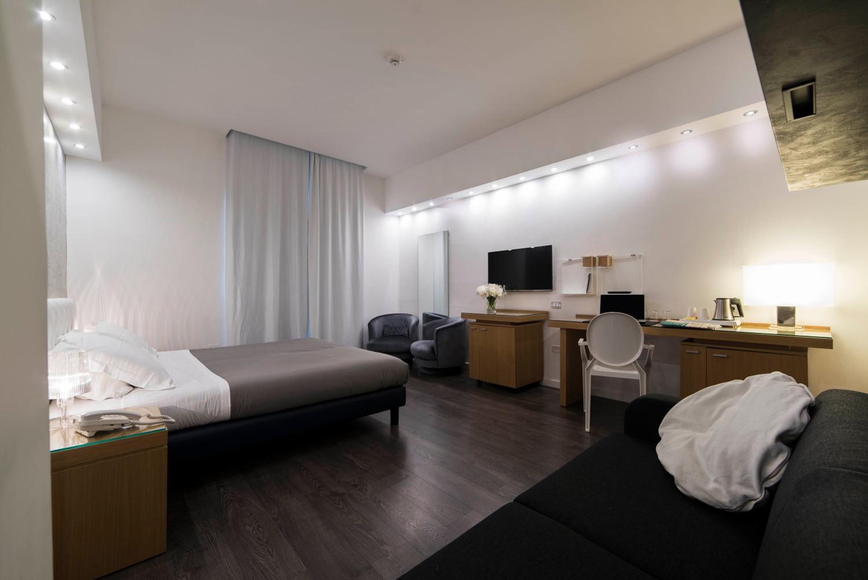 Experience a blend of style and comfort in our modern rooms featuring parquet floors, LCD TVs, desks, and minibars. Relax in the convenience of your private bathroom after a day of exploration in Salerno.
