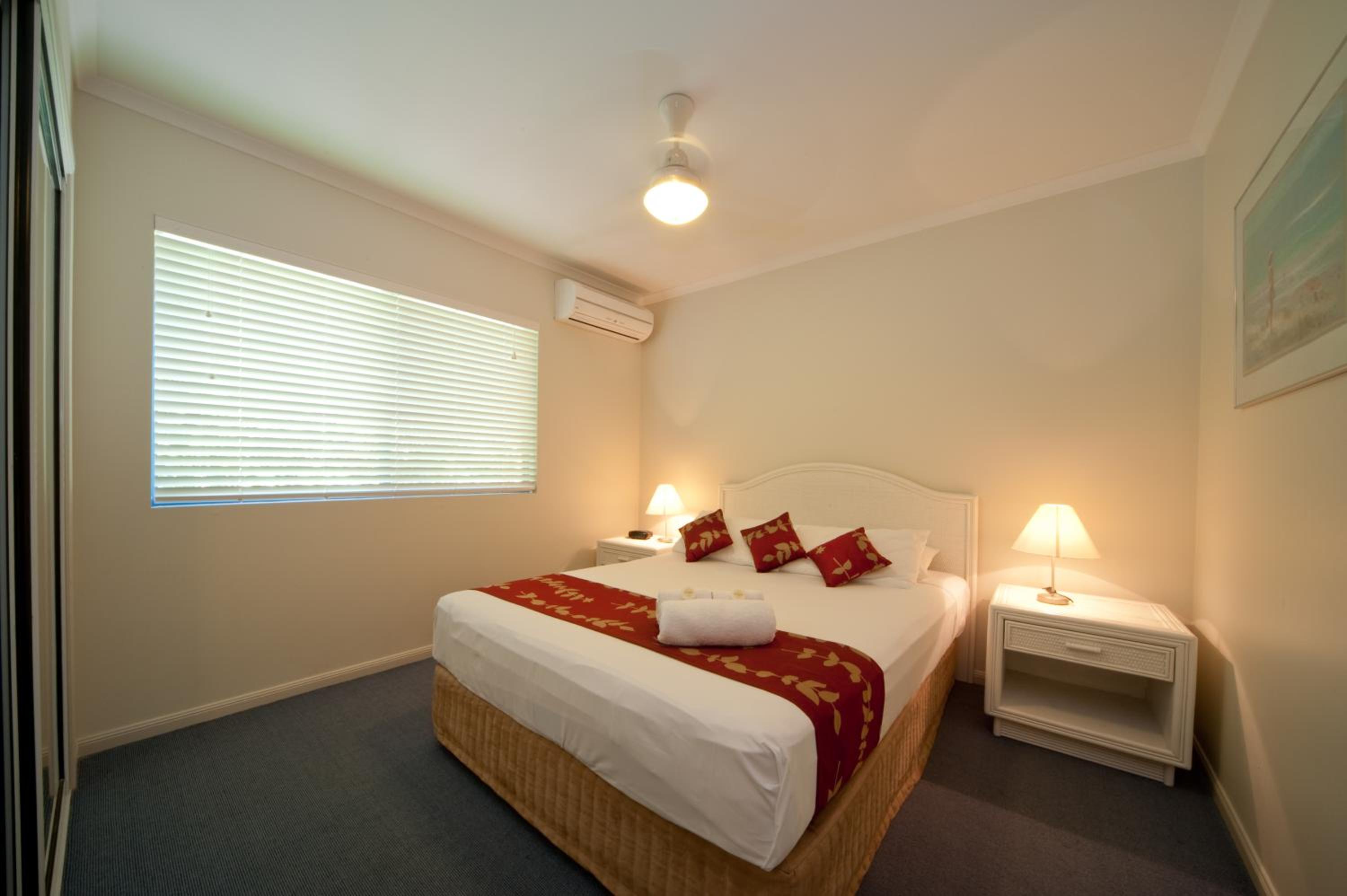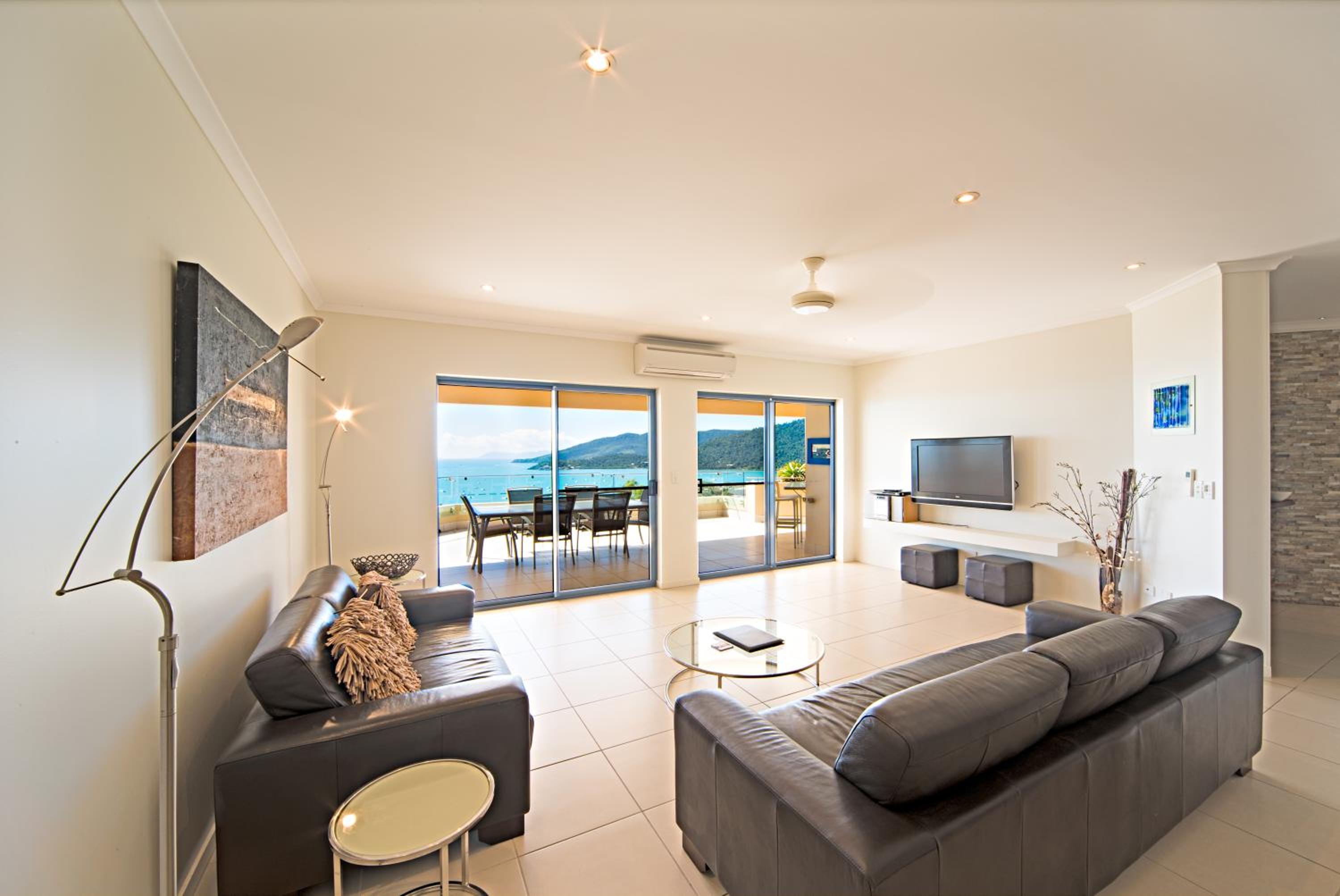 The cream-colored, air-conditioned apartments feature fully equipped kitchens, spacious living areas, and proximity to Airlie Beach, Abel Point Marina, and Shute Harbour.