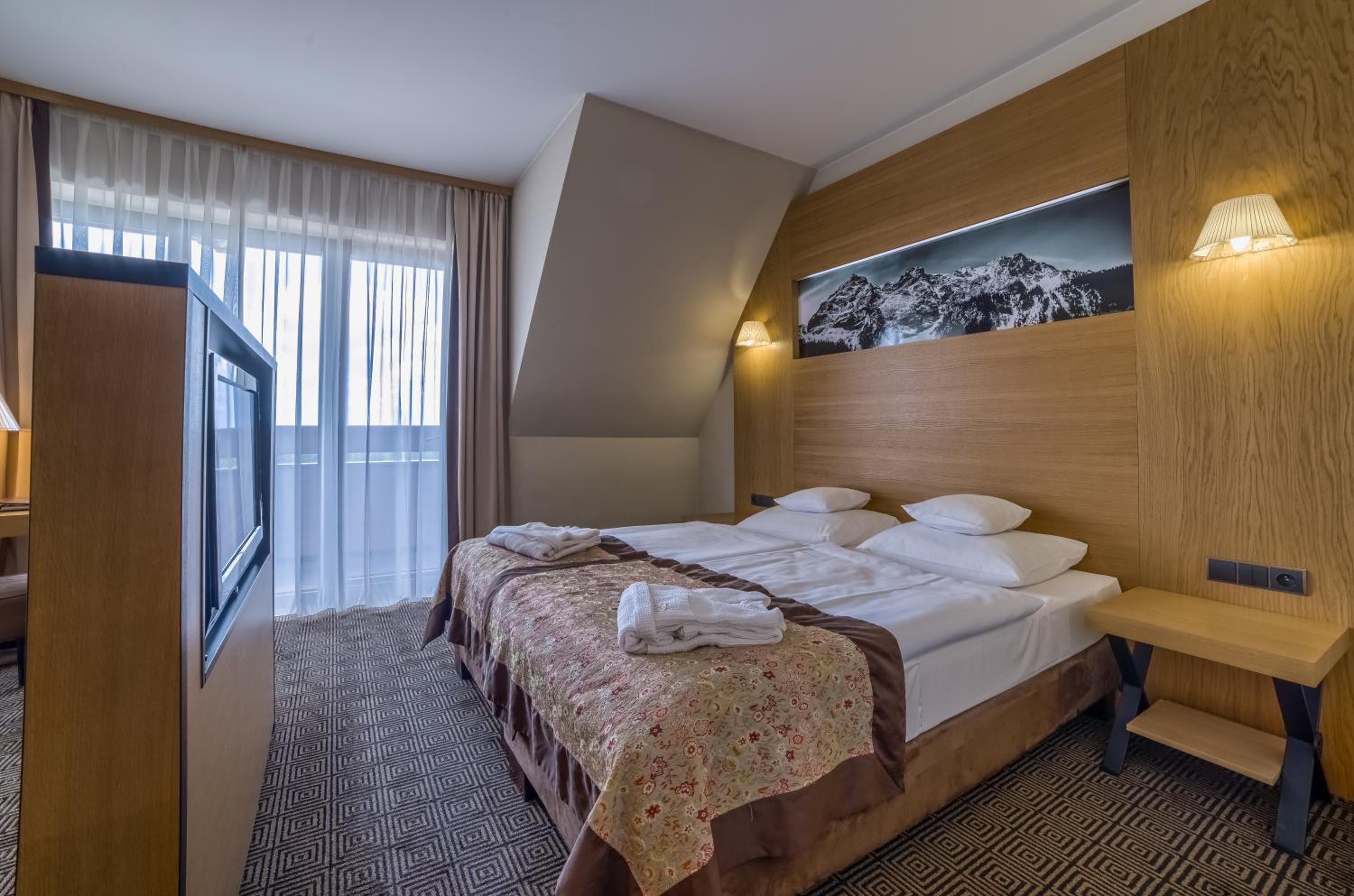 Grand Nosalowy Dwór, nestled at the base of Nosal Mountain, offers elegant rooms and apartments with modern amenities like flat-screen TVs and free Wi-Fi. The cozy wooden furniture and warm colors create a welcoming atmosphere for guests to relax in comfort.