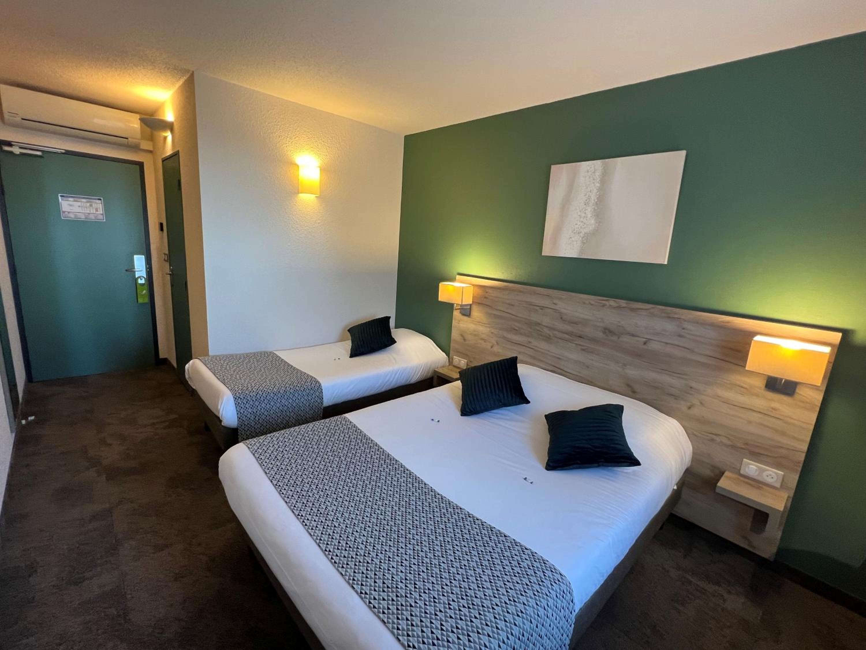 Initial stay was 1 night but we extended it to a week. Room was lovely and clean, perfect for our needs, double bed was so comfortable, we didnt wake up once in the night. Small, clean bathroom, it didnt have a bath but it had a shower which was easy to use. TV had a good selection of french channels and we were able to watch BBC News. Continental breakfast was perfect and more than met our needs, it really set us up for the day- pastries were so lovely, toast with cheese and ham, selection of yoghurts, cereals, fruit, fruit juices, madelines, tea and coffee. Now we are back in england, we miss the breakfast! I normally dont drink tea in europe because the milk is very different but I had a lovely english breakfast tea each morning with a drop of milk and my husband enjoyed his cappuccino. Judith and Laurent were amazing, so friendly and helpful and their english was really good. We are more than grateful for all their help. Petrol station (card payment only) conveniently situated opposite hotel. Restaurants and Supermarket nearby, we bought something microwavable and used the microwave in the hotel. It is a good base if you have a car and want to travel around and see the sights.
