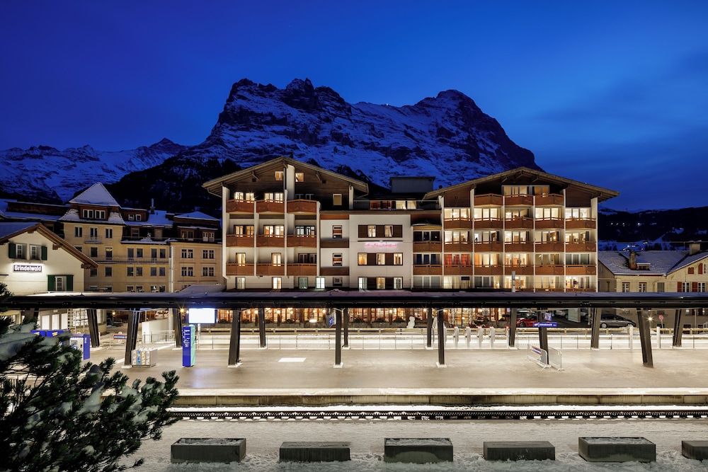 We're staying here his week, with friends and family (including a 12 & 17 yrs old). Really impressed with the hotel, starting with location, which is basically on the train station platform at Grindelwald. So about 30 steps from the hotel and you're on the train to take you up to the Kleine Scheidegg area for skiing.